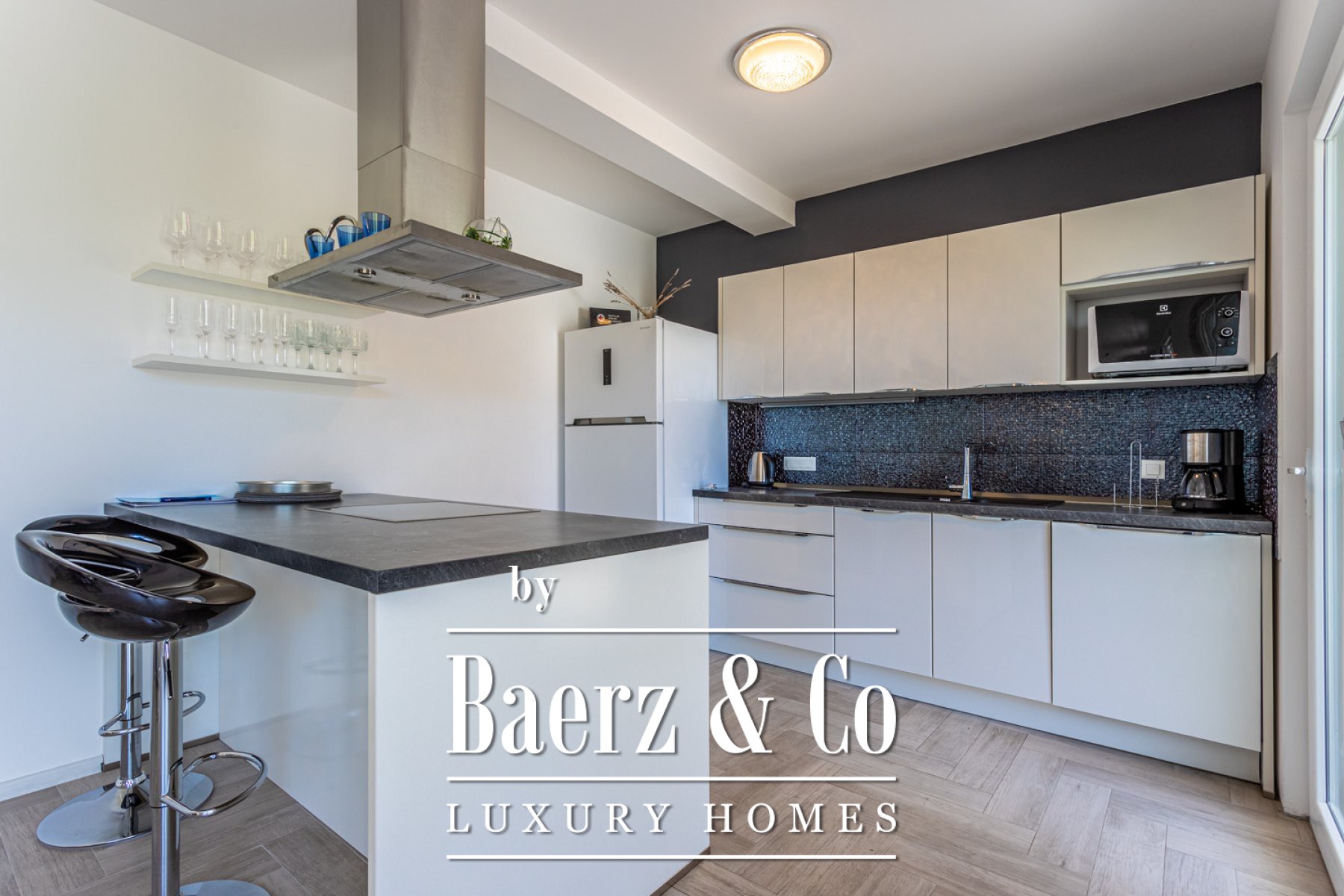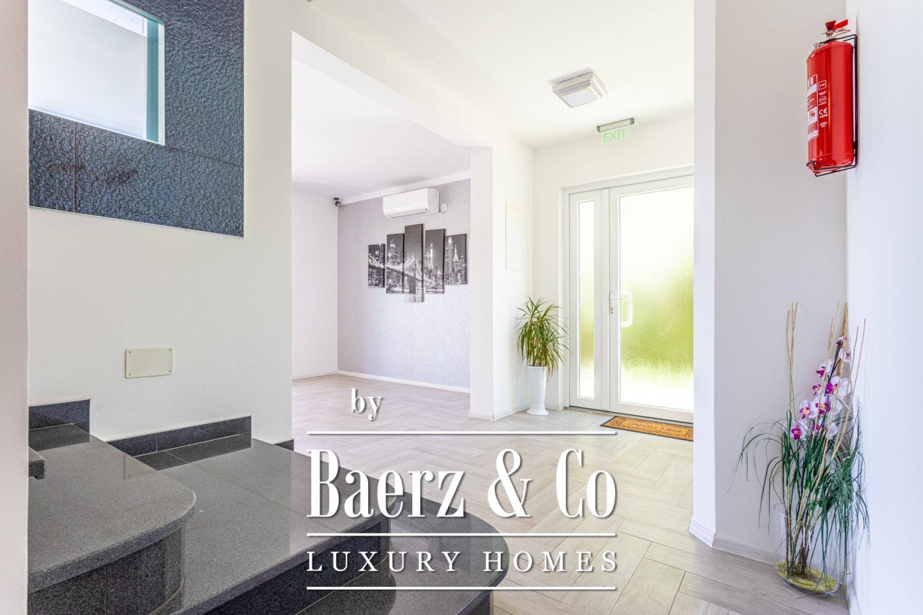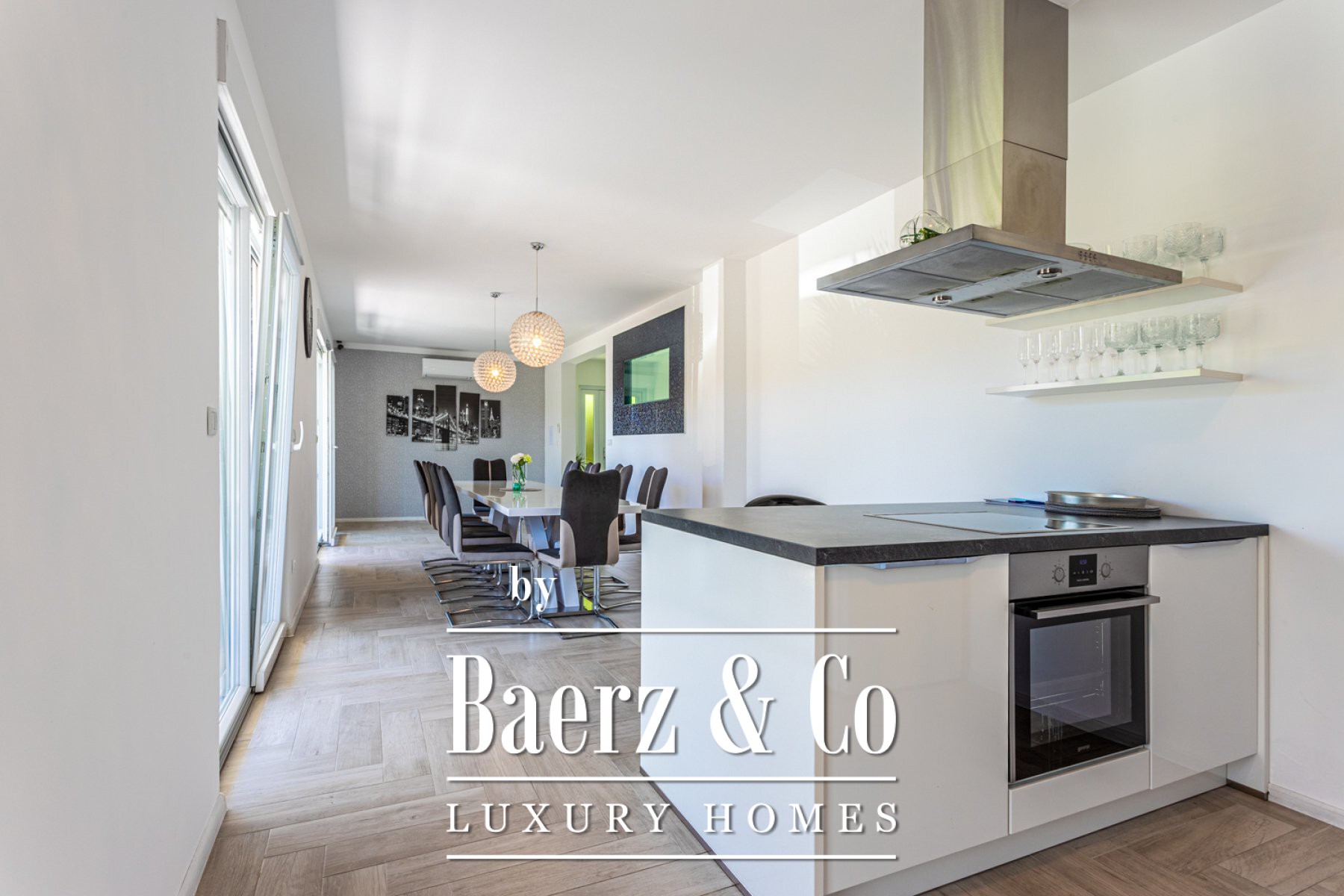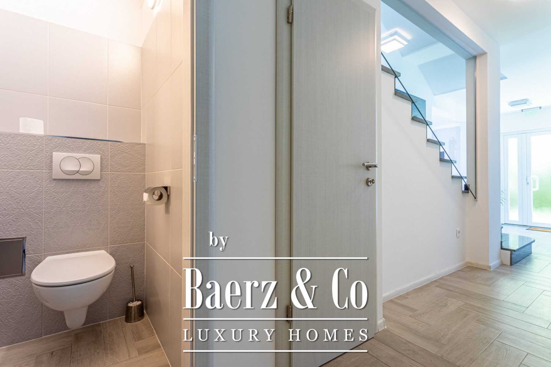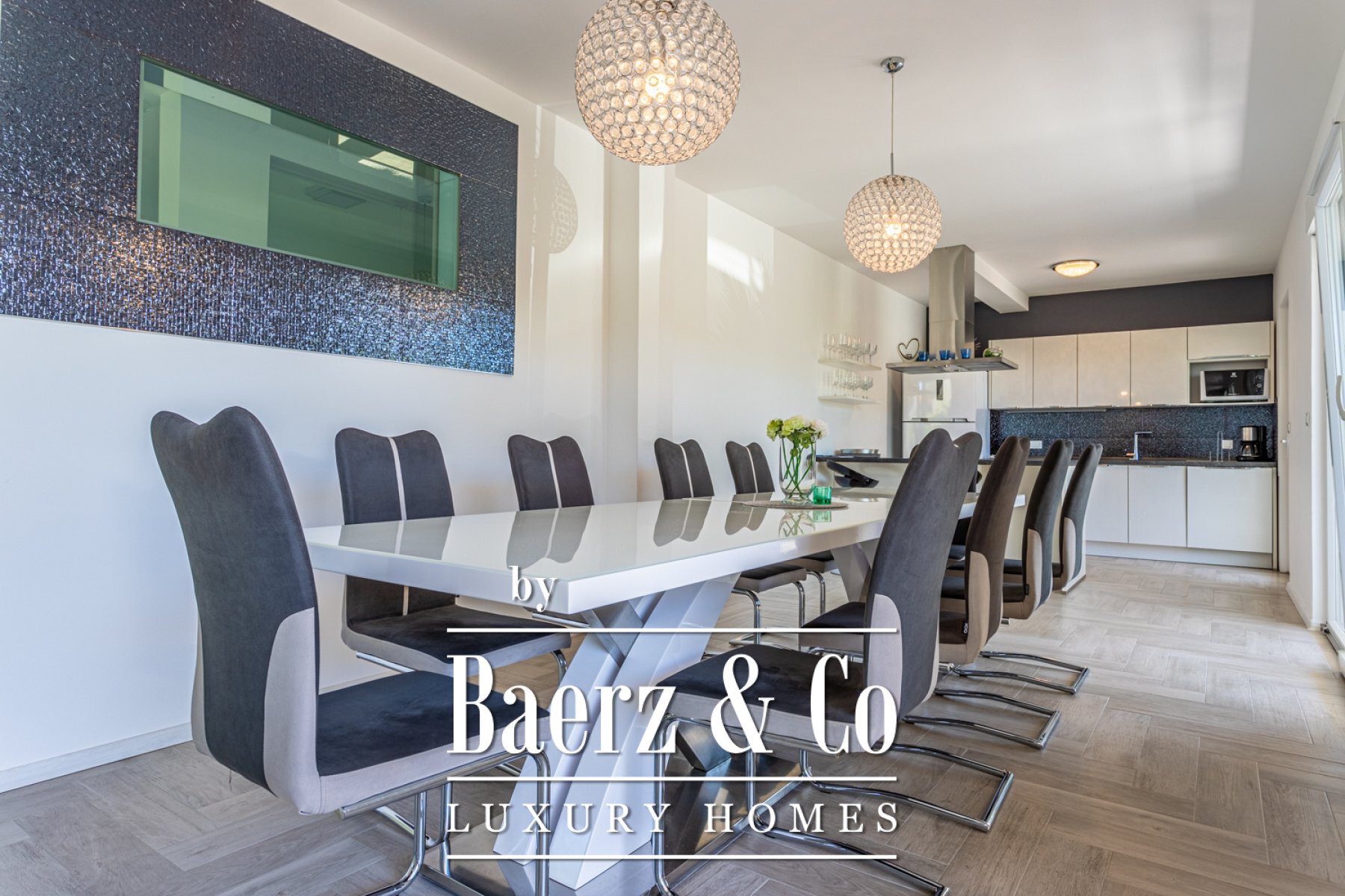 with landscaping and parking for several vehicles. The first floor consists of a living room with access to a loggia with a beautiful sea view and three en suite bedrooms. The second floor is designed as a recreation area that includes two toilets, sauna, playroom (billiards, table football), summer kitchen and a spacious terrace with jacuzzi, shower, sun deck and overflow pool overlooking the sea.