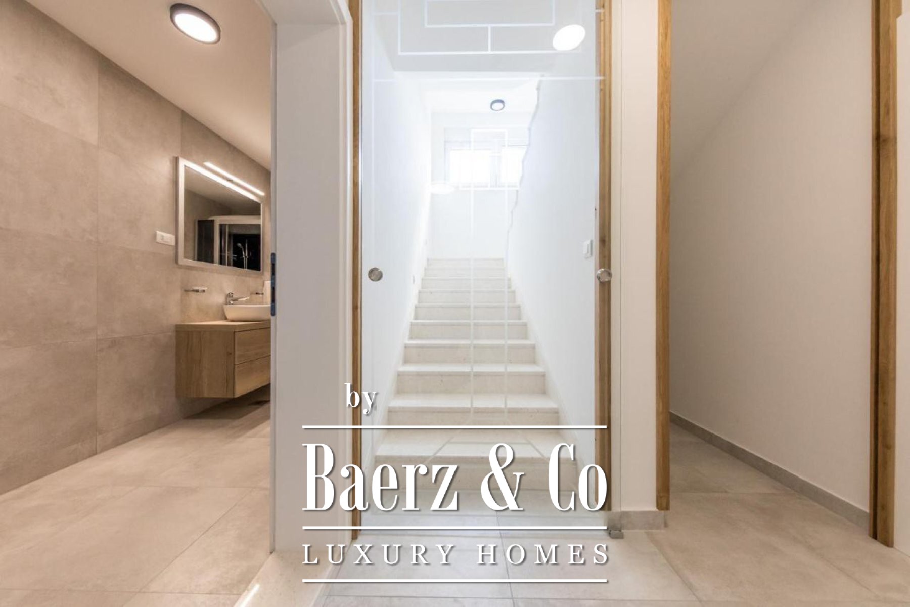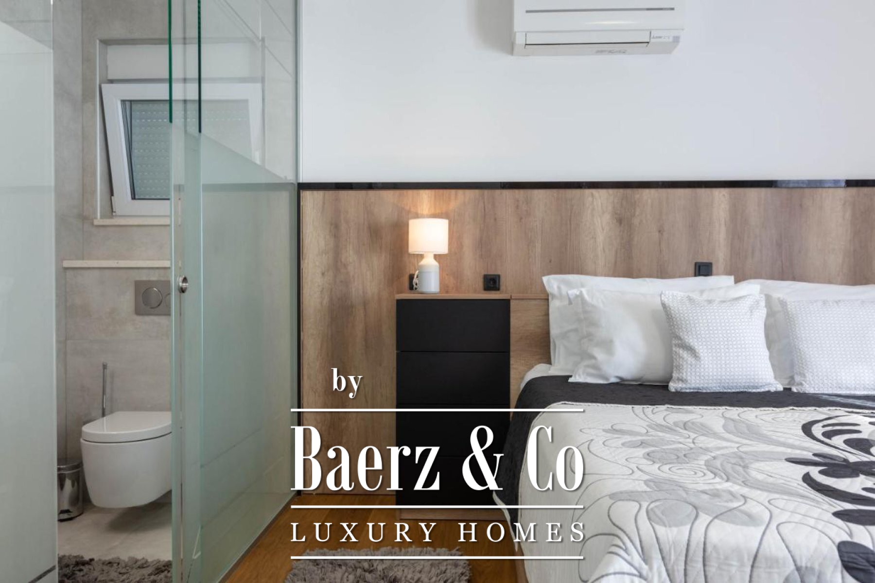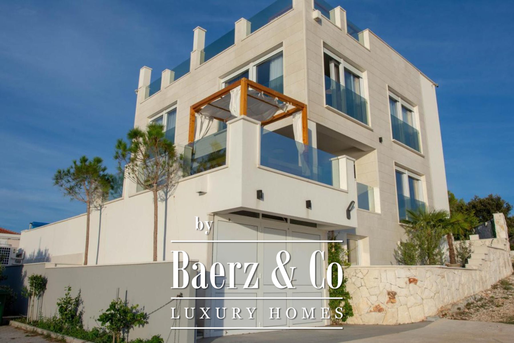 The newly built luxury villa near Rogoznica spreads over four floors and has a living area of 380 m2, and is about fifty meters from the sea. The ground floor consists of two parts. In the first part there is a garage, gym, engine room, bathroom, living room and kitchen. In the second part there is a bathroom, kitchen and living room with access to two covered terraces with a beautiful open sea view. On the ground floor there is an outdoor parking and a swimming pool. The