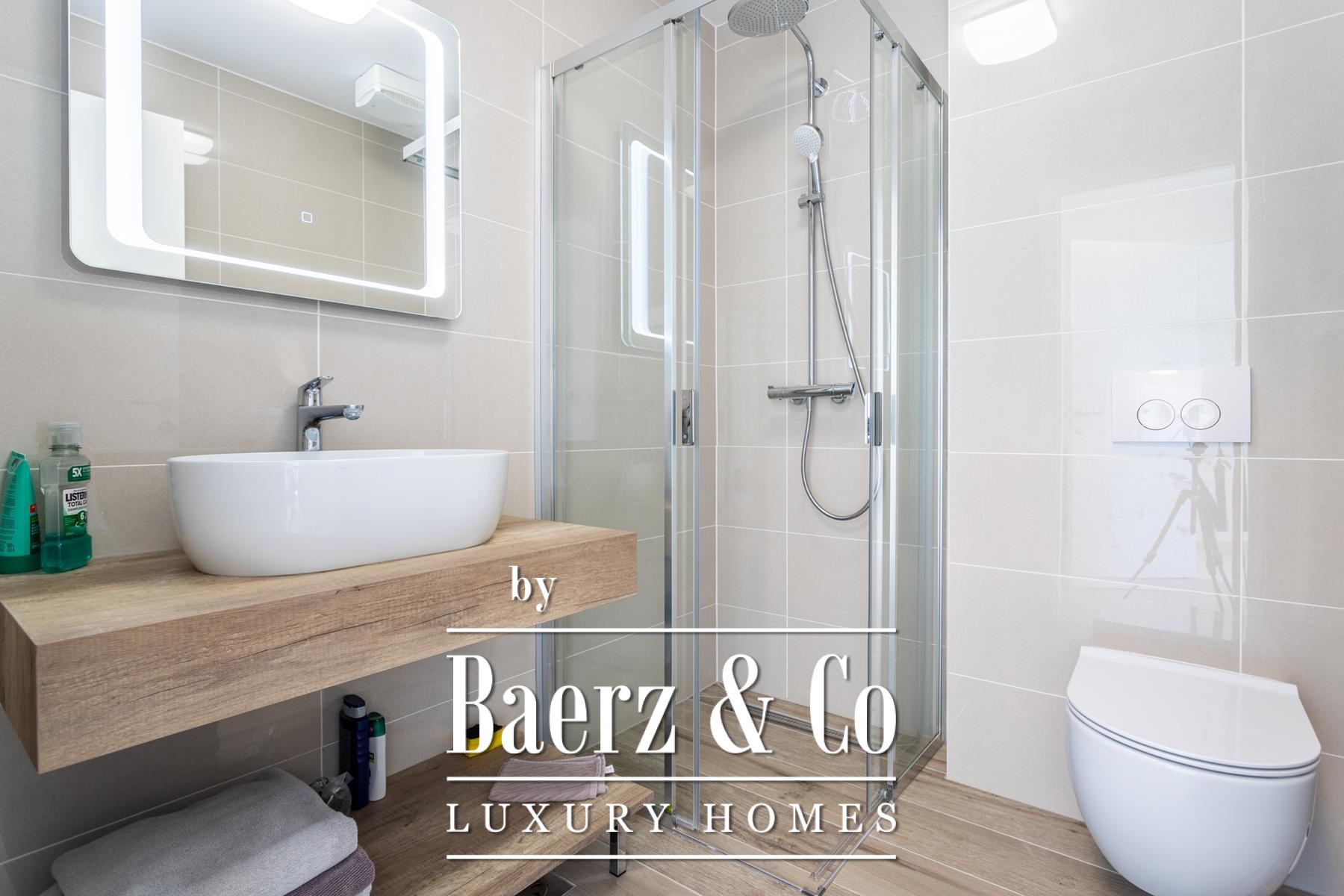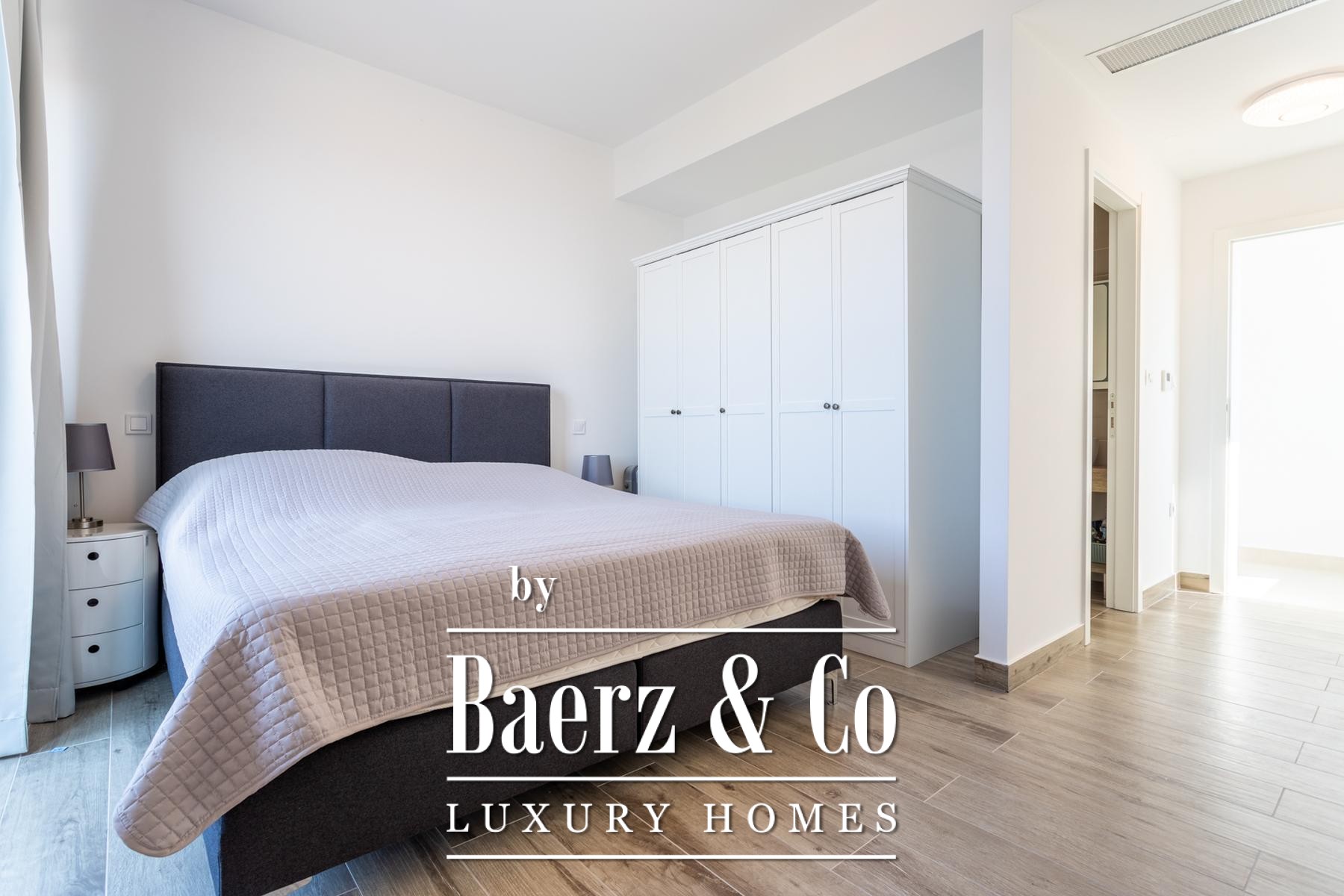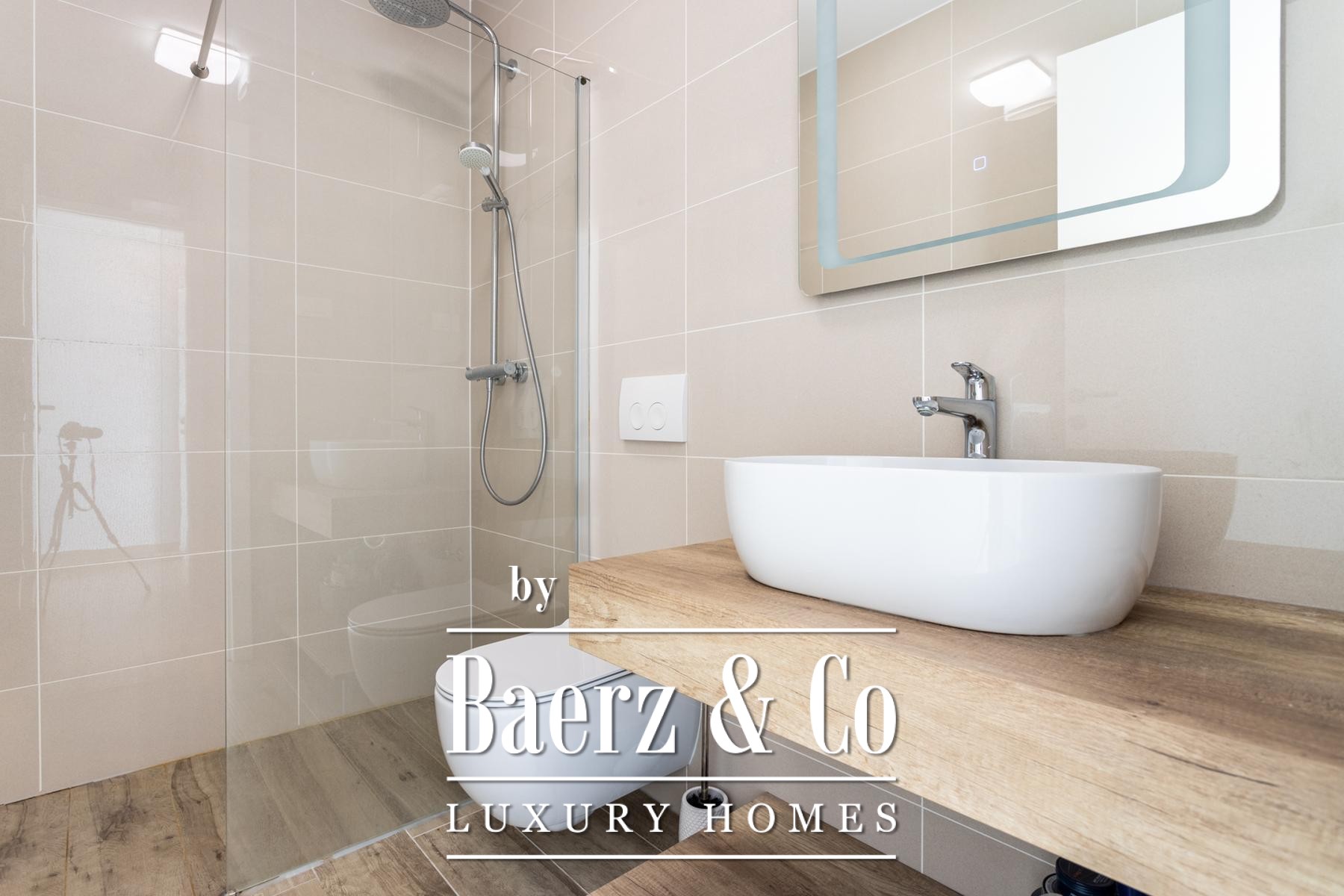The carefully considered layout includes a multifunctional basement with a bathroom, wardrobe, and direct access to a 40 m² pool. On the ground floor, a living area, bedroom, kitchen, dining room, and terrace foster easy indoor–outdoor living. The first floor hosts three bedrooms, each with an en suite and access to a private terrace. In total, six bedrooms and six bathrooms ensure both privacy and hospitality.