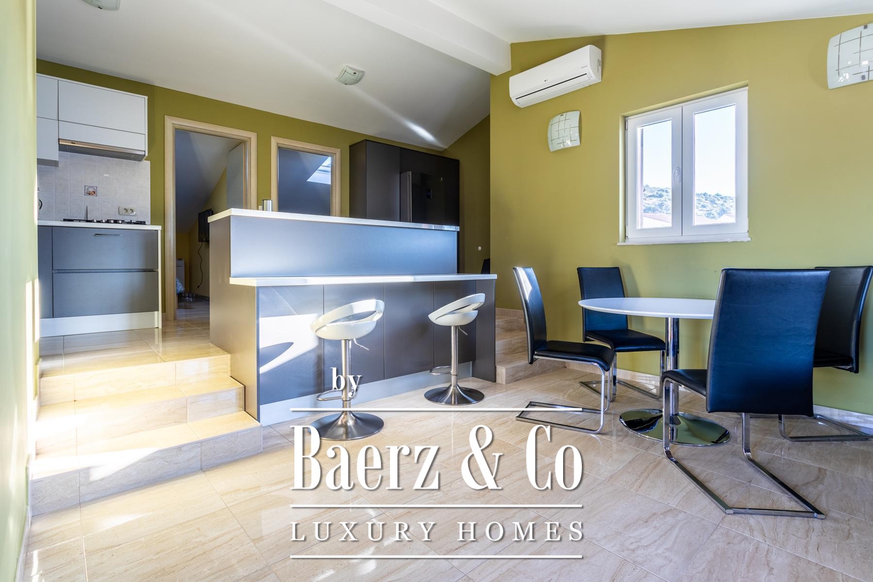 The grounds are proportioned for ease, offering parking for at least four vehicles, ensuring tranquility for both residents and guests. This waterfront townhouse for sale in Rogoznica balances seclusion and inherent access to the Adriatic, appealing to international buyers who value a mix of provenance, understated luxury, and a true sense of place.