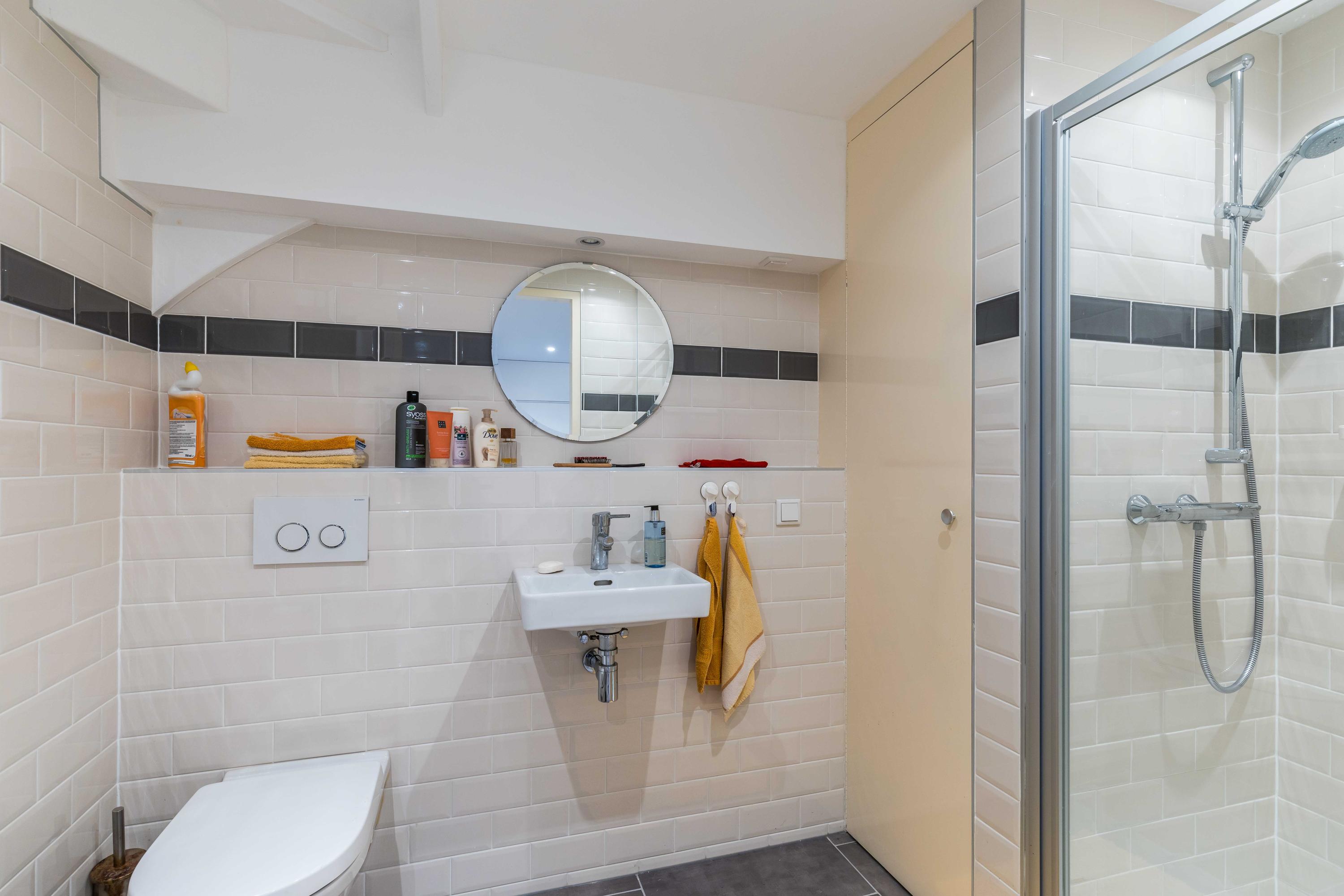 2nd floor: landing with also a separate toilet, bedroom at the rear with dormer window and wardrobe wall where the central heating is also located, bedroom at the front with dormer window, 2nd bathroom with bath with shower, washbasin and space for a washing machine and dryer next to each other.