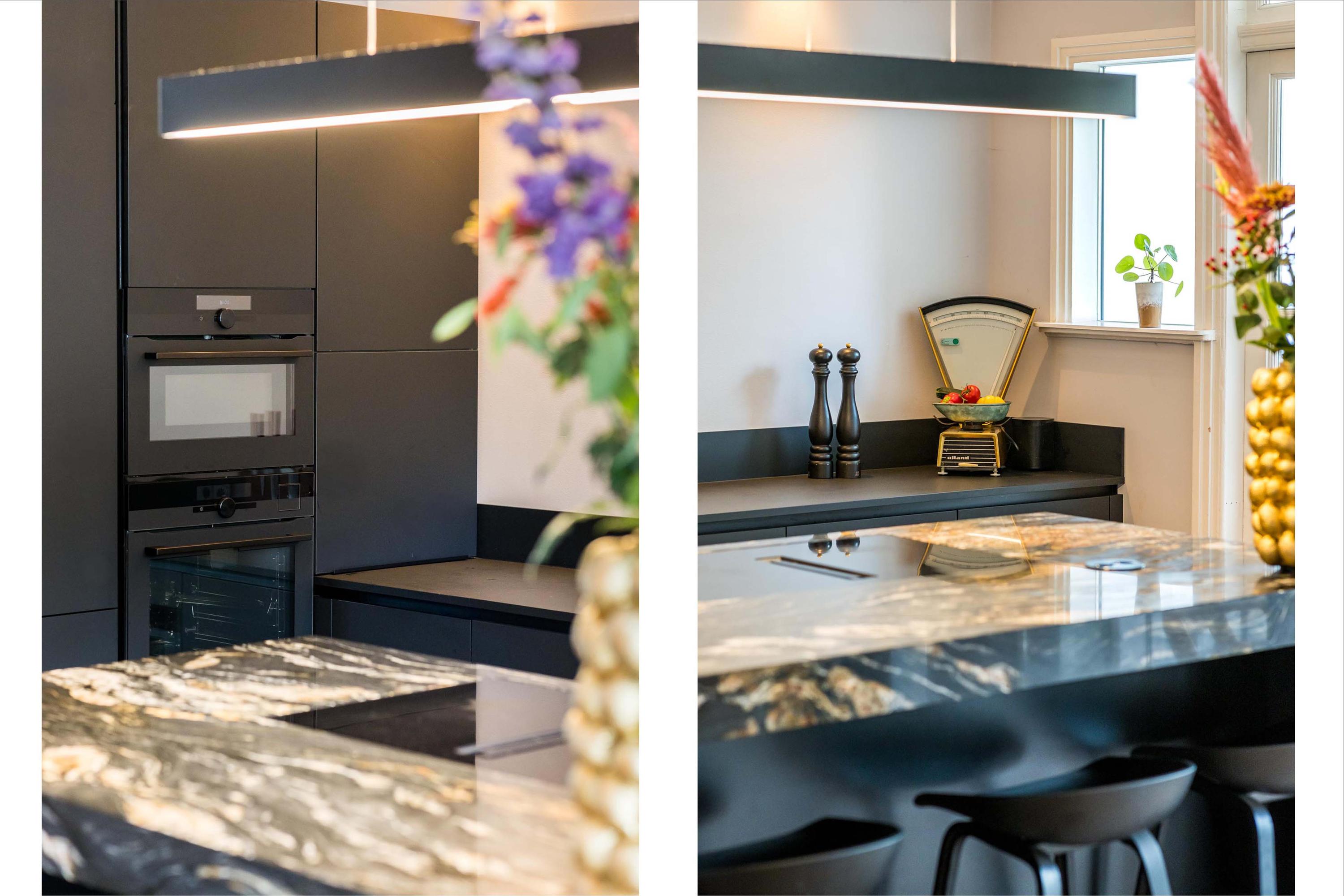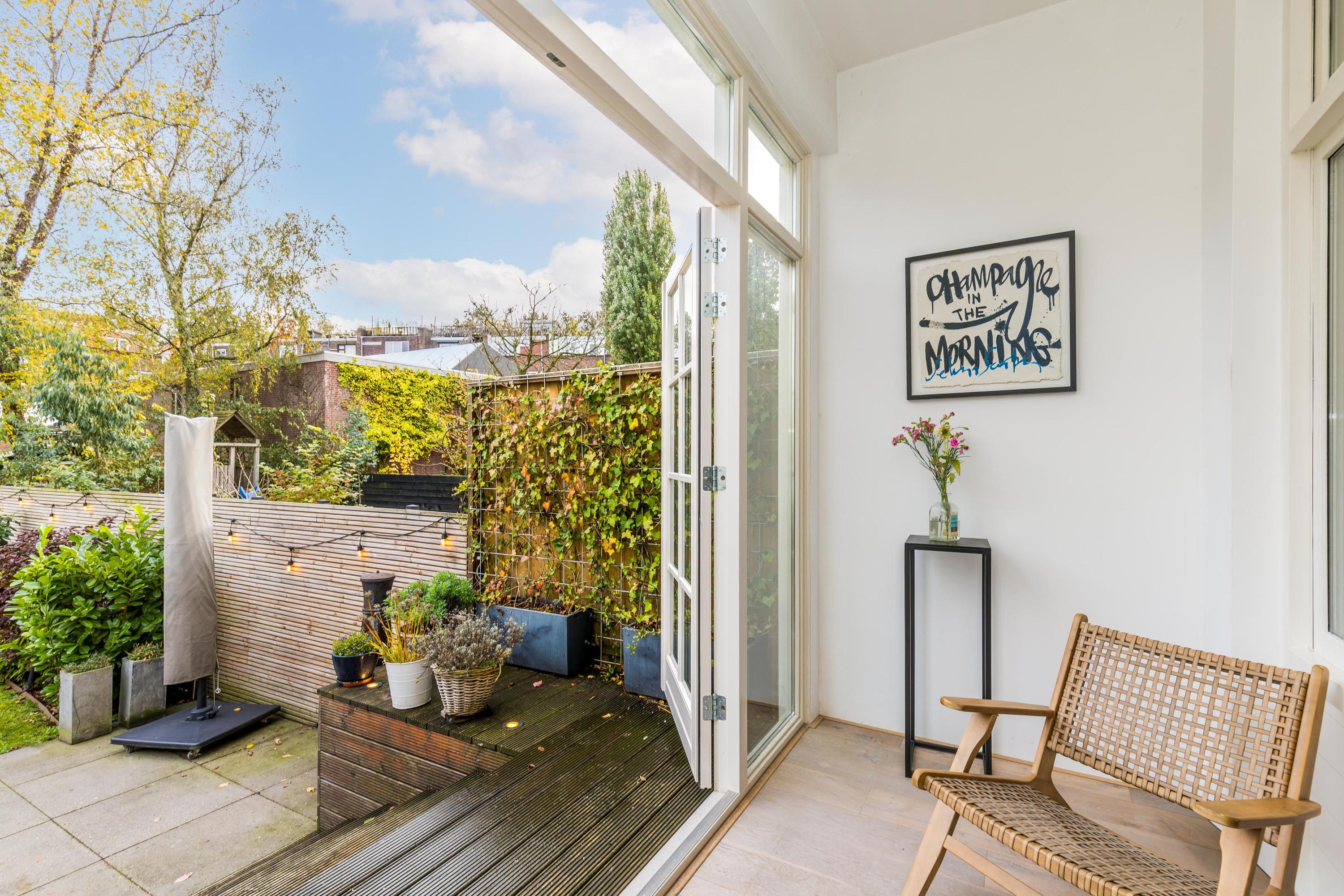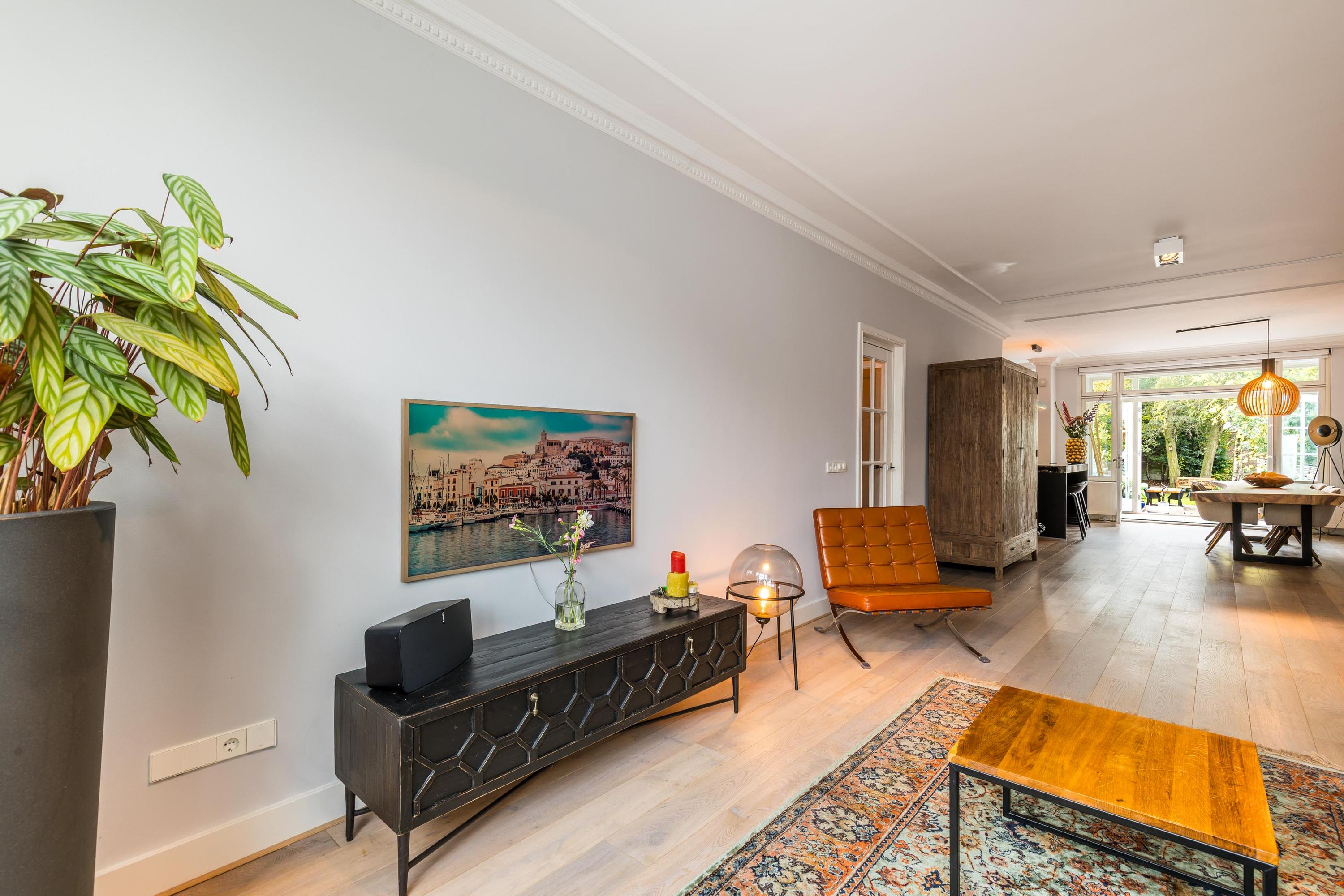 Representative entrance with high ceilings and original details. From the hallway, access to the modern guest toilet and the spacious living area with a beautiful oak floor. The open kitchen (renovated in 2022) forms the heart of the home and is equipped with a large cooking island, high-end built-in appliances including a steam oven and a (wine) climate cabinet. Adjacent is the bright conservatory with French doors opening onto the sunny rear garden, where indoor and outdoor living blend seamlessly.