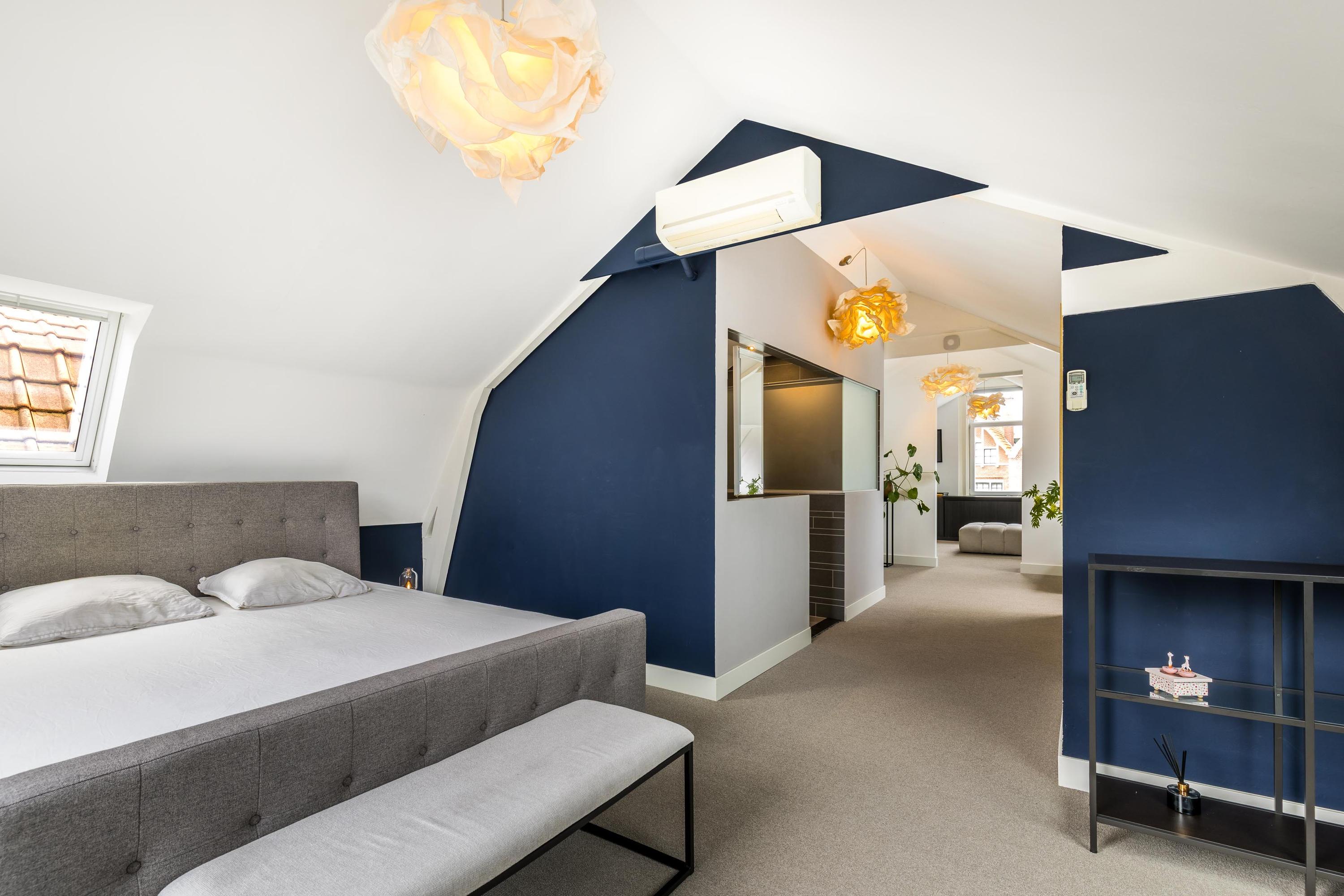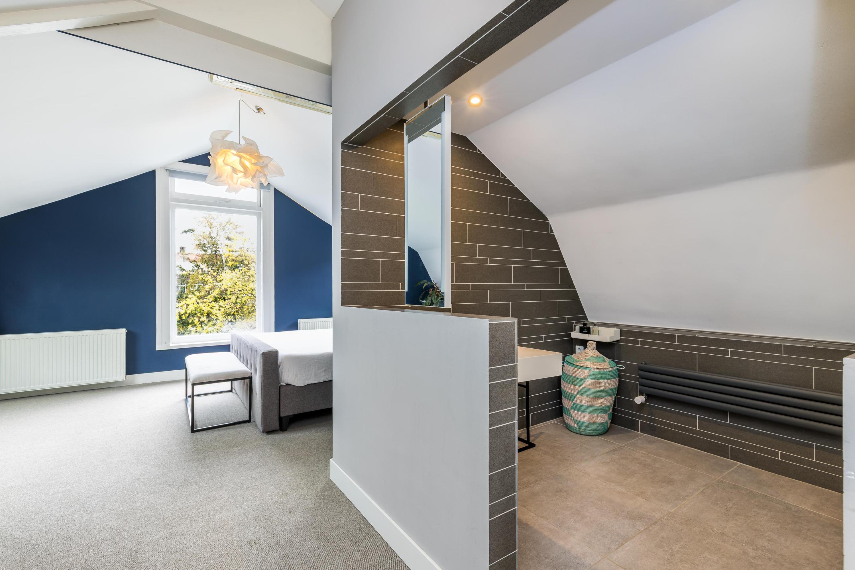 The attic floor is surprisingly spacious and currently offers one bedroom at the rear. The large room at the front has been converted into a generous walk-in closet but can easily be transformed into a very large second bedroom. The rear bedroom enjoys lovely, unobstructed garden views. There is also a second modern bathroom with a walk-in shower and washbasin, plus a practical laundry area with space for a washing machine and dryer.