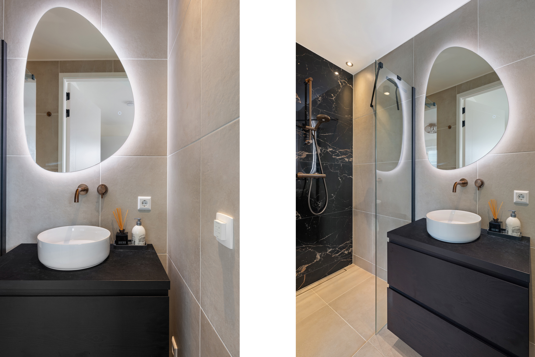The modern bathroom features a bathtub, walk-in shower, toilet, double washbasin, and a heated, illuminated mirror.