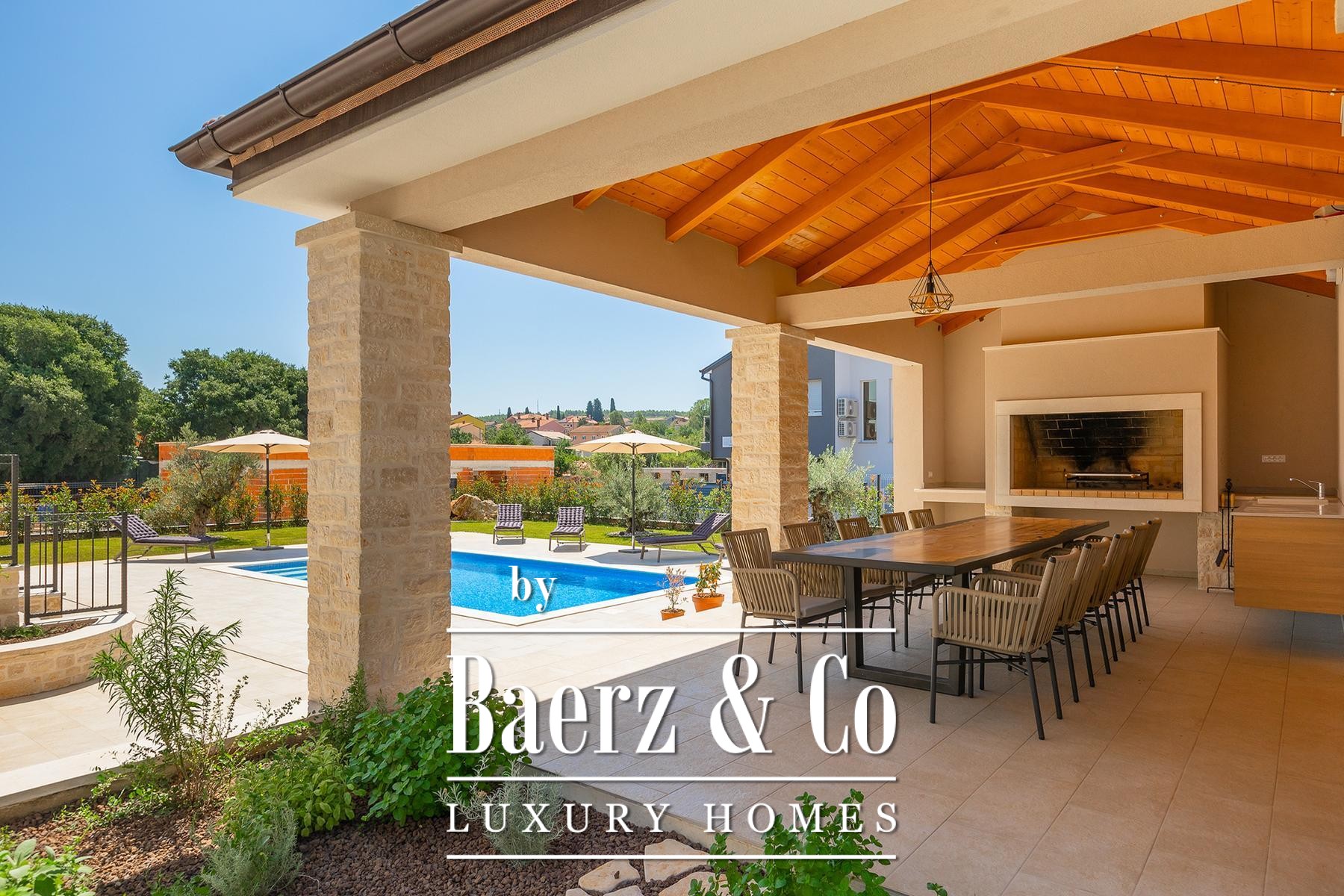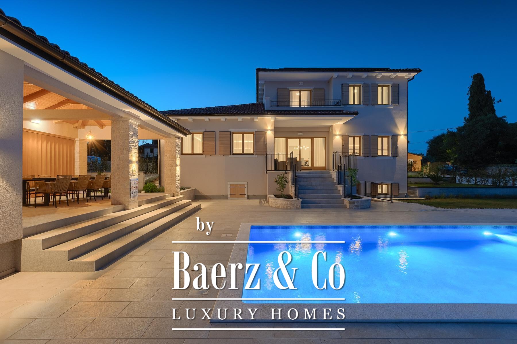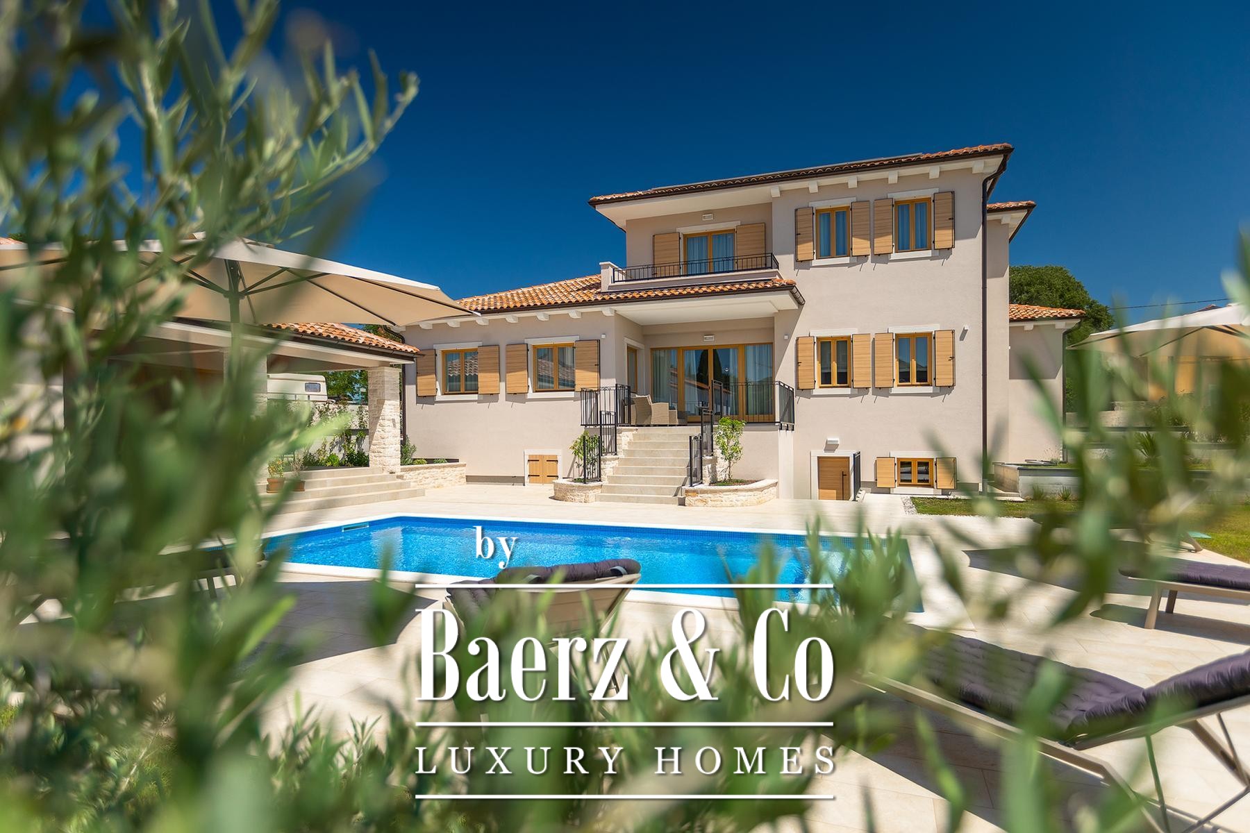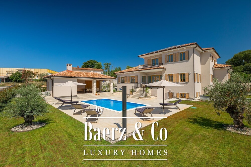 Villa Rovinj with pool and Mediterranean design is quietly situated on the west coast of Istria, close to the storied town of Rovinj. This property blends timeless regional style with contemporary comfort across 438 m² of interior space and a generous 1,208 m² plot, featuring east, south, and west orientations that draw natural light into every room.