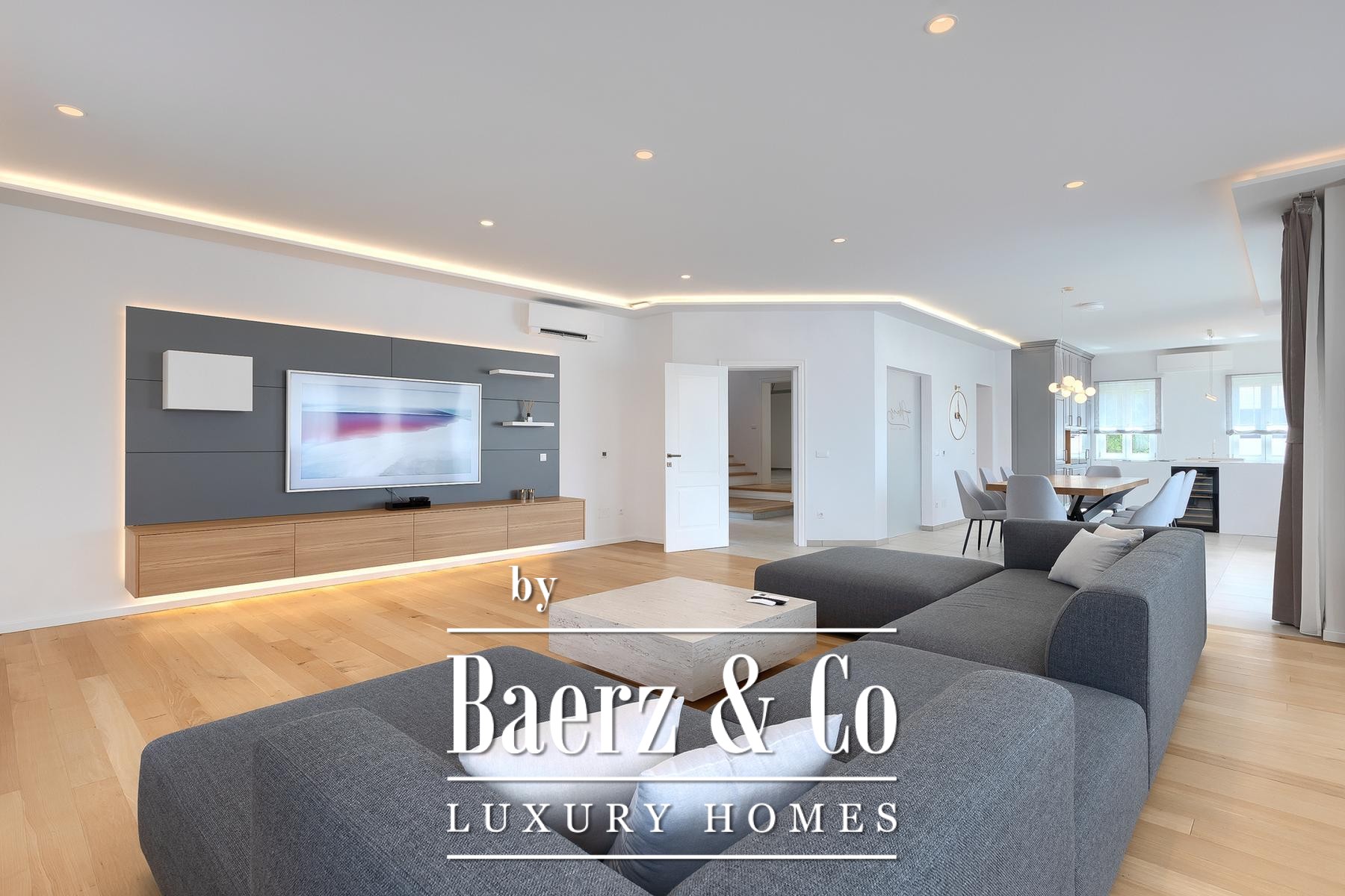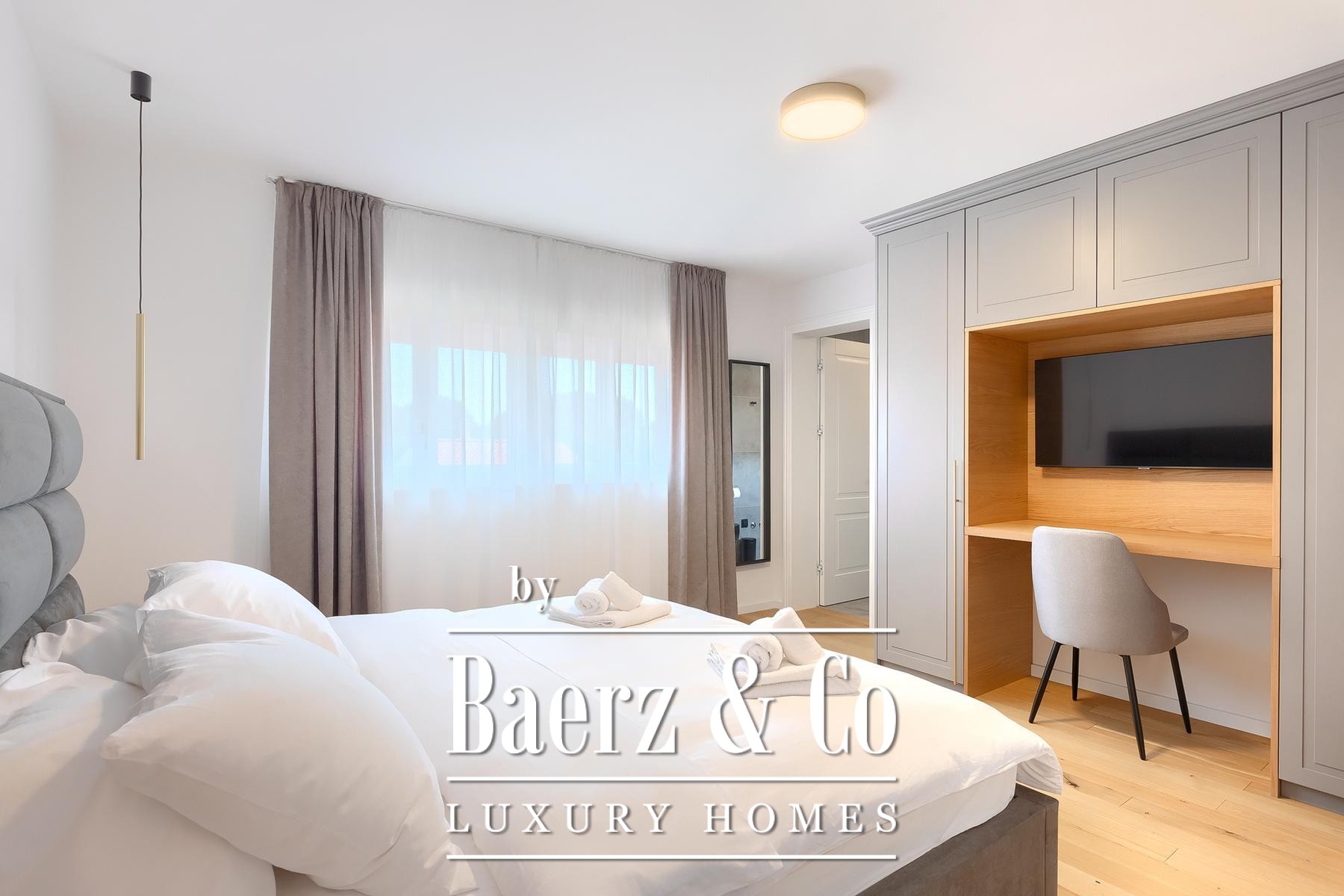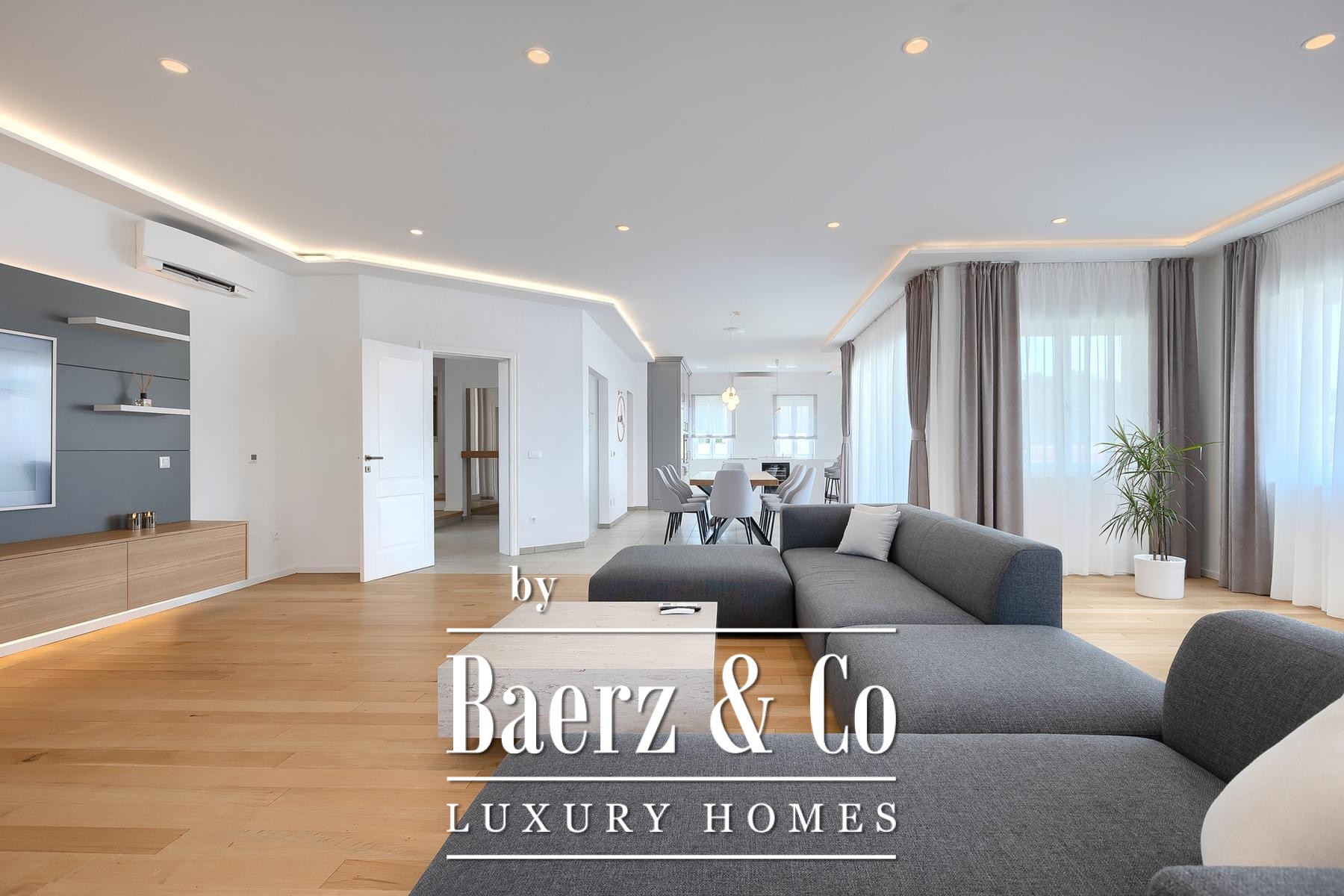 On the upper floor, three bedrooms each have dedicated bathrooms, while the master suite opens onto a balcony. Craft and materiality define every detail, from Slavonian oak carpentry with triple-glazed windows to custom-made furnishings and advanced climate control with underfloor heating and Daikin air conditioning.