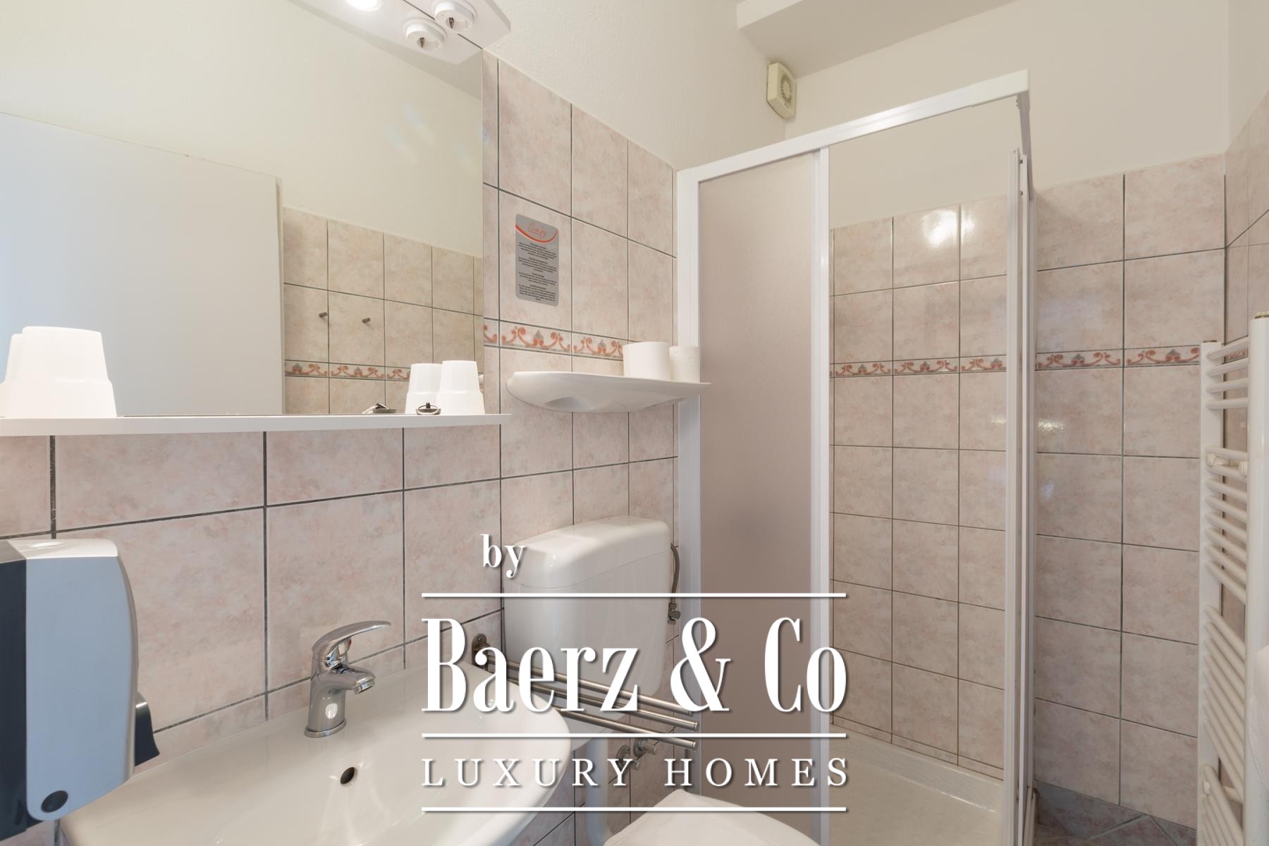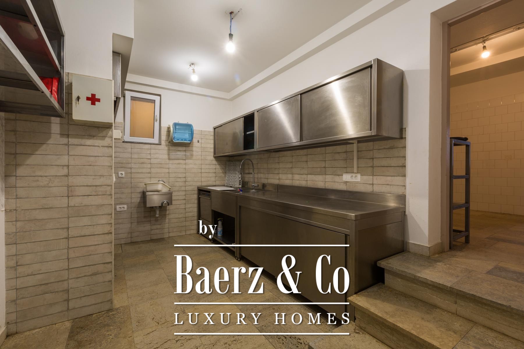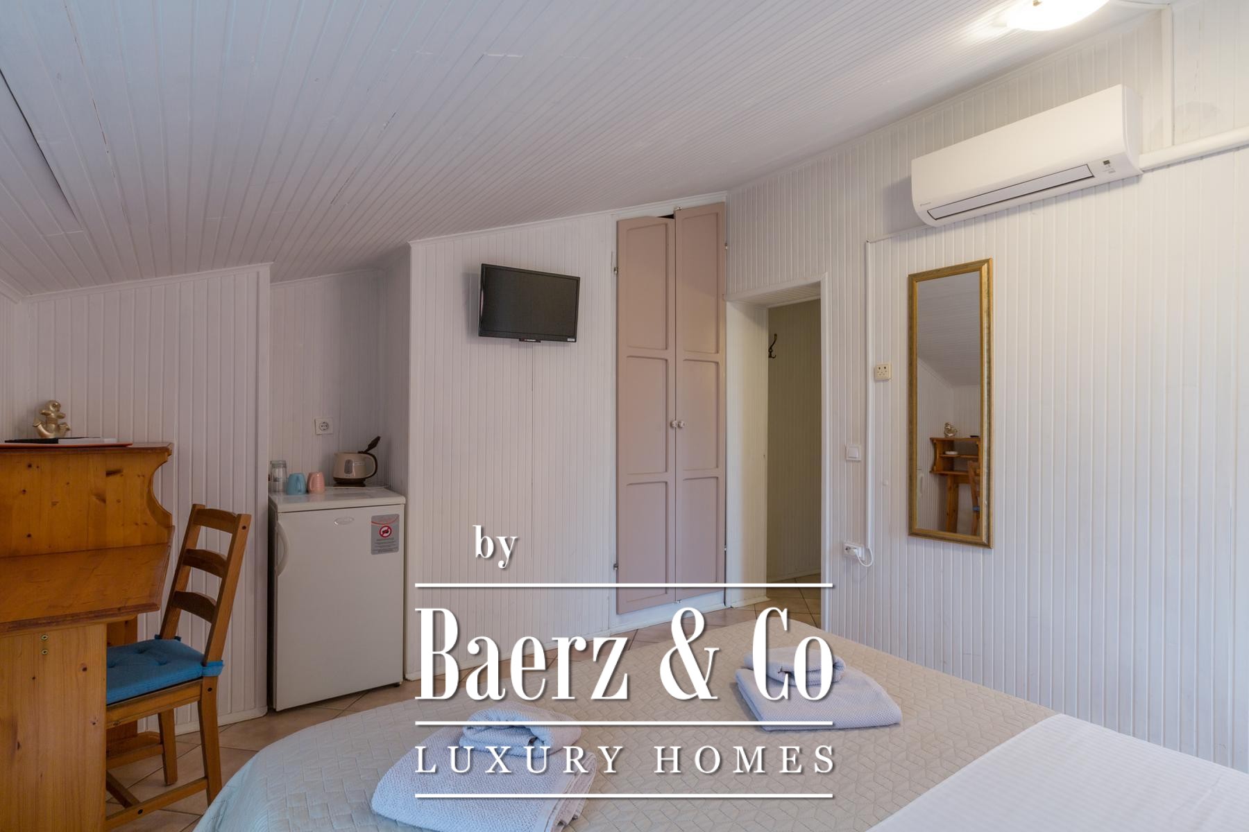 On the ground floor, two apartments offer two bedrooms each, along with an integrated living and dining space, kitchen, bathroom, and expansive terraces. Additionally, a studio apartment enhances flexibility for extended stays or staff accommodation. A dedicated restaurant, with garden and terrace, provides further opportunity, supported by separate guest and staff entrances, multiple storage rooms, and guest facilities.