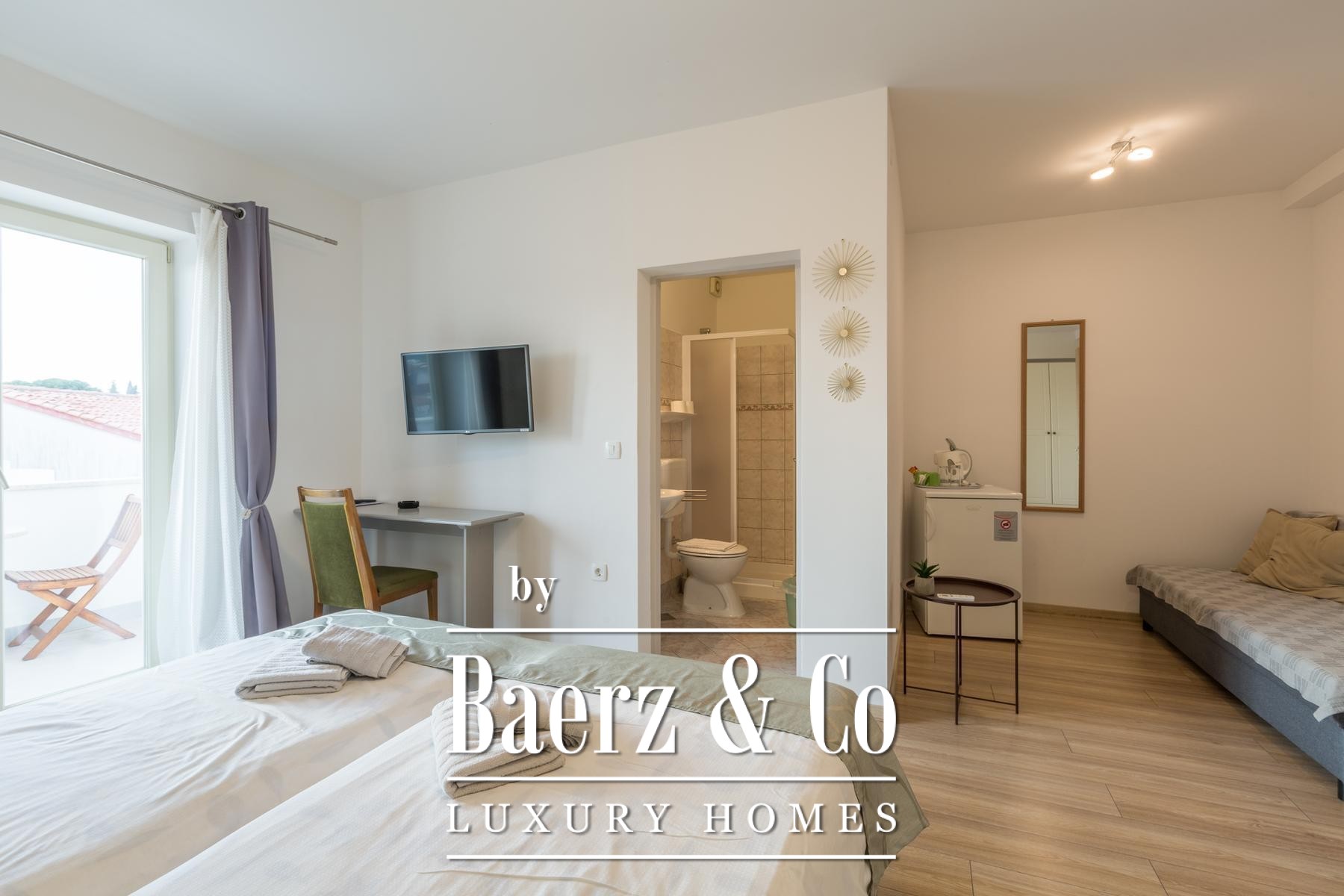 One adaptable room may serve as a spa, gym, or salon. The setting is woven into Rovinj’s urban tapestry, with the marina, healthcare, schools, shops, and cafes all within easy reach. This guesthouse balances investment potential with operational ease, offering access to the energy of Rovinj’s legendary coastline and tourism industry.