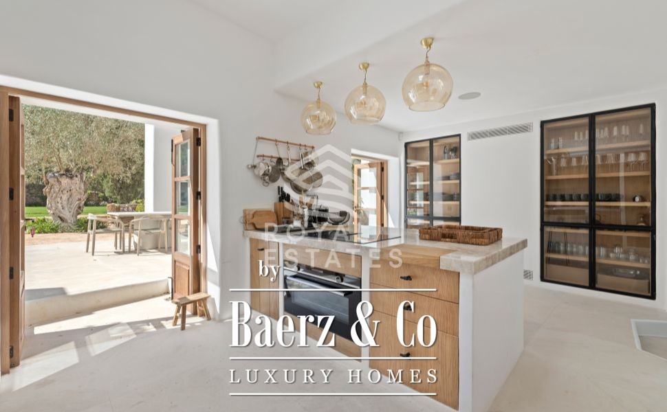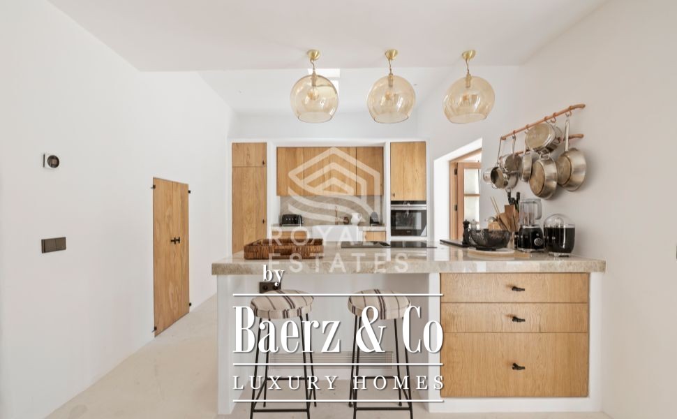 The kitchen, open and filled with light, features wooden cabinetry and marble tops, integrating function with a sense of calm. For entertaining, a double-height terrace and outdoor pizza oven encourage gatherings overlooking a manicured lawn and a 10-metre swimming pool. The grounds, spanning 6,000 m², blend seamlessly into the surrounding forest, balancing privacy with open, airy flow. Practicality accompanies beauty—dedicated parking for six cars, high-speed wifi, a Sonos sound system and a private water well. Every element of this villa in Sa Carroca is designed for discreet, restorative island living.