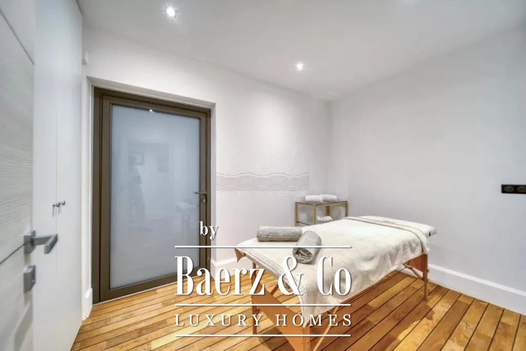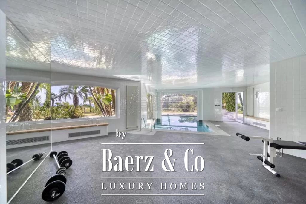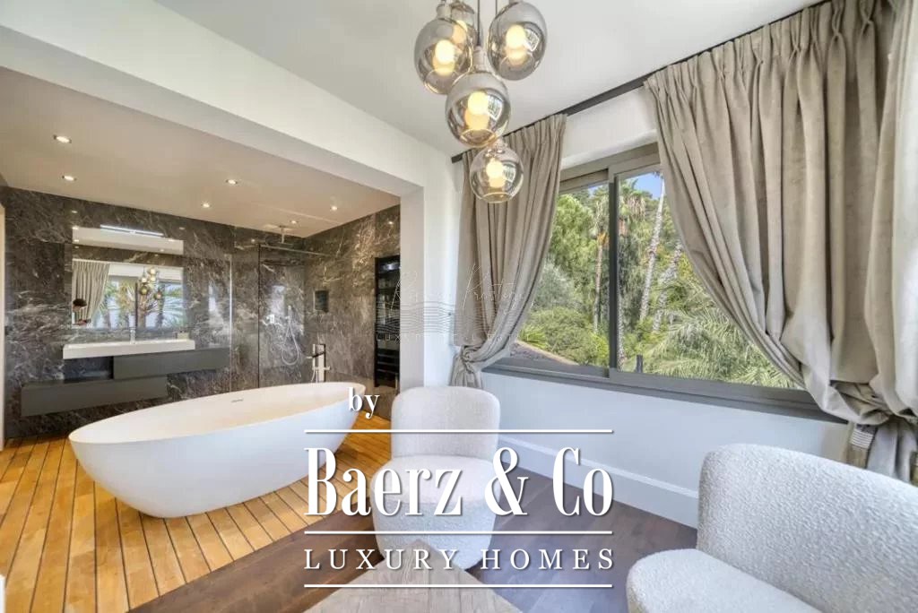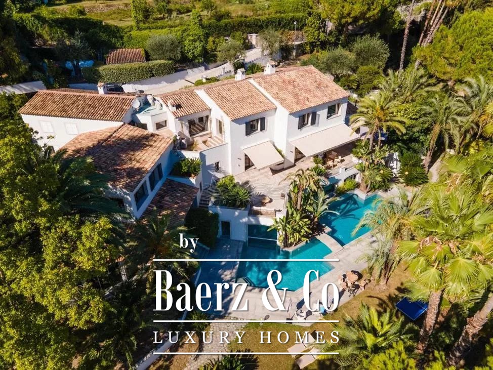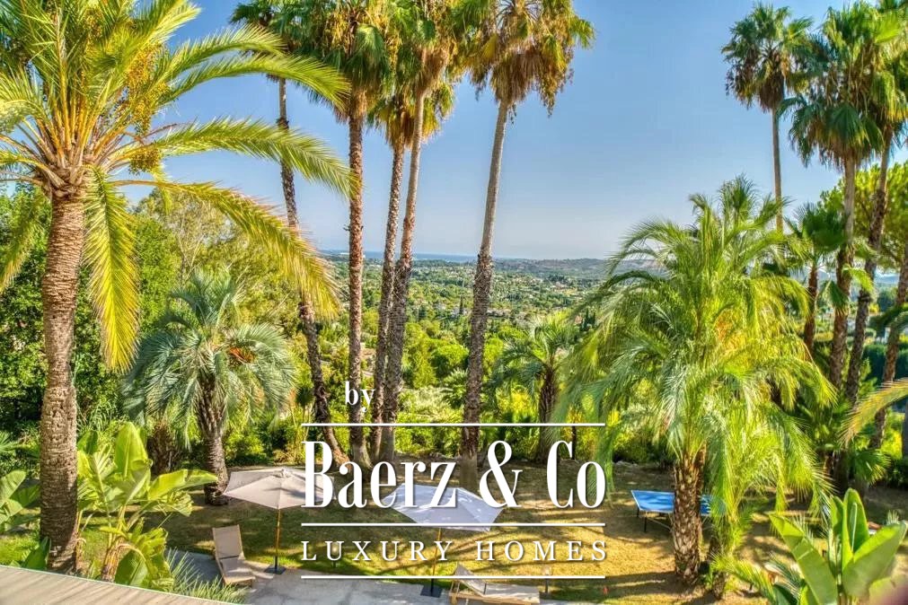 cellar, a massage room with shower, aadditional massage room, a yoga room, a fitness room, hammam, sauna, shower-wc, indoor and outdoor swimming pool, a caretaker's apartment + a large duplex caretaker's apartment, a 4-car garage, 2 workshops approximately 150m2 additional on land of 9700 m2 with exceptional palm grove, 180 ° sea view, orchards with olive trees and citrus fruits / henhouse and forest partly in large reception terraces. Possibility of building a helipod, or a guest house or a tennis court on the lower part of the field.