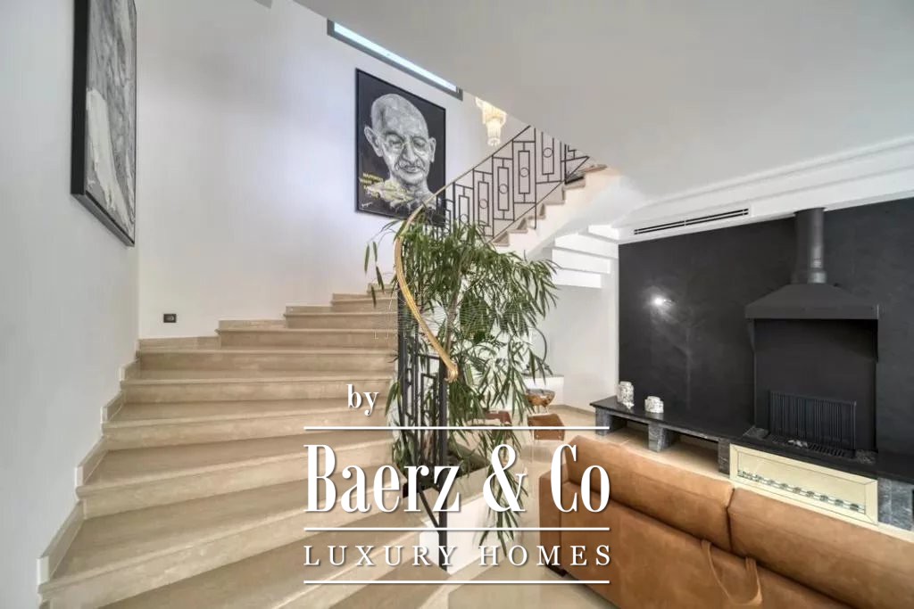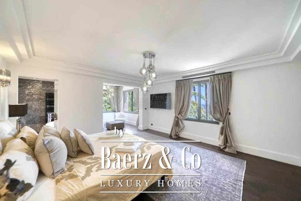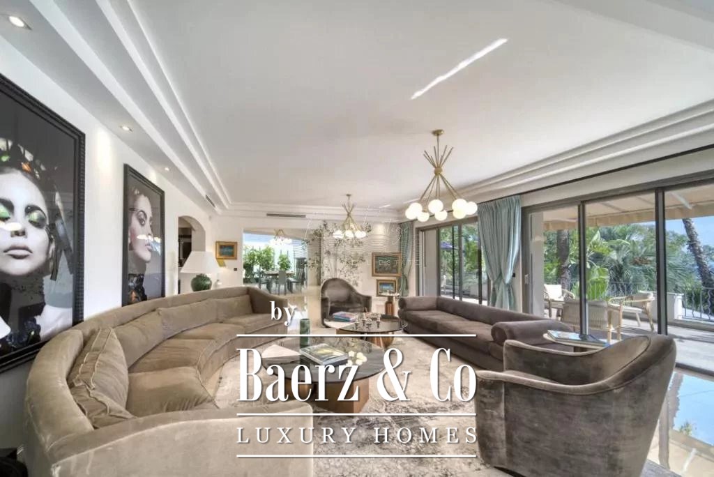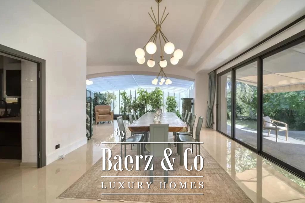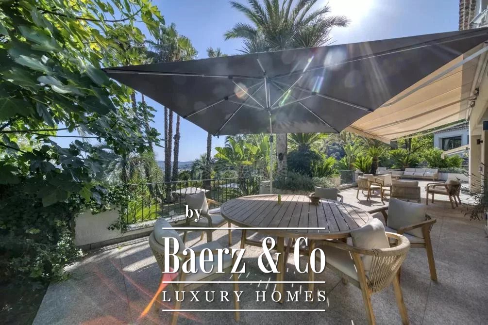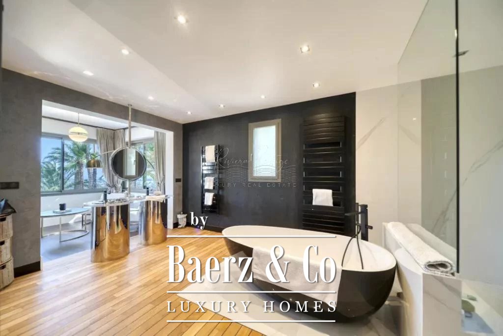 cellar, a massage room with shower, aadditional massage room, a yoga room, a fitness room, hammam, sauna, shower-wc, indoor and outdoor swimming pool, a caretaker's apartment + a large duplex caretaker's apartment, a 4-car garage, 2 workshops approximately 150m2 additional on land of 9700 m2 with exceptional palm grove, 180 ° sea view, orchards with olive trees and citrus fruits / henhouse and forest partly in large reception terraces. Possibility of building a helipod, or a guest house or a tennis court on the lower part of the field.
