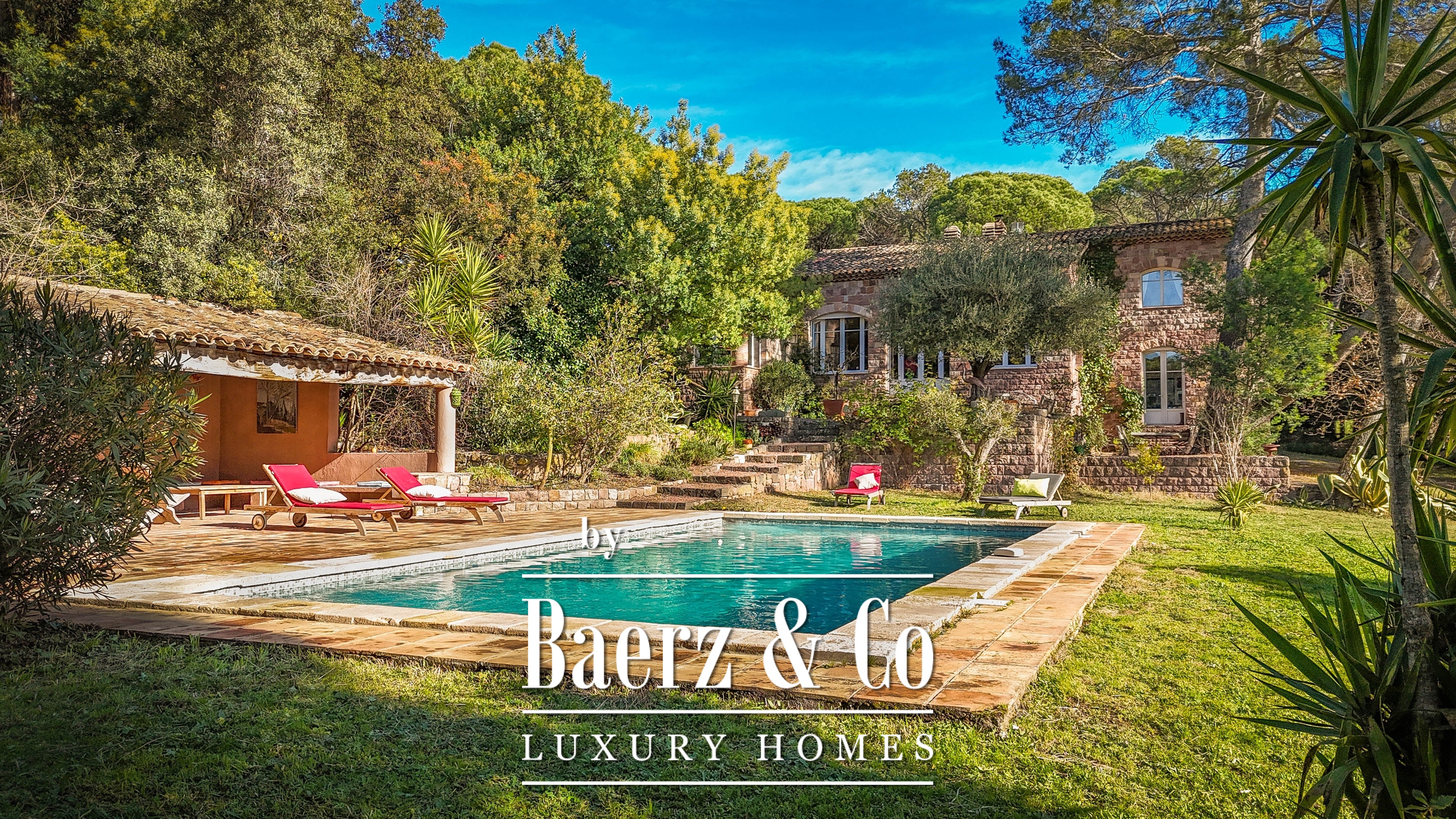 This villa presents five bedrooms, five bathrooms, an independent studio, an office, a library, and a dedicated dining room. The expansive kitchen, pantry, and ample storage ensure functionality matches grace. Outdoors, a swimming pool and pool house are enveloped by mature greenery, offering secluded relaxation. Additional amenities include a garage, a wine cellar, and air conditioning. The lifestyle is defined by tranquility, proximity to the coastline, and access to renowned golf courses, making this luxury villa for sale in Saint-Raphael both distinguished and deeply rooted in its setting.