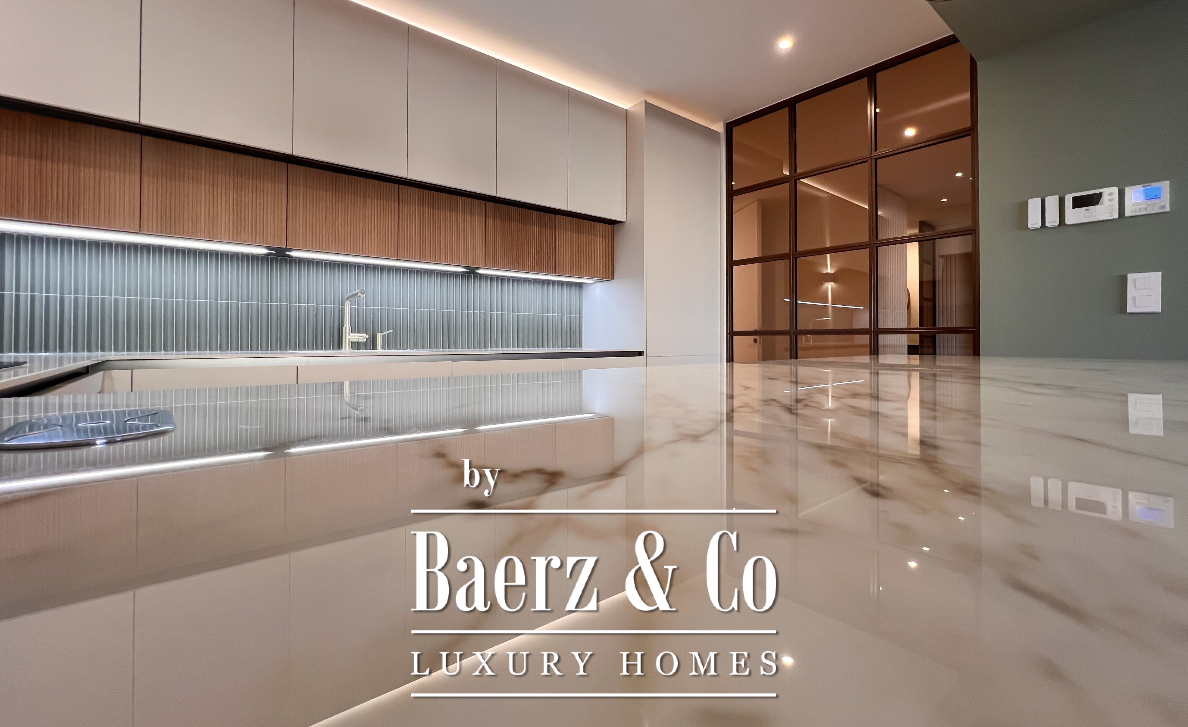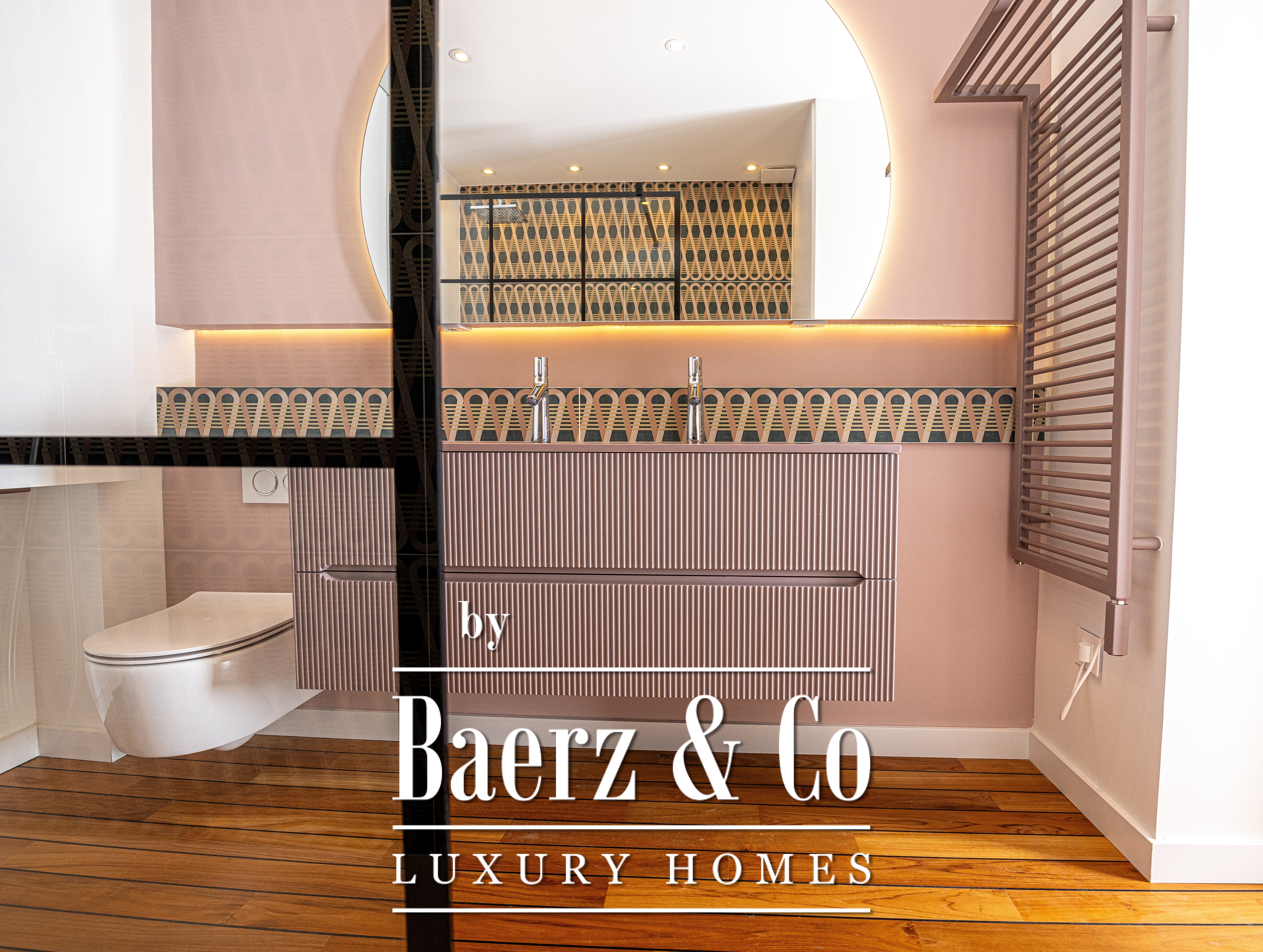 The master bedroom, over 18 m², offers custom LED-lit curtain recesses and dedicated space for a walk-in wardrobe. A second bedroom, two sleek shower rooms, a separate WC, and a well-designed utility area complete the layout.
