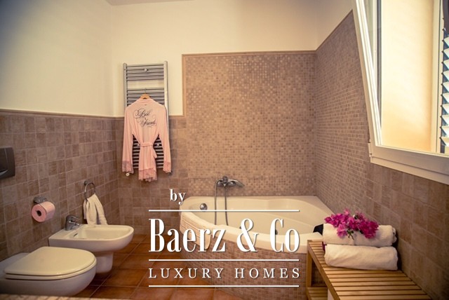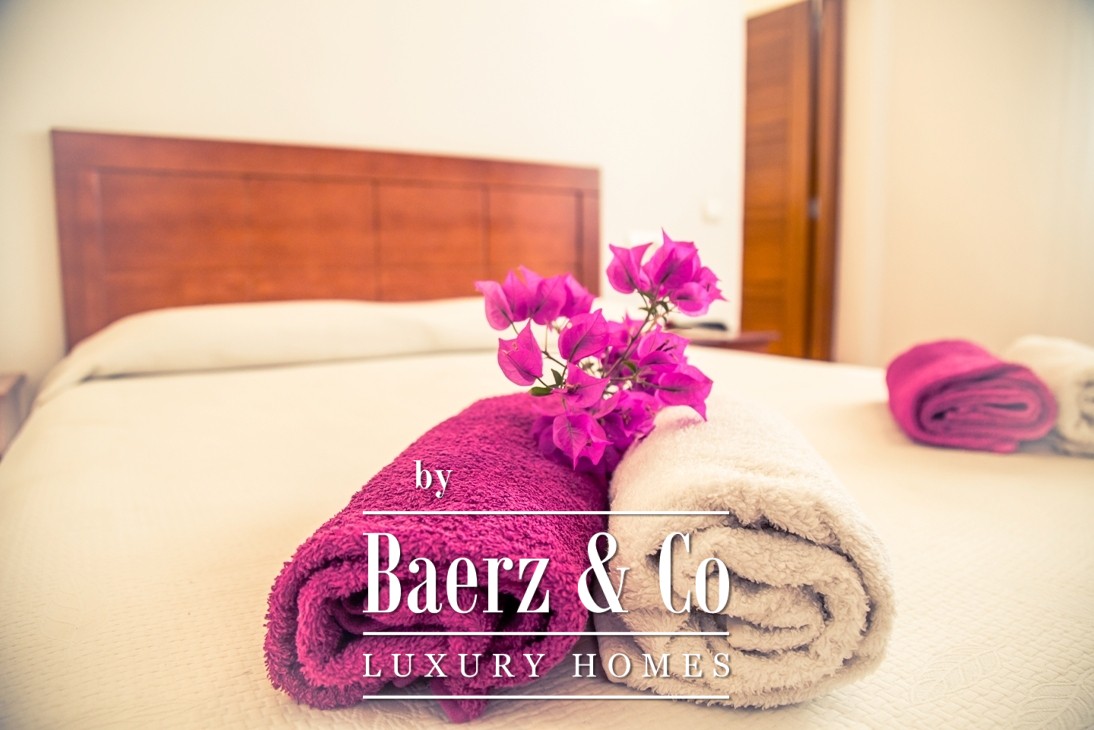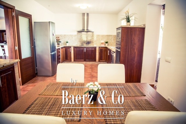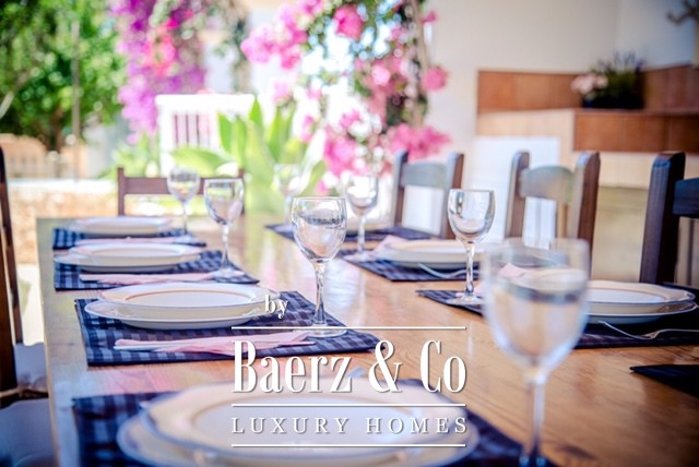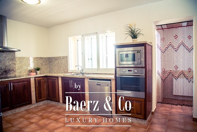 fireplace. All rooms are equipped with air conditioning and the house has central heating, so you can enjoy this house all year round. The house facilitates three spacious bedrooms with fitted wardrobes and two bathrooms, one with a jacuzzi. The exterior Because of the various terraces and well-kept garden, the house is perfect for enjoying the great outdoors. There is enough space around the pool to relax and there is an outdoor kitchen. This is furnished with a sink and a built-in barbecue. The bougainvillea and palm trees create a Mediterranean atmosphere and contrast beautifully with the crisp white house.