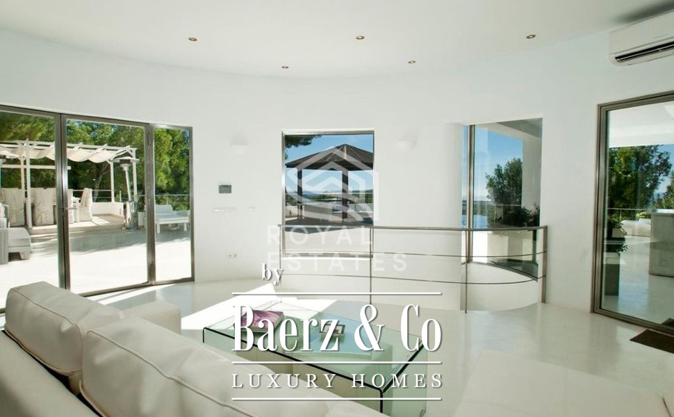 Villa Sant Josep de sa Talaia presents a singular retreat in Ibiza’s hills, where panoramic sea views unfold across 550 m² of curated living space. This property balances privacy and openness, offering seamless car access through semicircular gates and entering onto polished plaster floors. Expanses of curved glass windows and floating stairs define the architecture, while exceptional lighting and meticulously designed interiors lend a gallery-like atmosphere.