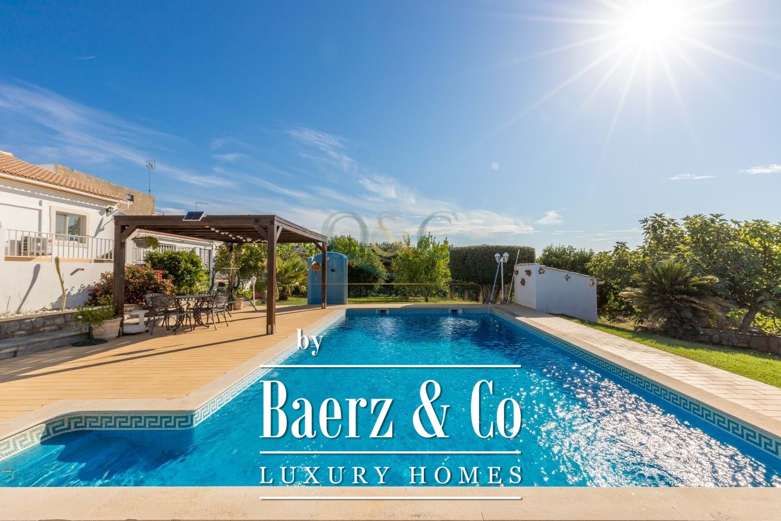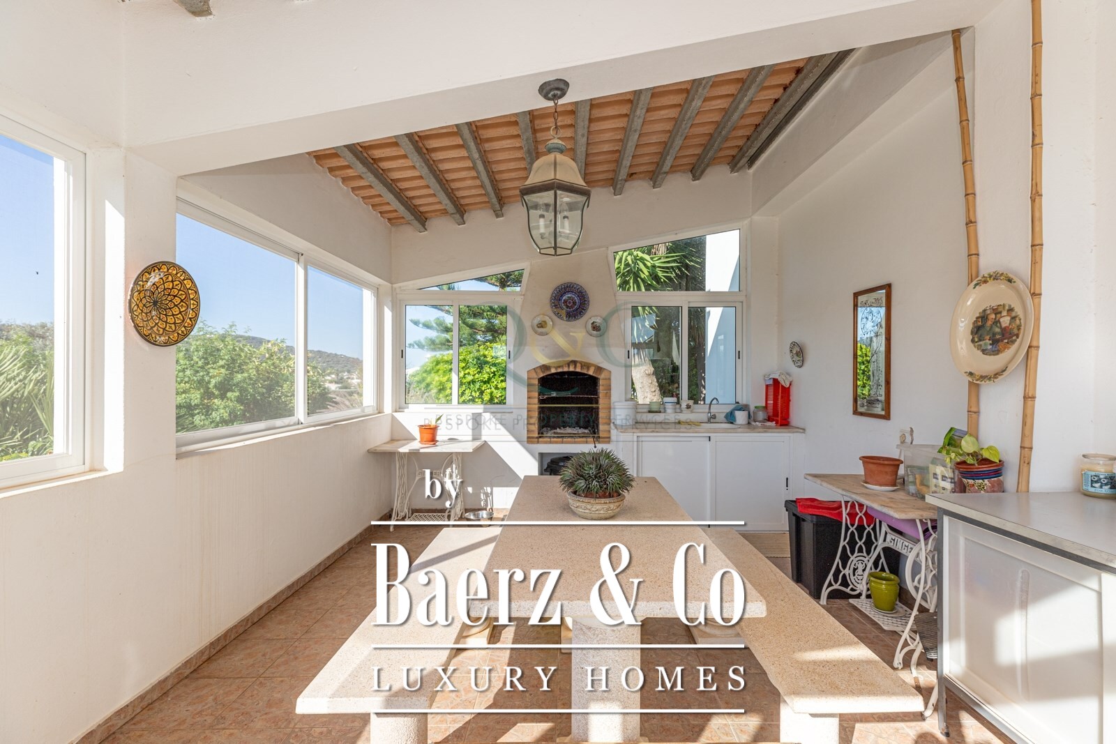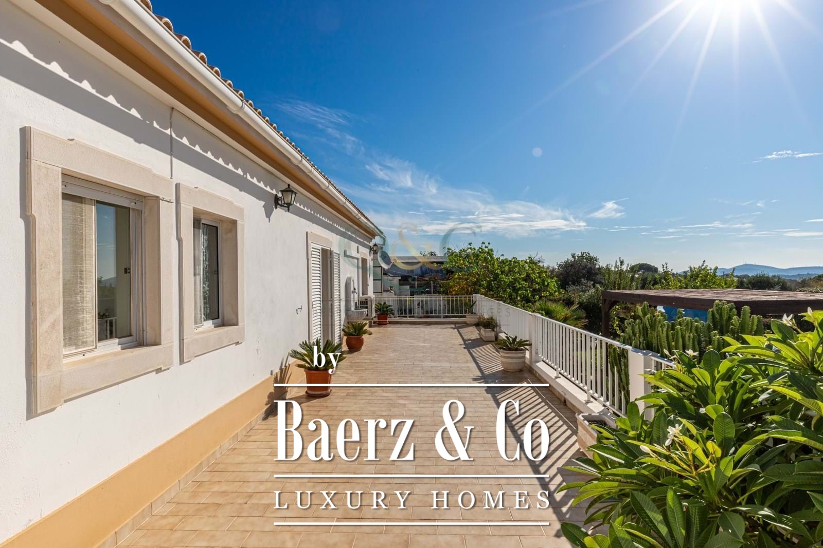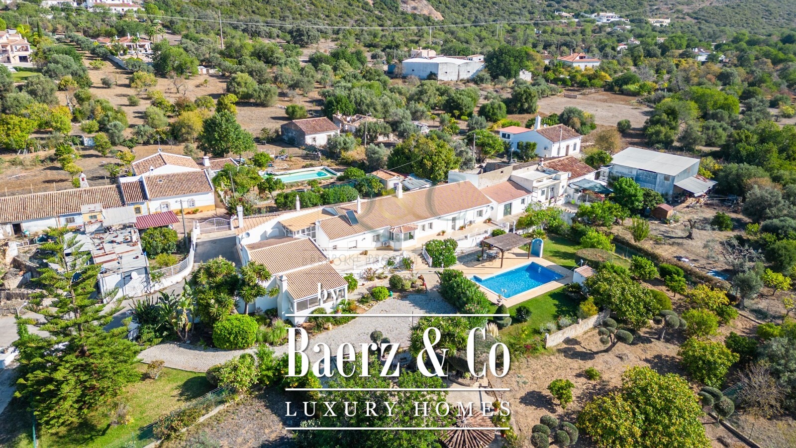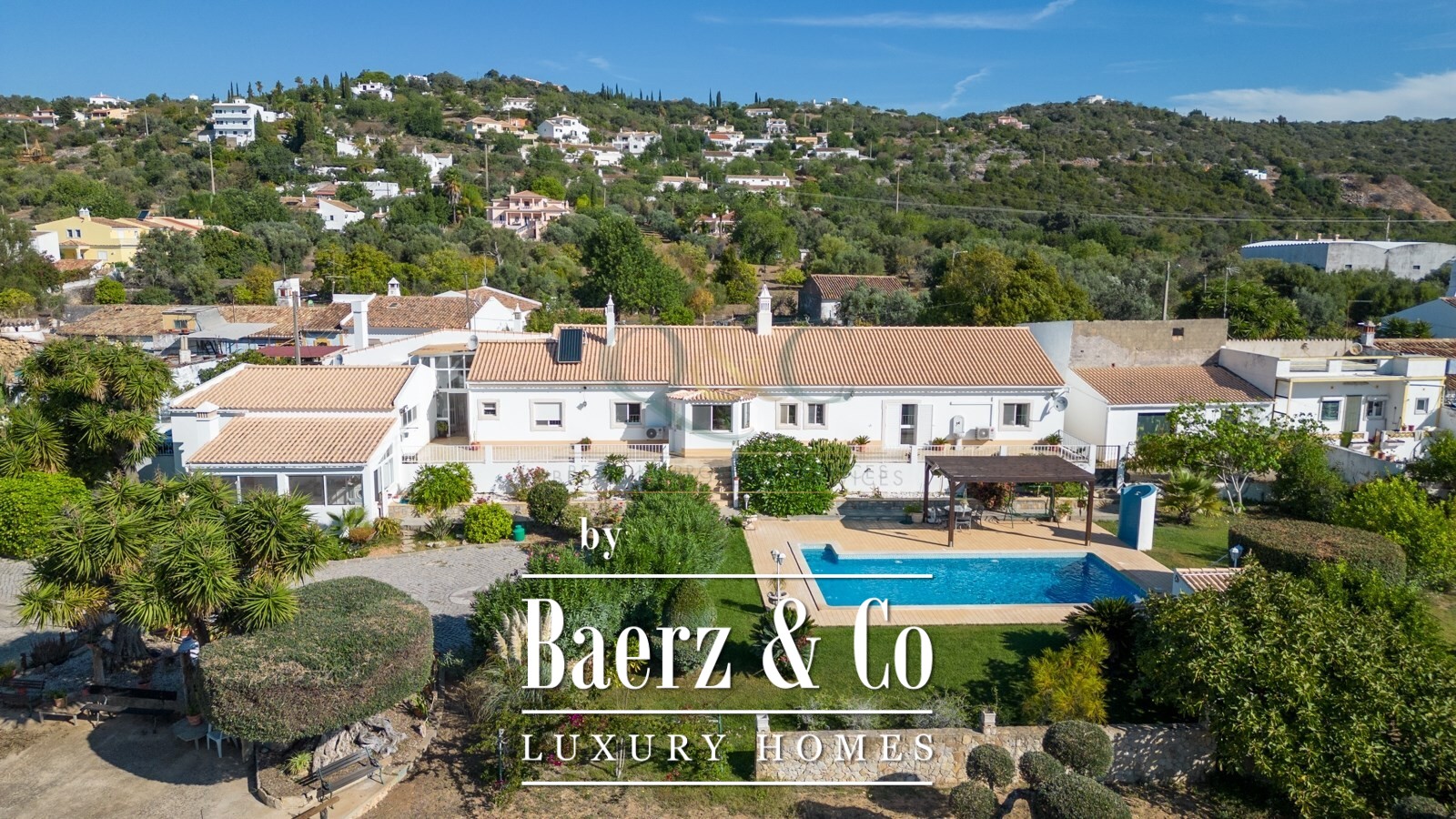 This spacious 3 bedroom villa, built all on one level, is located in a peaceful hamlet close to São Brás de Alportel with lovely hillside and country views. The entrance hall leads through to an office, a utility room , a family bathroom, and a large open plan kitchen / dining with lounge and direct access to an outdoor terrace. The property has 3 bedrooms , 2 with a shared bathroom and the master suite, which also has direct access to the outdoor terrace. There is a second lounge, a formal dining room, and a generous sized separate room with kitchen / dining / lounge and a wood burning stove, ideal as a party room or a self contained annex for guests. In the south facing garden, which has electric entrance gates and is fully fenced is a lovely pool surrounded by lawns, an aviary, many beautiful plants, and a splendid orchard with several different fruit trees. The property has a double garage and also a large outdoor entertainment room, with BBQ.