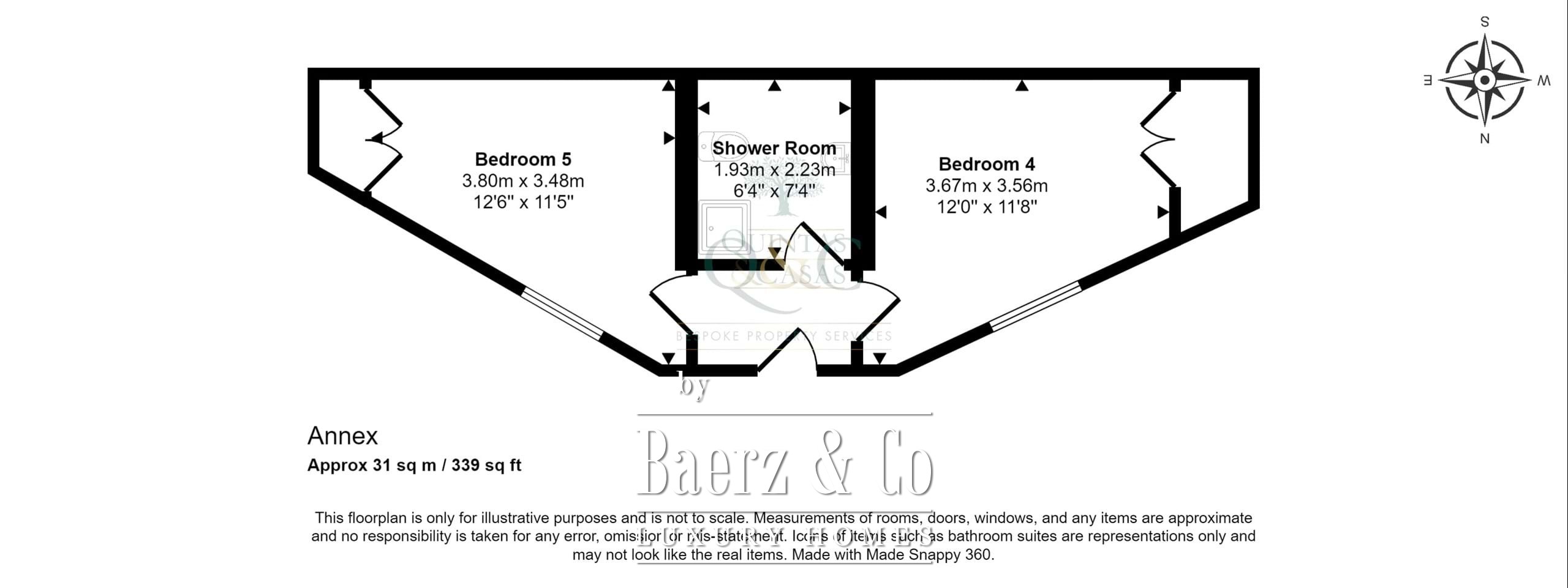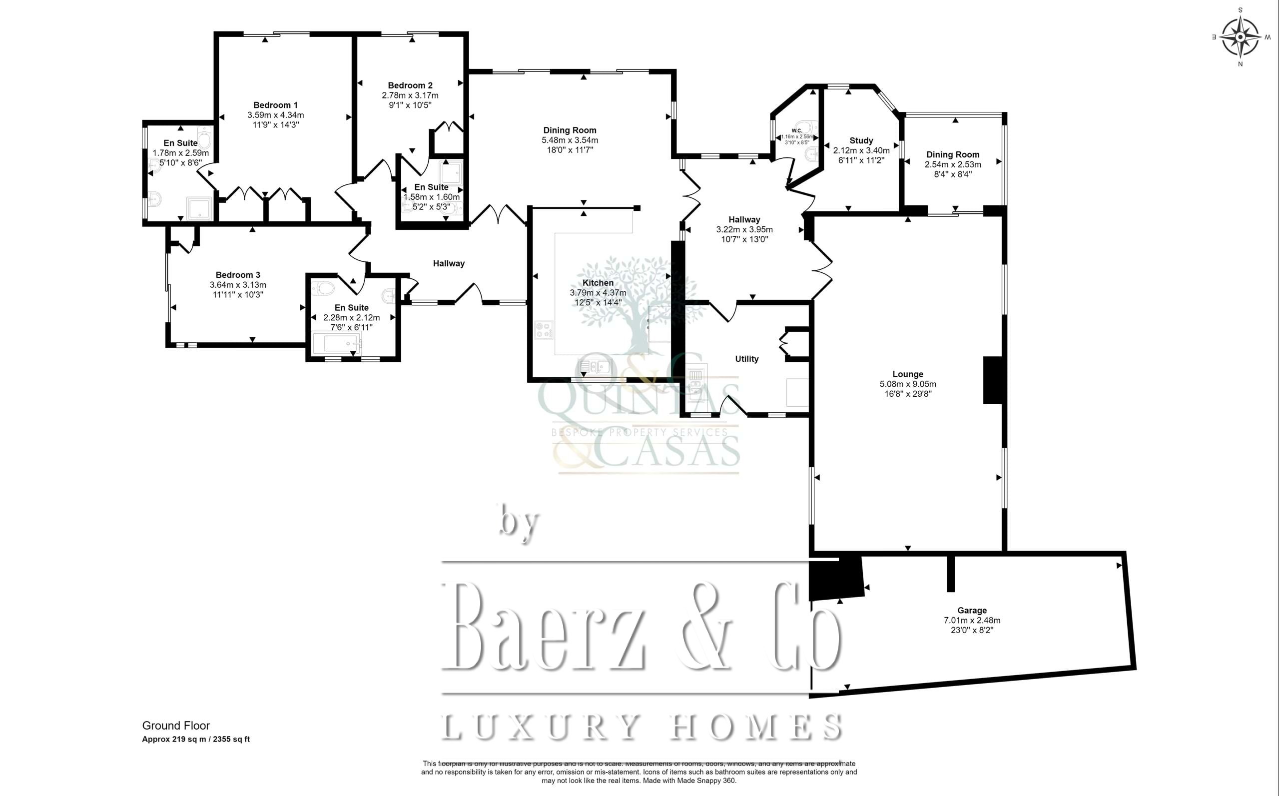 The sweeping driveway leads to the front door as well as the garage behind. The entrance hallway leads to the master bedroom with en suite shower room and doors out to the terrace. Two further double bedrooms both benefit from en suites, one of which with bath and the other with shower and again both with doors out to terraces. Spacious dining room leads into the well fitted kitchen. Internal spacious hallway leads to an impressive sitting room with wood burner and conservatory behind, a guest cloakroom, study and utility room.