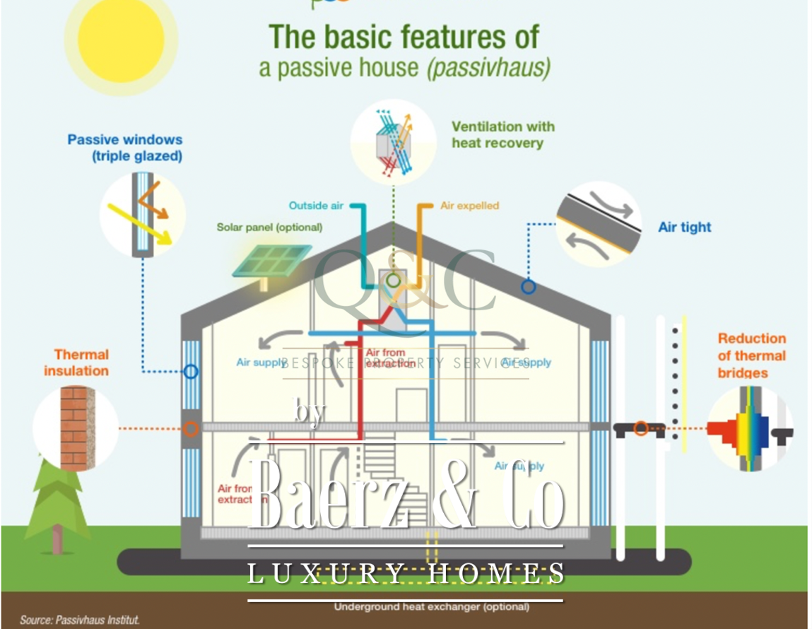 These villas need hardly any active heating or cooling of living spaces. Even when the sun does not shine in the winter for a few days or in extremely high temperatures in the summer, the buildings high thermal mass, together with the hyper-insulated walls and high-performance joinery, maintains a stable temperature.