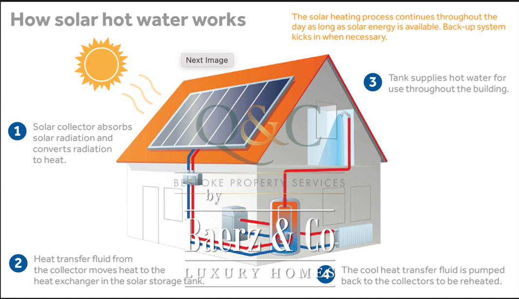 The ventilation system, MVHR, sucks moisture and odours from the kitchen and bathrooms and exhausts them outside, at the same time providing a continuous supply of fresh filtered air. With the heat exchanger, the ambient temperature of the air is maintained. The filtered air is of particularly interesting for those suffering from pollen allergies. The villas also benefit from a solar-heated hot water system.
