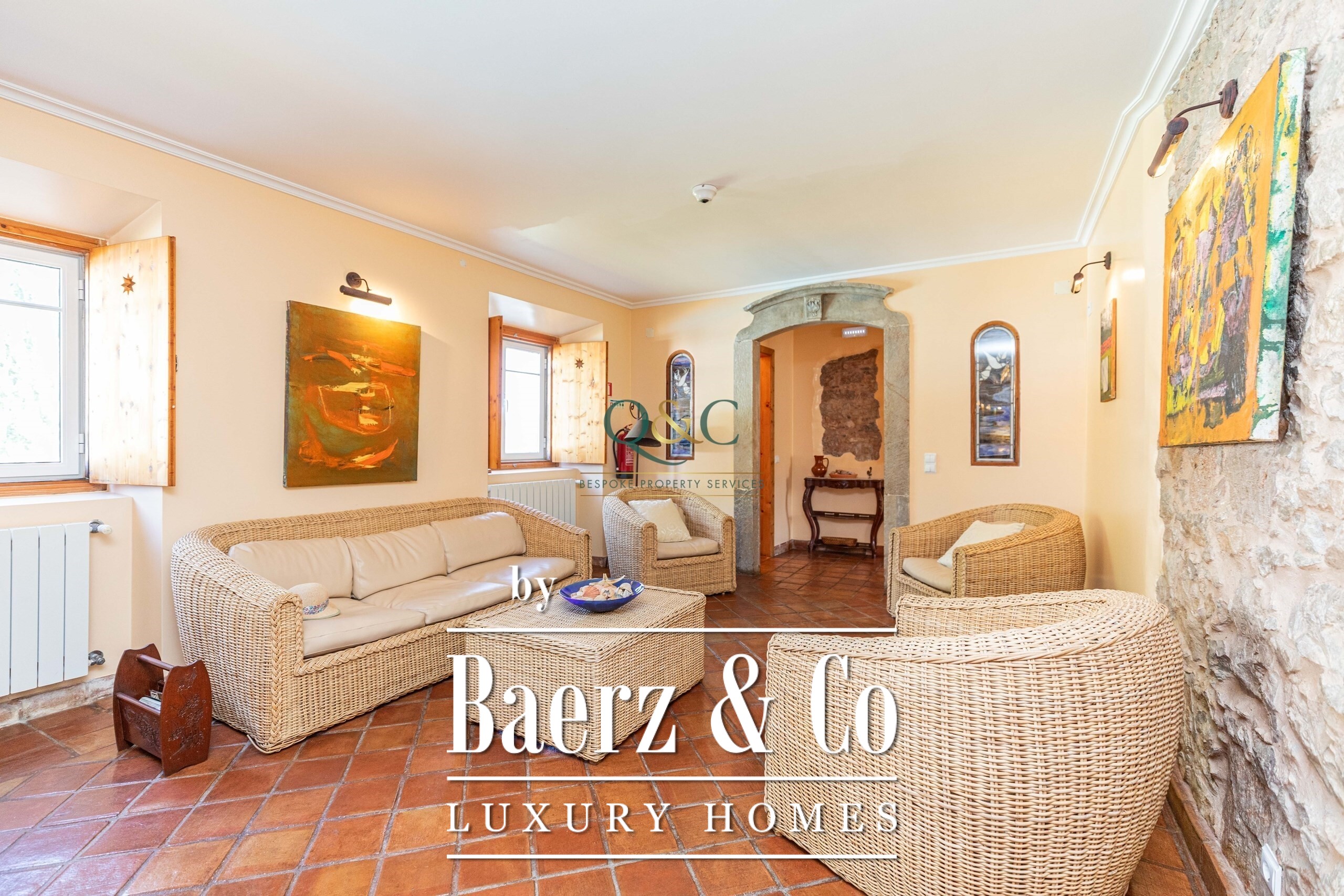 The right wing offers another equipped kitchen, dining room and living room with a cosy fireplace, three additional bedrooms, three bathrooms and plenty of storage space. The high ceilings with natural stone details create an inviting space.