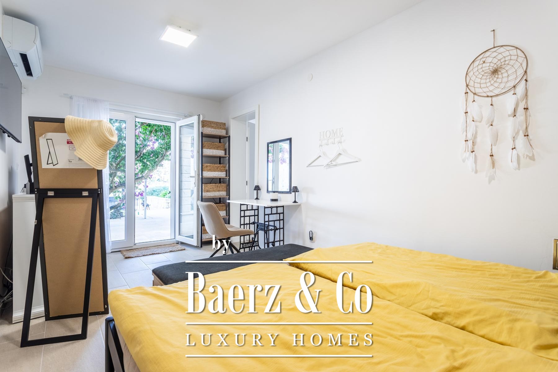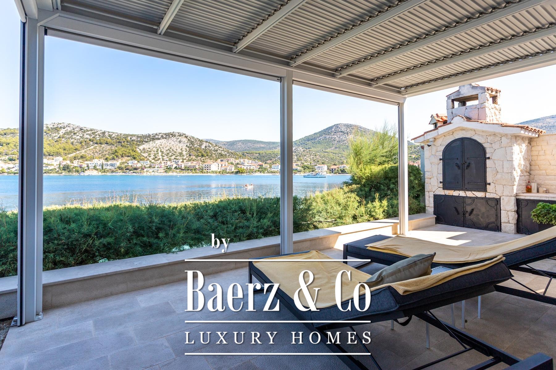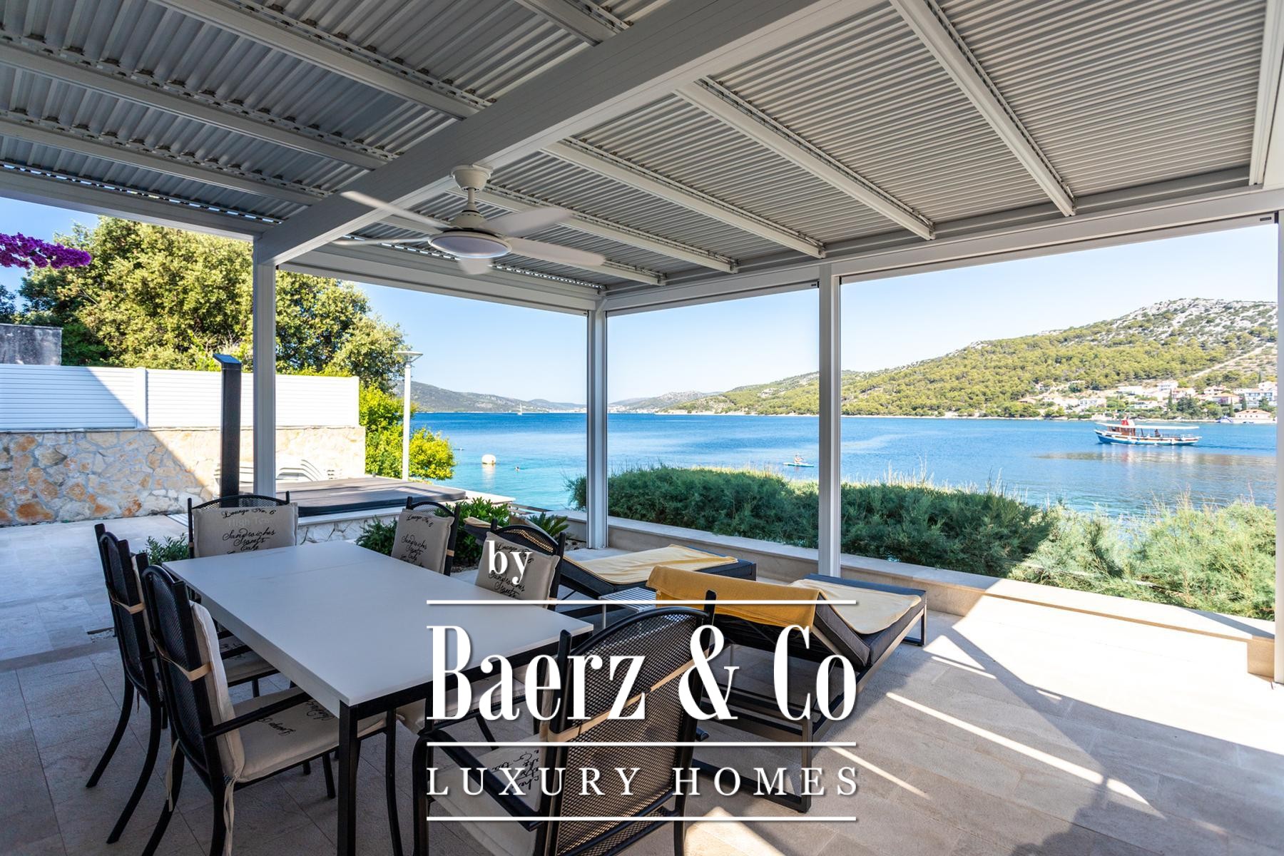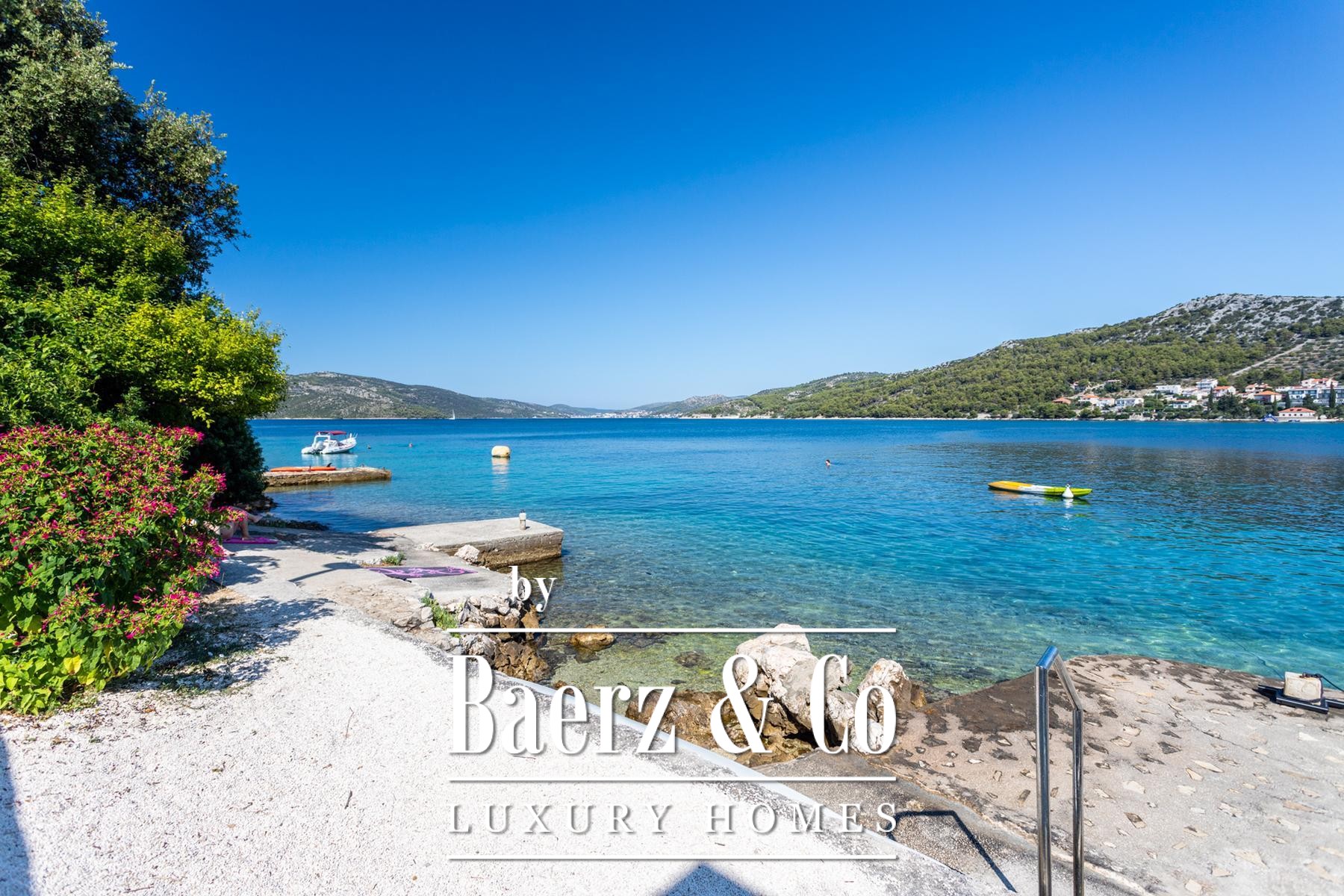 Townhouse Seget first row to the sea offers an immediate connection to the tranquil Adriatic, with 450 m² of living space set directly on the shoreline. The property is composed of three individual apartments, each with its own entrance and a private terrace running the full width of the building. The recent layout blends independence with flexibility: the lower apartment is connected to the upper by a fully soundproofed internal staircase, which closes securely for privacy.