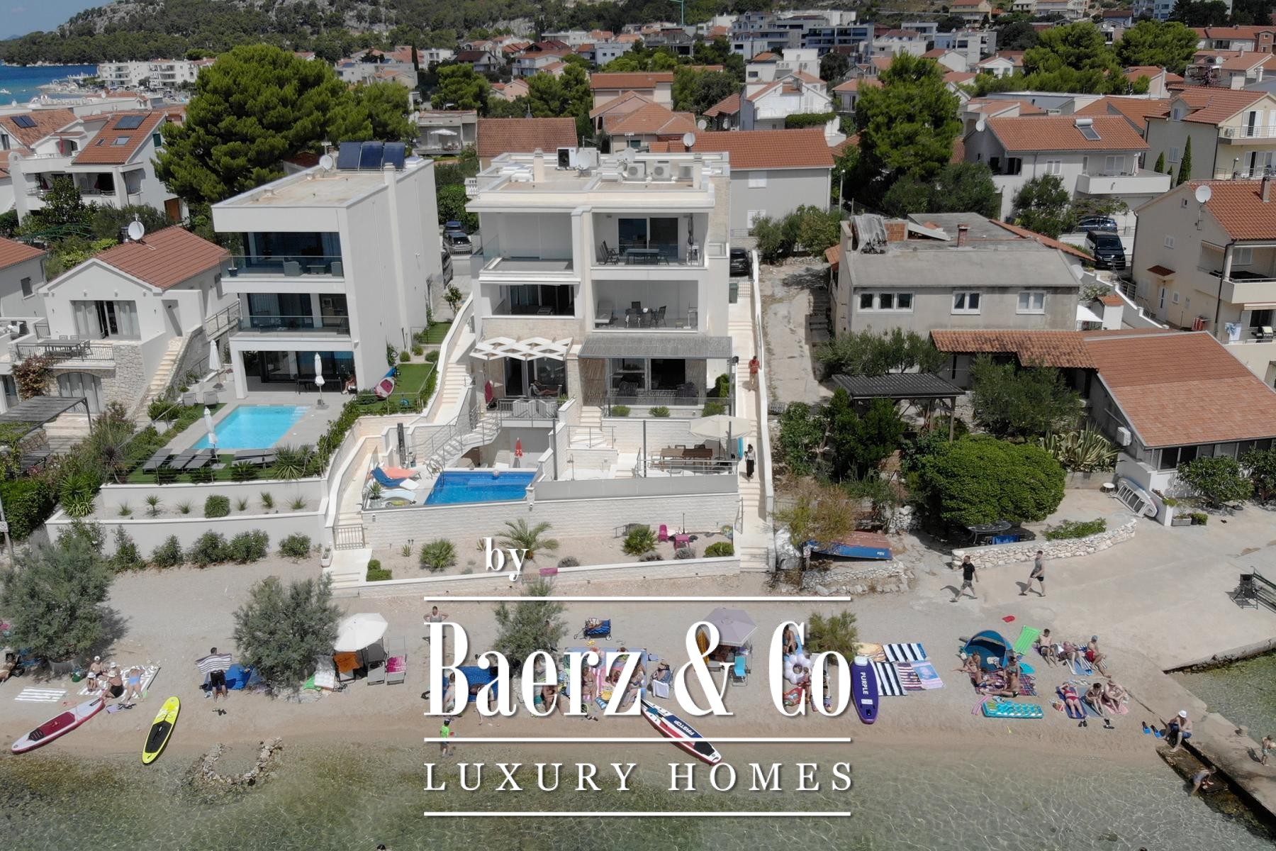 Žaborić, beautiful three-bedroom apartment on the beach, Net Usable Area 121.99 m². The apartment is located on the ground floor of a modern building, first row to the sea. It has one parking space and a large storage room in the basement. The area of the closed space is 93.40 m², the area of the terrace is 15.12 m², and the area of the yard is 62.44 m².The apartment consists of a living room with a kitchen and a dining room, three bedrooms, one of which has a private bathroom, one separate bathroom, a toilet