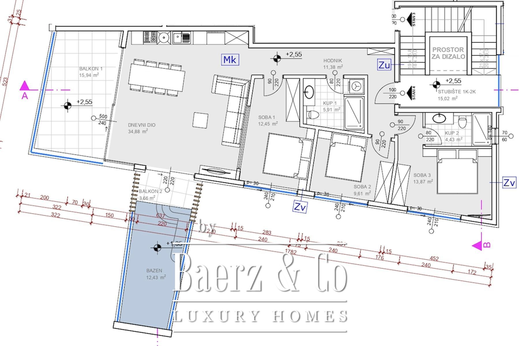 of which has access to private bathroom, one separate bathroom, and a spacious terrace with a swimming pool and sea view. Each room has air conditioning, and the apartment also has underfloor heating.The building is located only 40 meters from the sea. This is a luxury project consisting of two buildings, with a total of 9 apartments, where each apartment has a private pool.We are at your disposal for all other information.