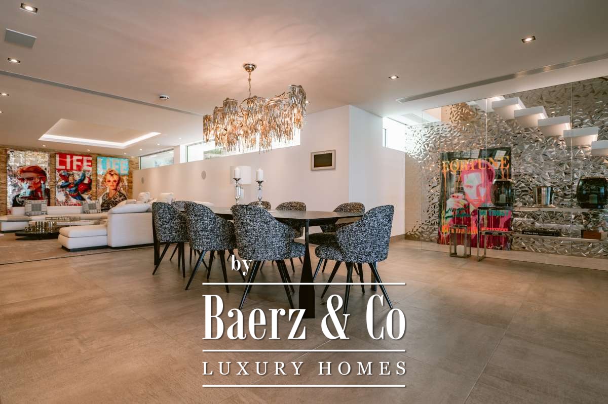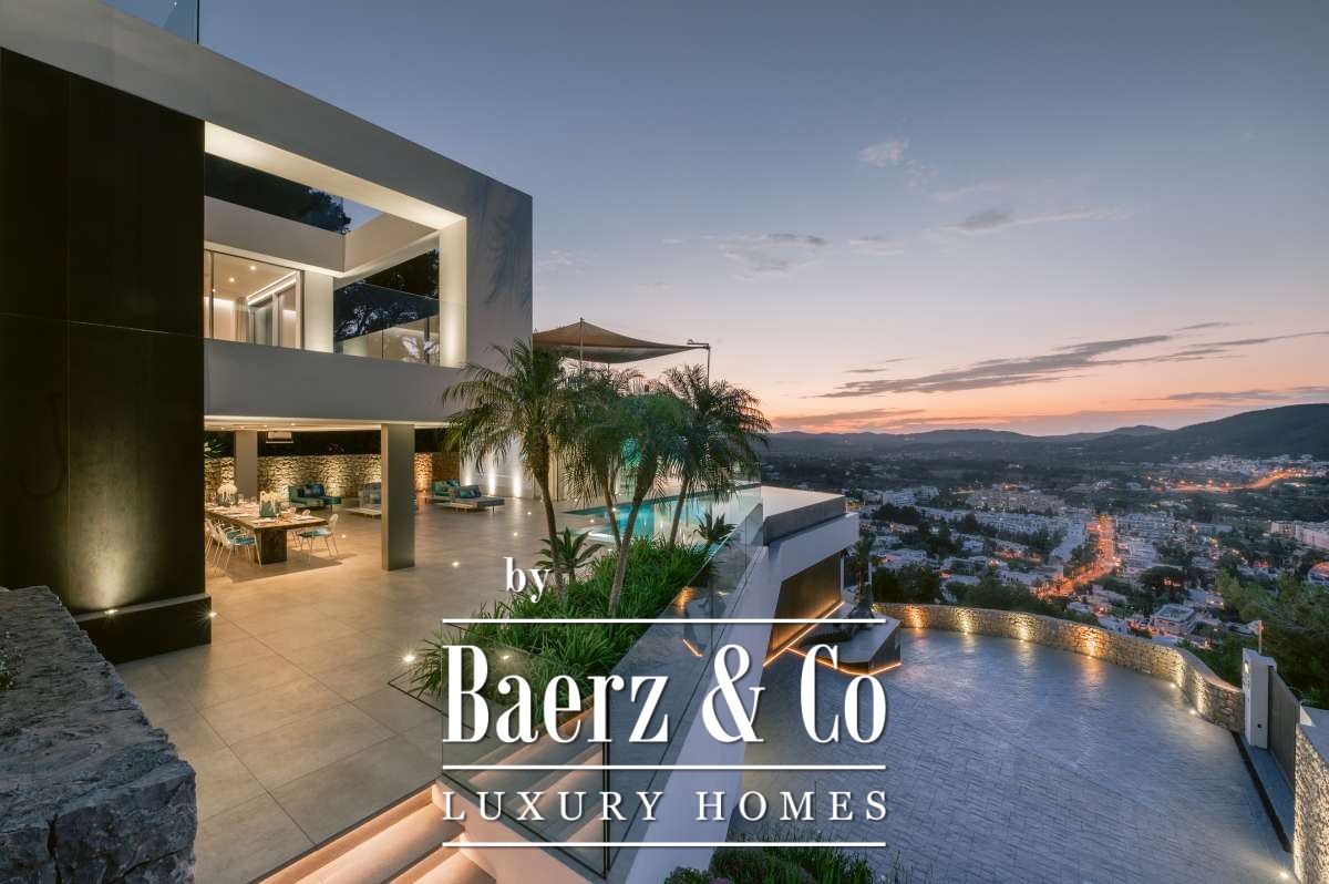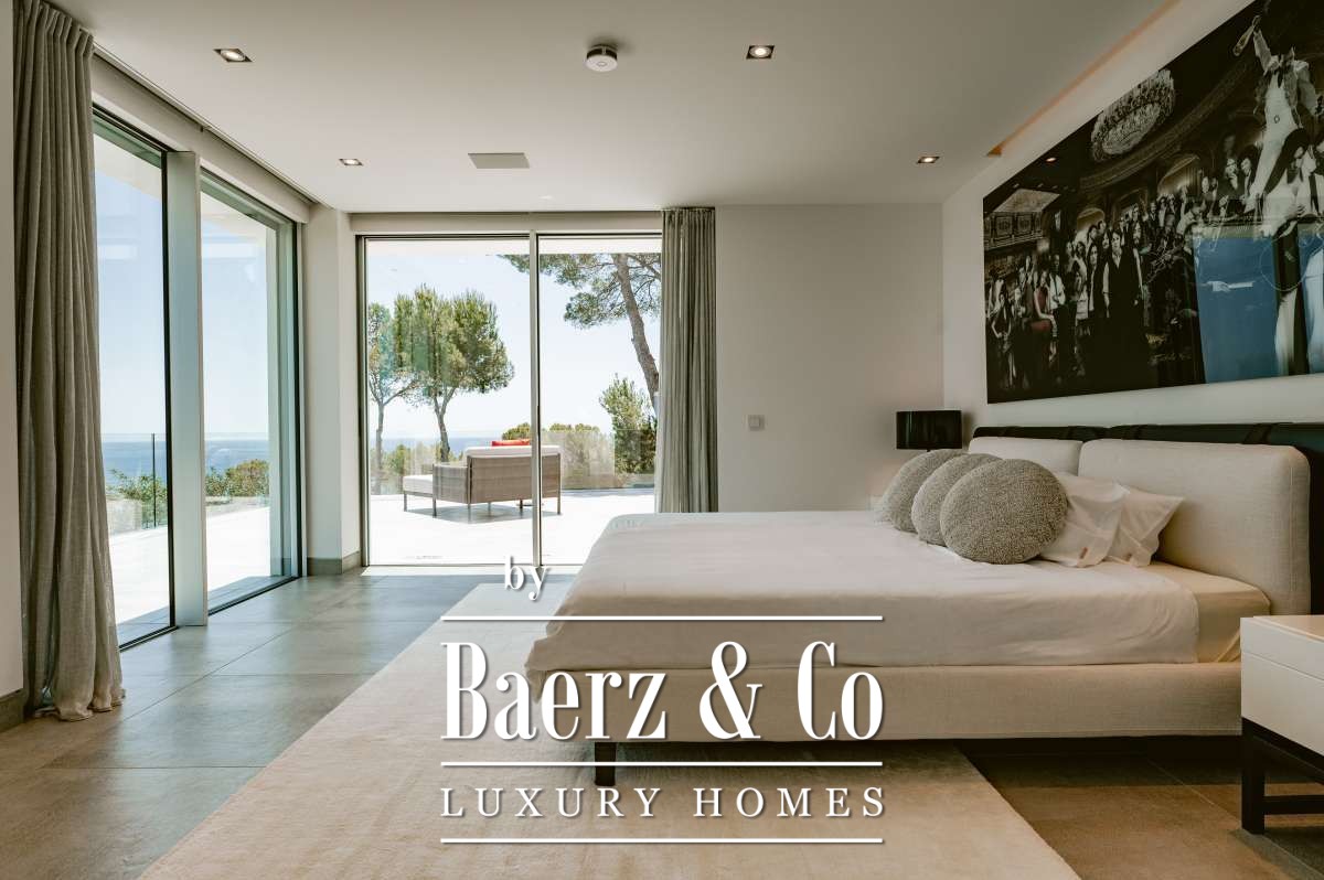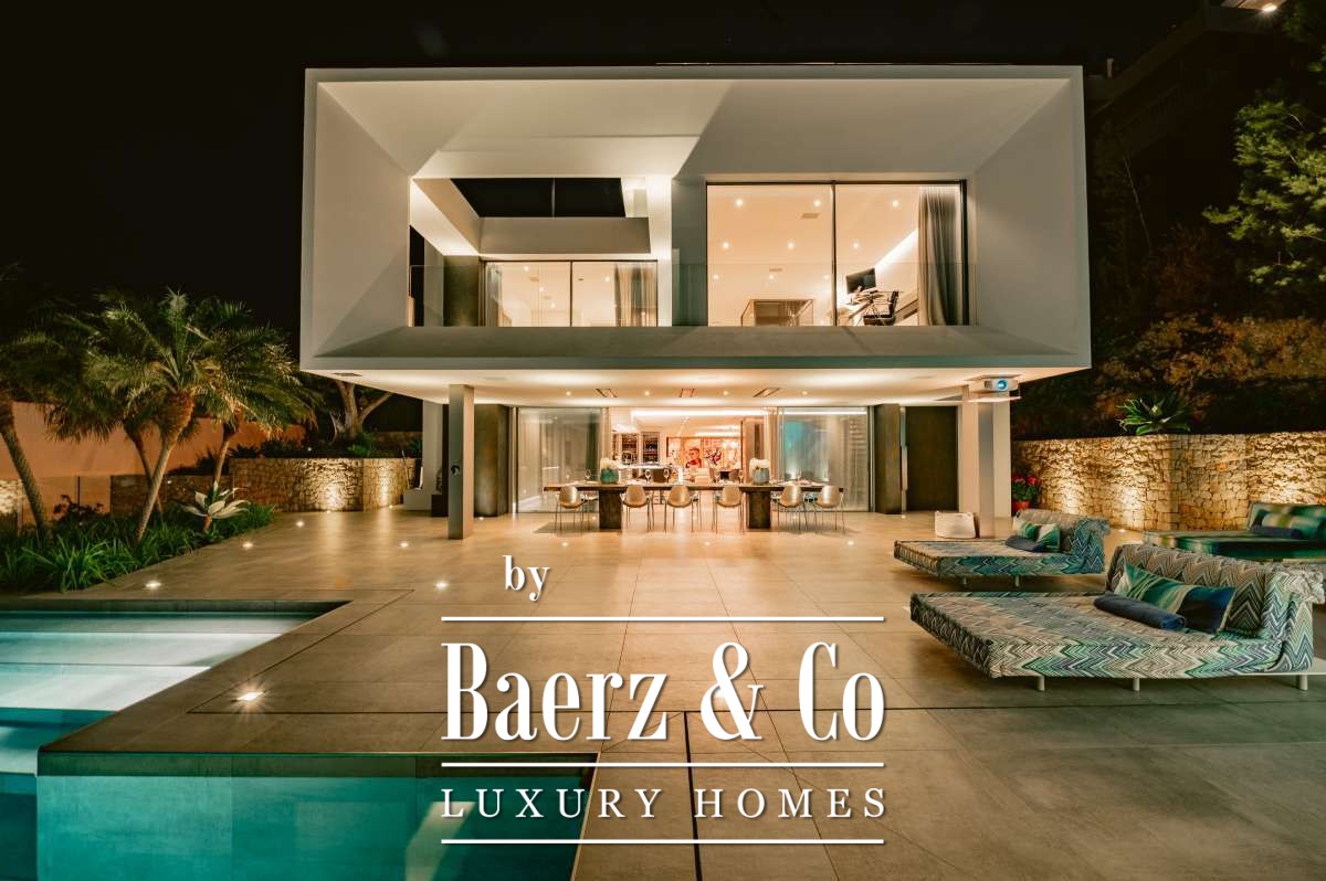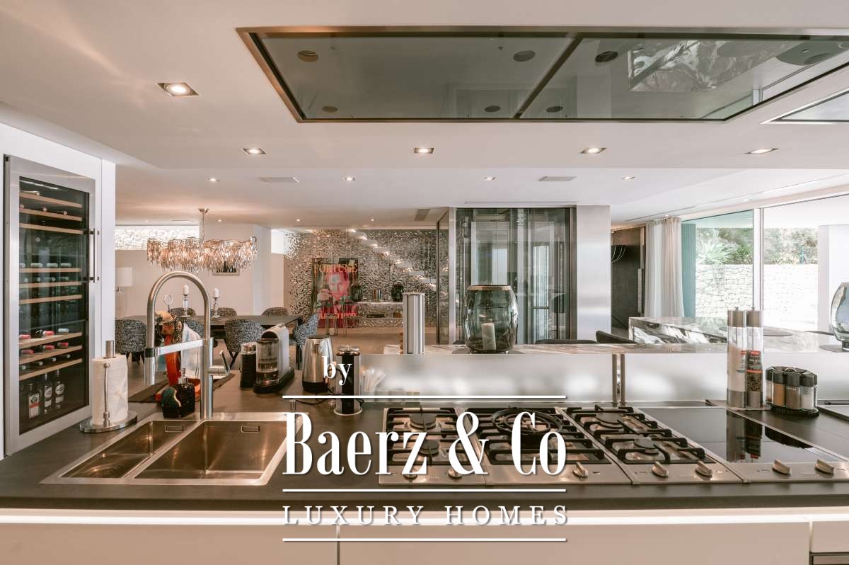 Villa Siesta with panoramic sea and marina views is a rare modern statement in Santa Eulalia’s most tranquil enclave. Designed by a renowned German architect in 2020, this villa presents 1013 m² of living space across four levels, set within a 1496 m² plot, offering a genuine sense of privacy and presence on the eastern Ibiza coast. The property comprises six bedrooms and seven bathrooms, including a VIP suite on the ground floor, a master suite with uninterrupted Mediterranean views, and guest rooms each with ensuite baths and kitchens. Throughout the house, materials such as white Corian and designer fittings by Grohe’s Allure Collection underscore a coherence of quality. Features include a Thyssen glass elevator, air conditioning by Daikin, and radiant underfloor heating for seasonal comfort.