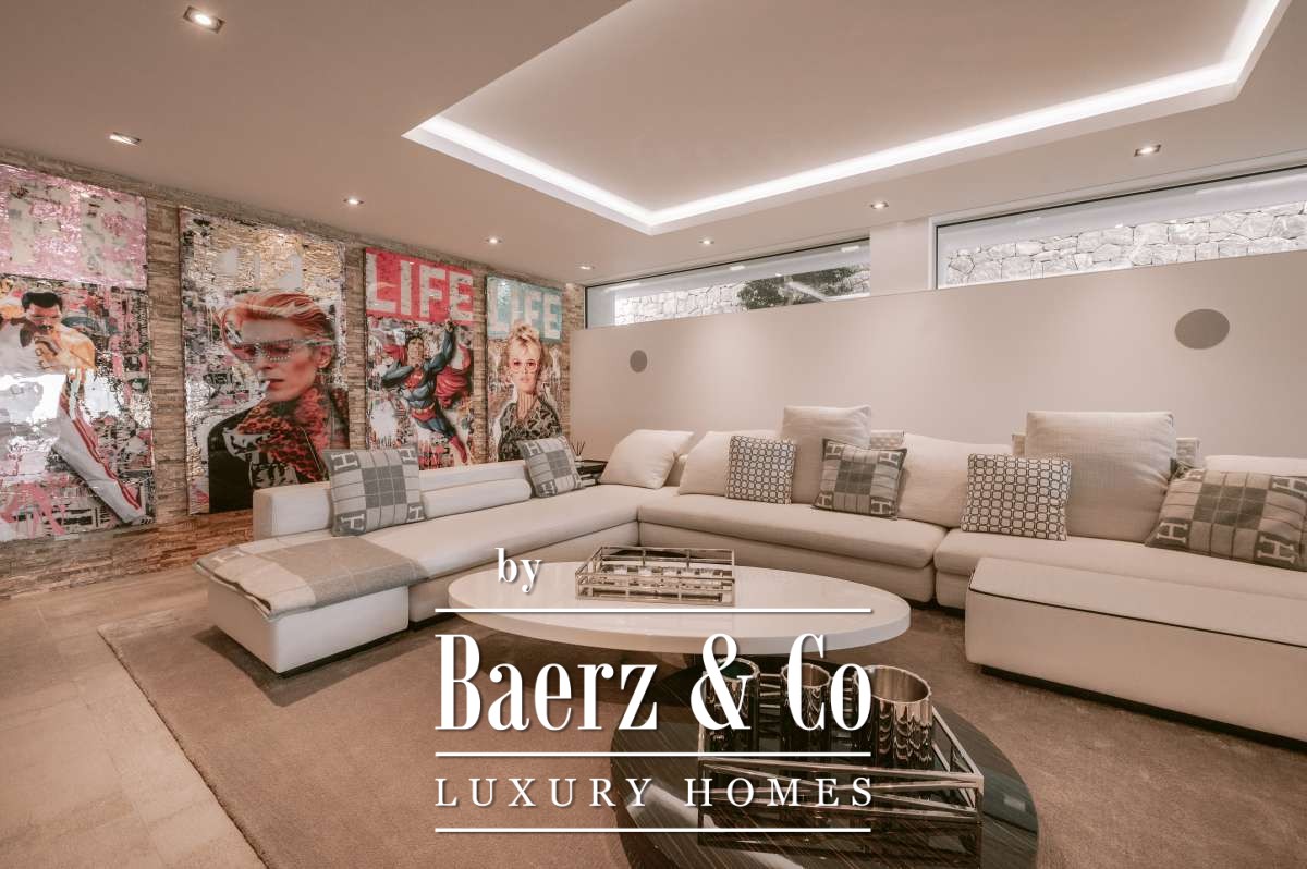 The luminous interior extends to an expansive open-plan Miele kitchen with marble breakfast bar, three climate cabinets, and central osmosis water system. Smart technology integrates home automation from Gira, Sonos sound throughout, and bespoke lighting schemes. A home cinema with 85-inch 4K Ultra HD TV, an extensive fitness suite, and three additional guest toilets complete the interior experience. Outdoors, one finds a 90 m² infinity pool, Missoni-furnished terraces totaling 600 m², a bar and gym, as well as a rooftop jacuzzi lounge beneath a retractable sunblind system. An outdoor cinema ensures evenings are no less memorable than days. Security is comprehensive, with alarm, Mobotix cameras, and video intercom. Four cars can be accommodated in the covered garage. Villa Siesta delivers an unrivaled blend of privacy, architectural clarity, and access to Ibiza’s beaches and marina—all within effortless reach of the island’s understated east.