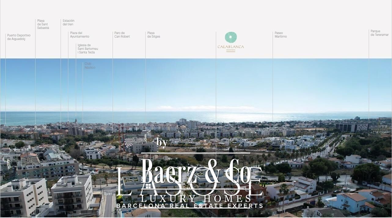 and high-end finishes that reflect understated elegance.. The kitchens are designed for modern living — fully equipped with integrated appliances, sleek Dektongroup countertops, and refined cabinetry in soft white and eucalyptus tones. Bathrooms evoke a spa-like ambiance with suspended fixtures, walk-in showers, elegant mirrors, and soft lighting that enhances every detail.. . Comfort & Wellbeing. Climate comfort is at the heart of Cala Blanca Residences. Each home features ducted air conditioning, aerothermal hot water systems, and mechanical ventilation with heat recovery — ensuring fresh, balanced air and a perfect indoor environment in every season.. . Outdoor Serenity. Private terraces and garden areas offer the ideal setting to enjoy outdoor living — a quiet morning coffee, an afternoon by the pool, or a dinner beneath the stars. The saltwater swimming pool and surrounding landscaped spaces embody the Mediterranean art of relaxation.. . Smart Design, Lasting Quality. Cala Blanca Residences meets the highest standards of Spain’s Technical Building Code (CTE), ensuring superior performance, safety, and durability. Every detail, from the LED lighting to the glass railings and motorized blinds, reflects an unwavering commitment to quality.. . Your Mediterranean Home Awaits. Cala Blanca Residences is more than a place to live — it’s a lifestyle inspired by the sea, light, and serenity of Sitges. Whether as a permanent residence or a seaside retreat, it offers the perfect balance between modern design, environmental awareness, and timeless Mediterranean charm.. . Experience a new way of living on Spain’s most beautiful coast — where sustainability meets sophistication, and every day feels like a summer dream.