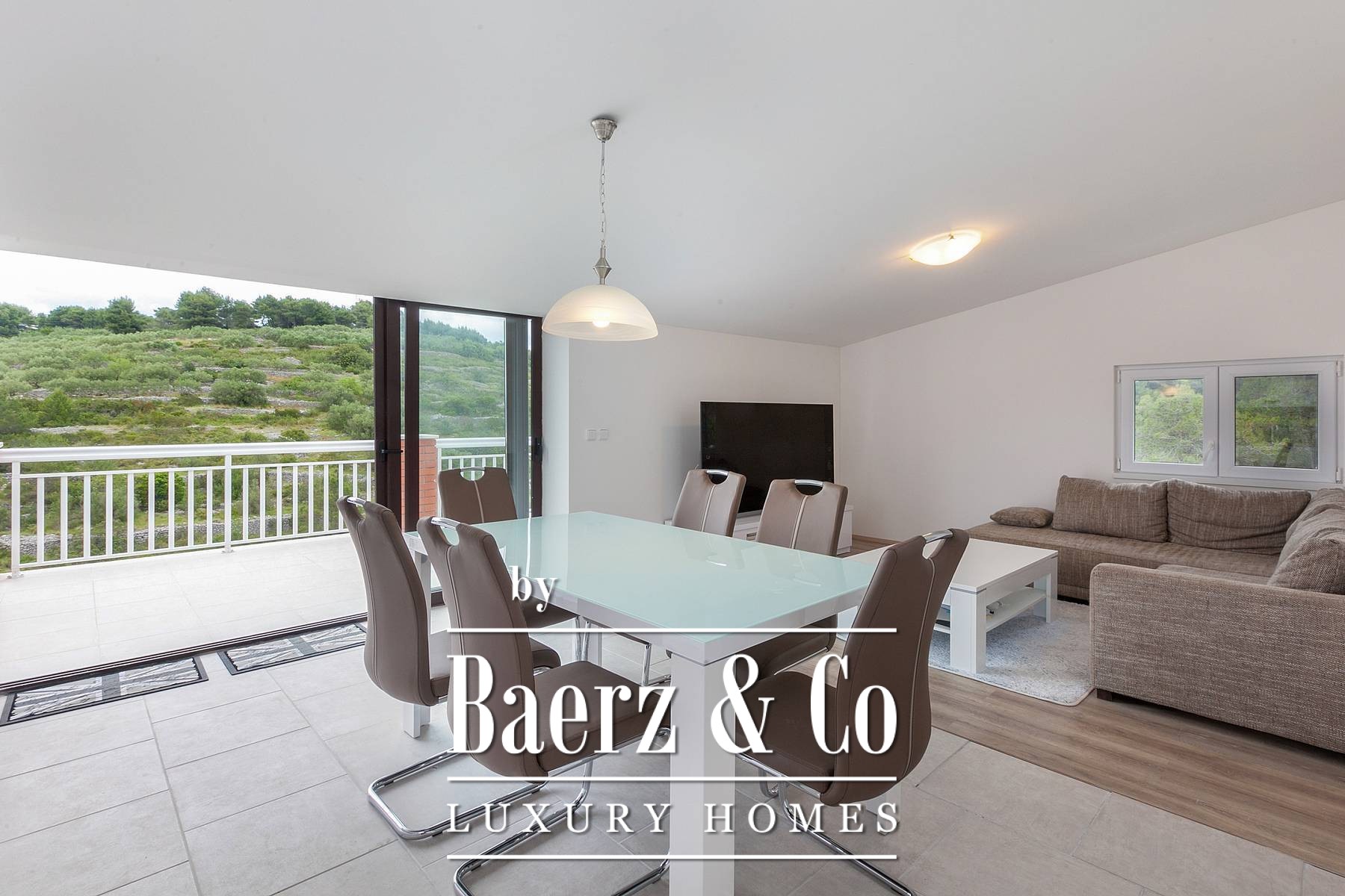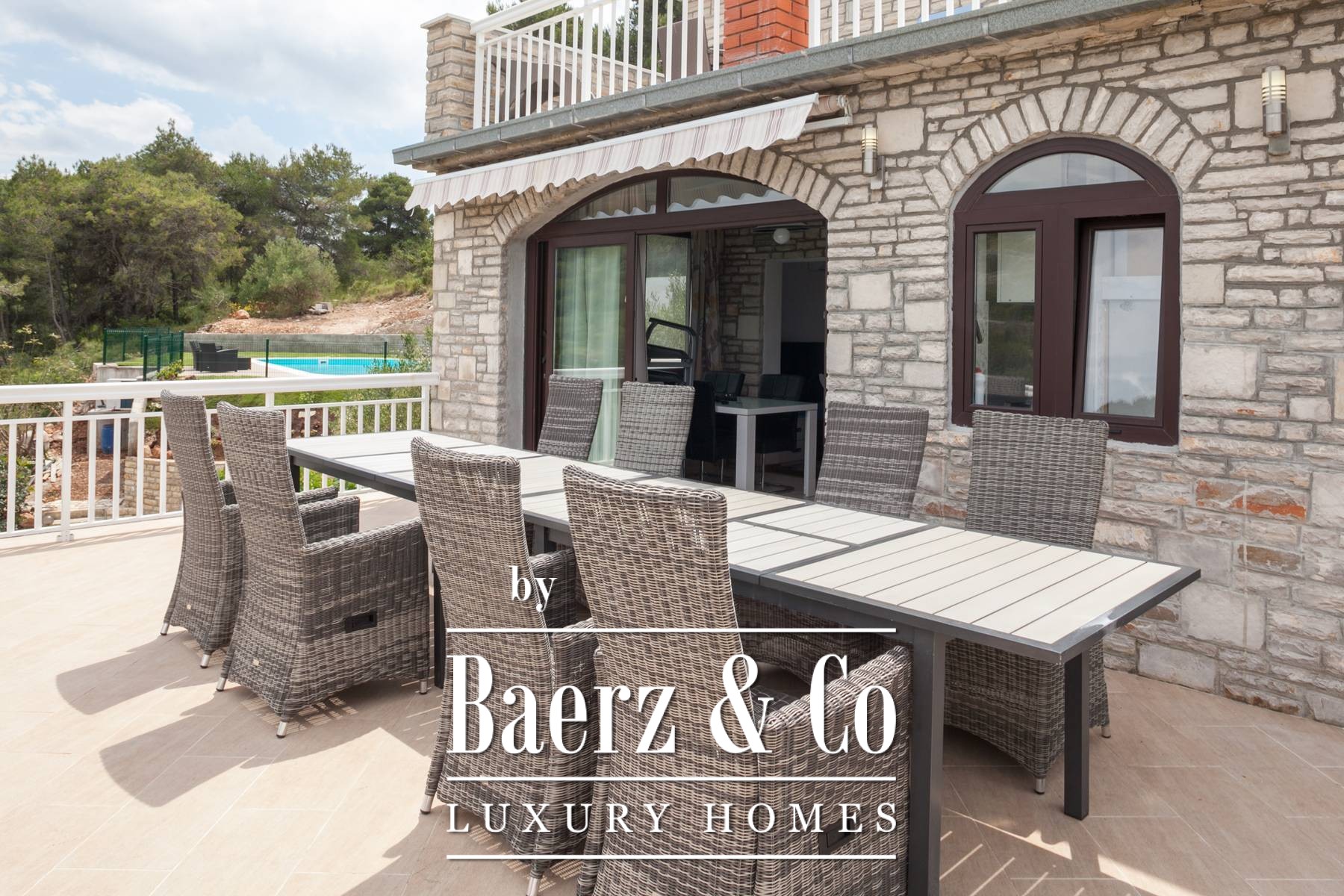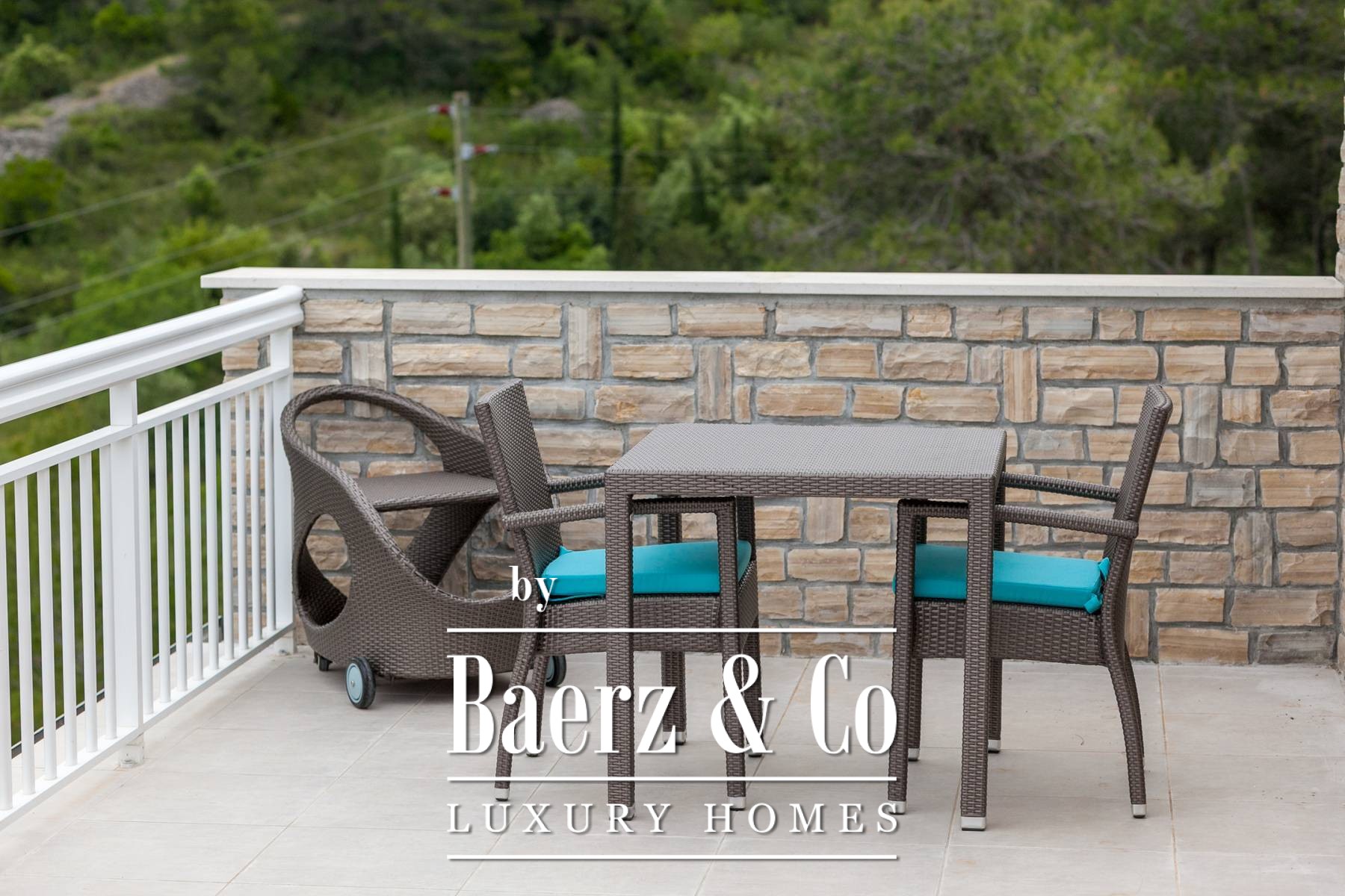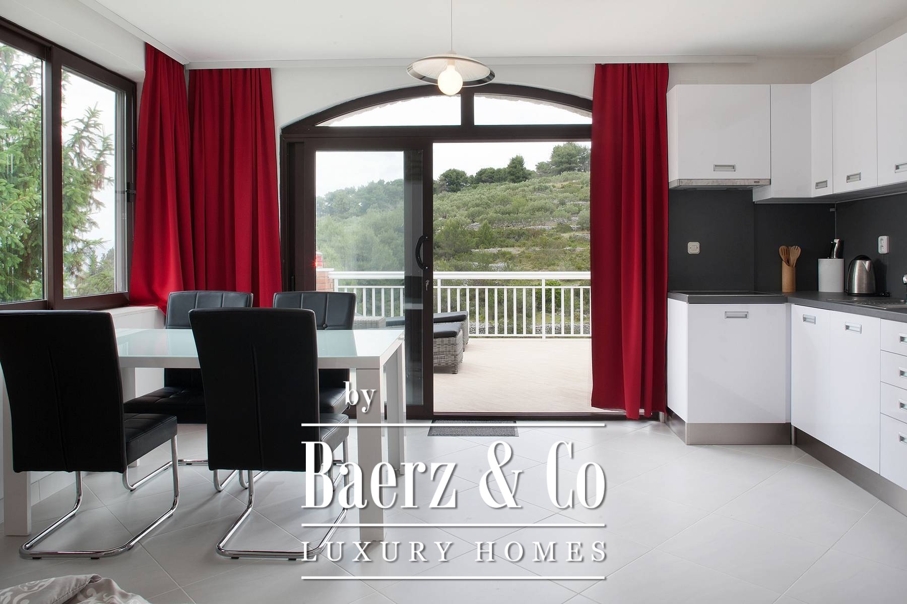 Stone villa built in Mediterranean style, oriented towards the sea, located on a plot of land of 3123 m2. It consists of 5 fully equipped apartments, two each on the first and second floors, and one on the third. Each apartment has a terrace of 40 m2 with a barbecue. On the ground floor of the building there is a garage with three parking spaces, and an outdoor parking lot with 10 parking spaces.