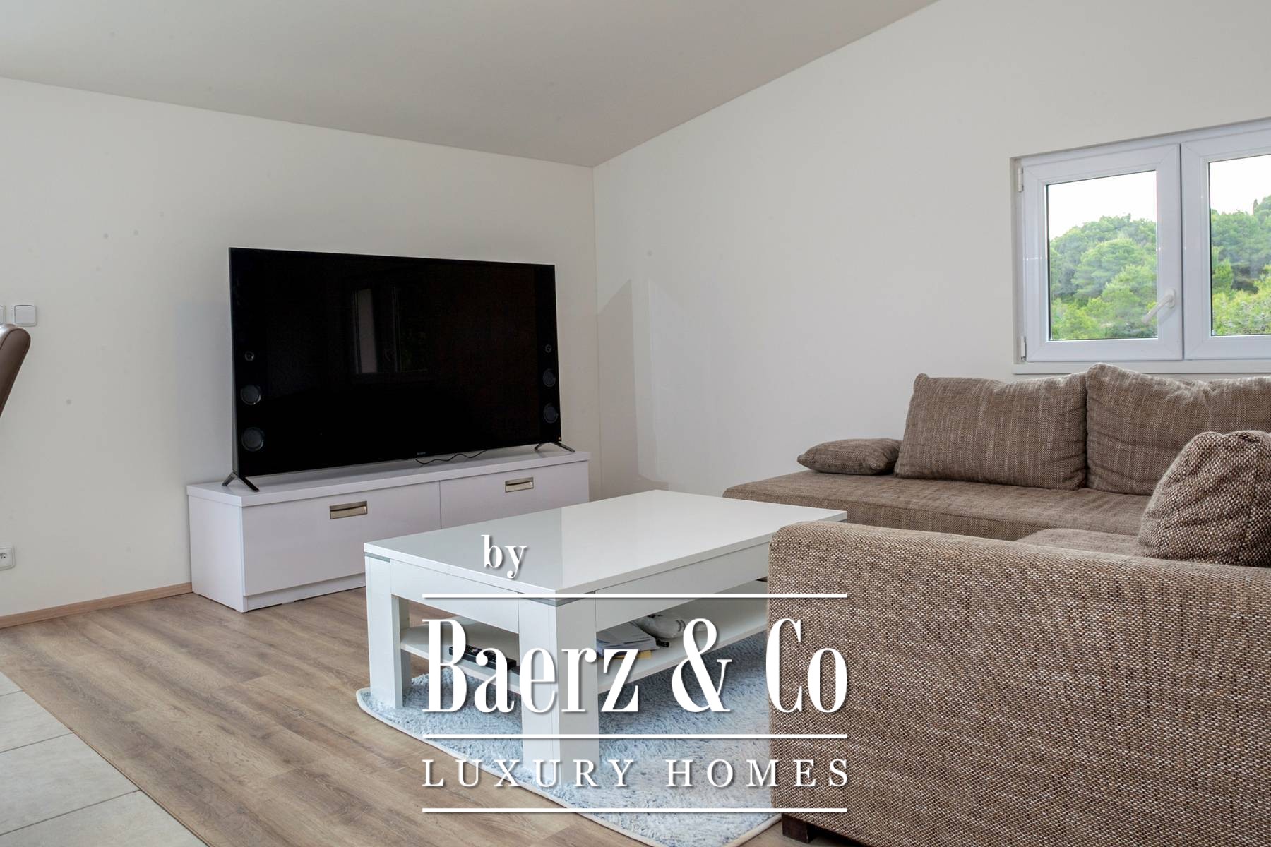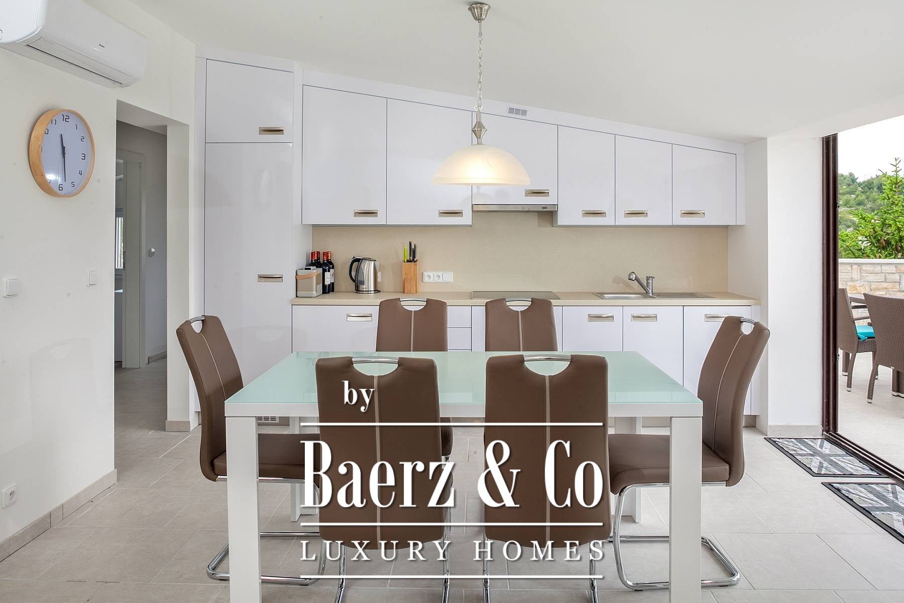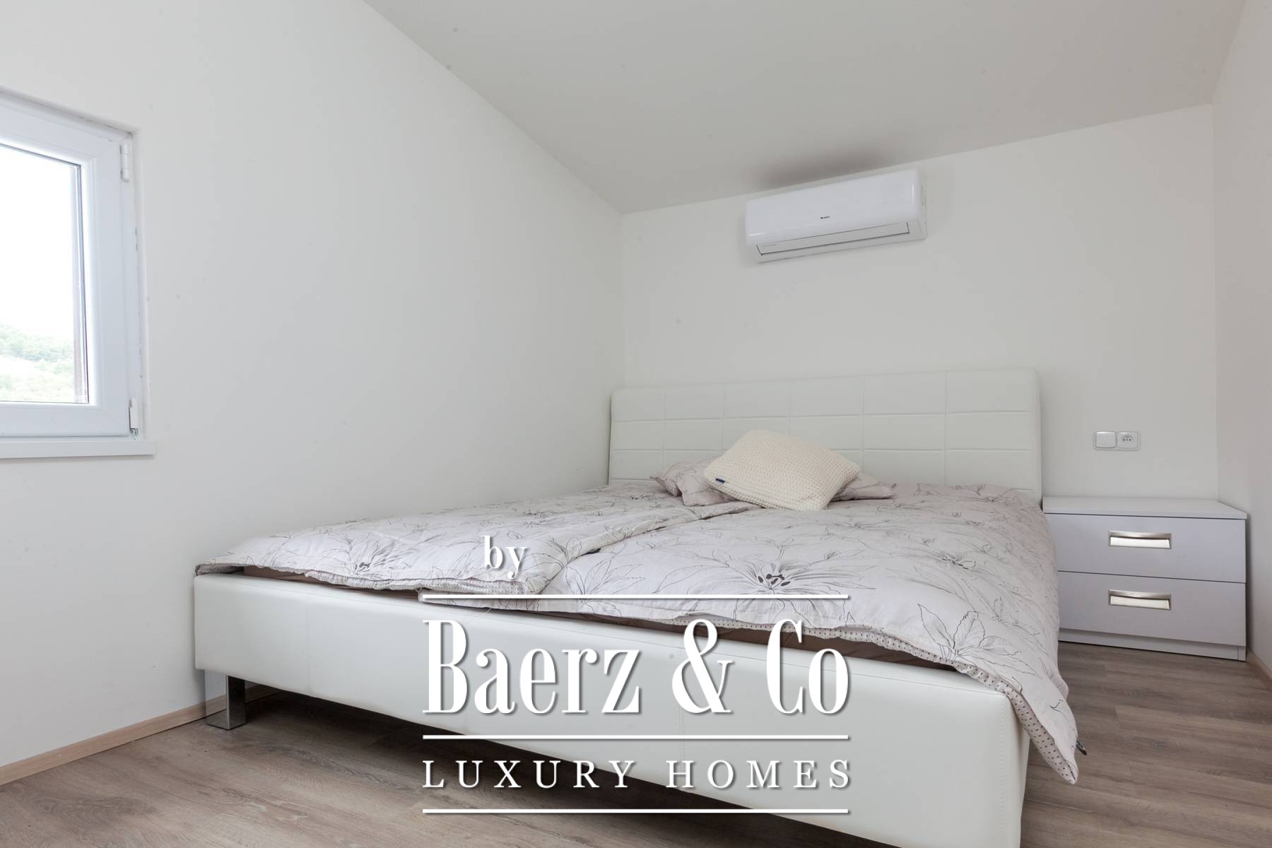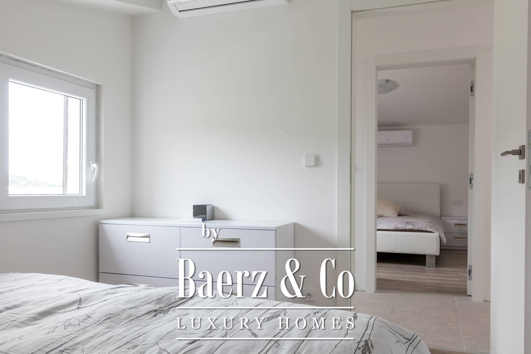 Stone villa built in Mediterranean style, oriented towards the sea, located on a plot of land of 3123 m2. It consists of 5 fully equipped apartments, two each on the first and second floors, and one on the third. Each apartment has a terrace of 40 m2 with a barbecue. On the ground floor of the building there is a garage with three parking spaces, and an outdoor parking lot with 10 parking spaces.