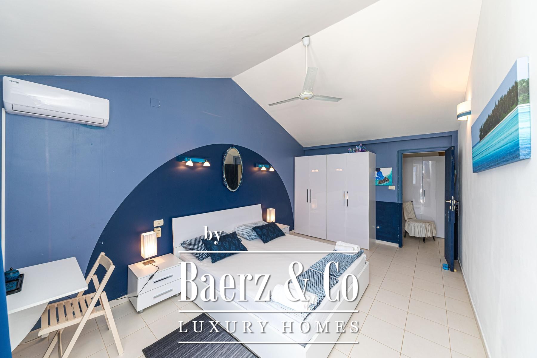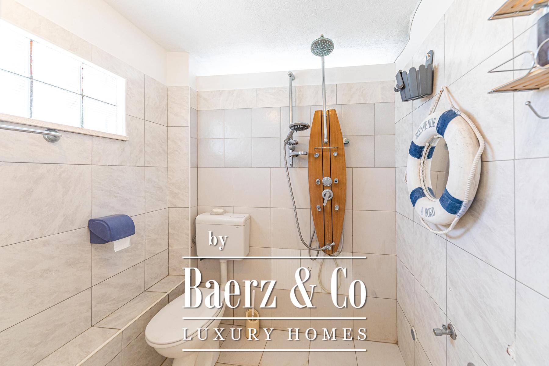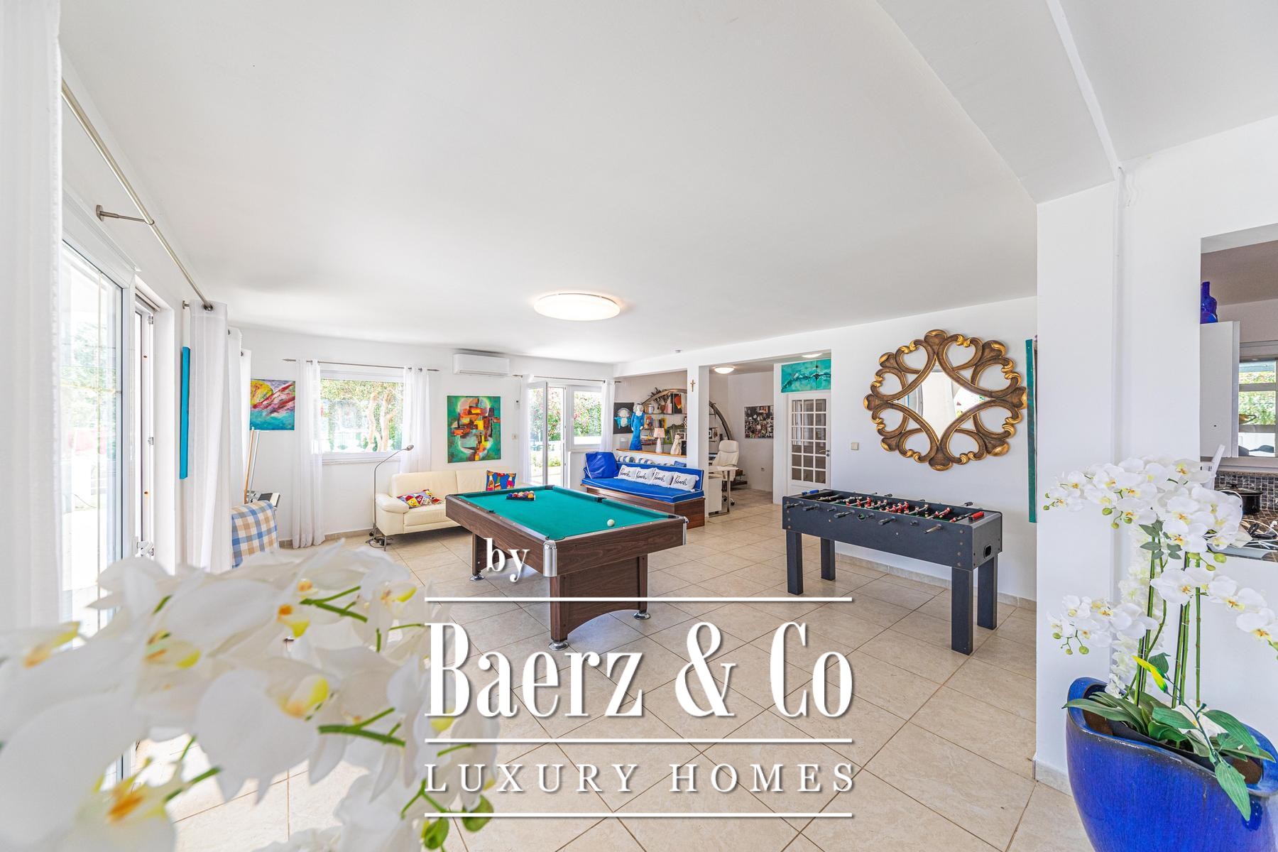 Expansive living spaces open seamlessly onto two terraces, each area crafted to frame sea views and accommodate dining, relaxation, and open-air grilling. A swimming pool, bordered by dedicated barbecue and lounge zones, lends an understated sense of retreat. Beneath these terraces, a further garage and dedicated storage open directly to the beach, offering discreet spaces for boats, water sports equipment, and sun loungers.