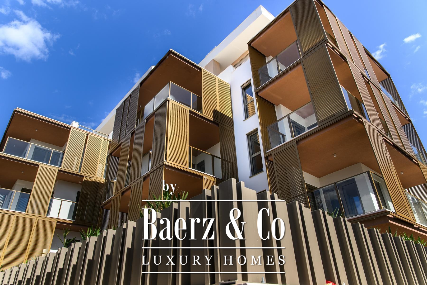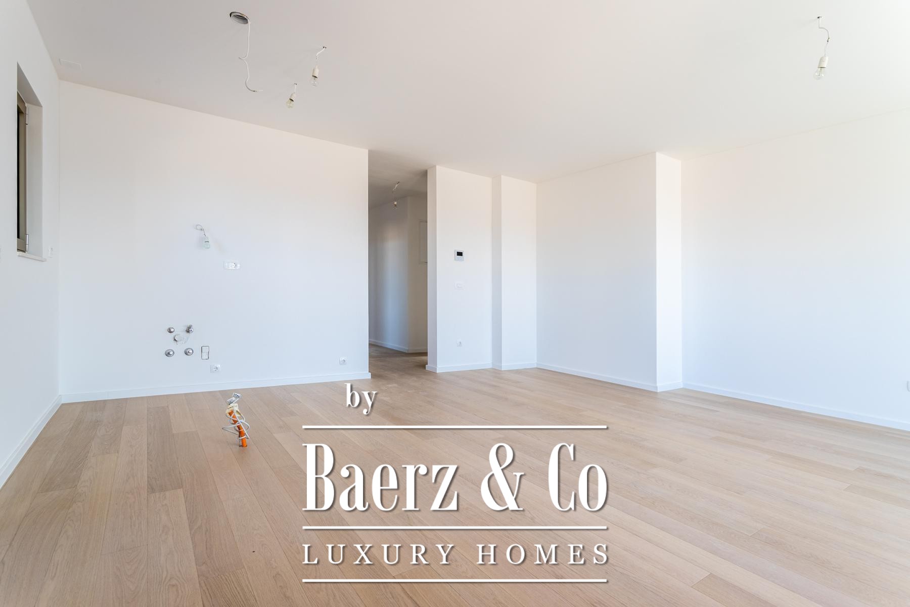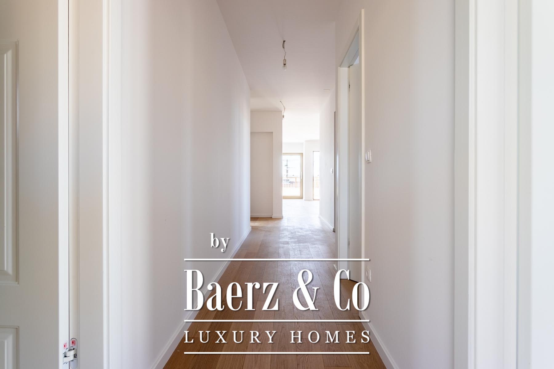 Each aspect of the apartment reflects considered quality, from individual air conditioning units in every room to underfloor heating in both bathrooms. Villeroy & Boch sanitary ware, Hansgrohe fixtures, and electric blinds bring architectural detail and tactile comfort. The building carries an A+ energy certificate and is served by an Otis lift, with common areas finished in stone and premium ceramics.