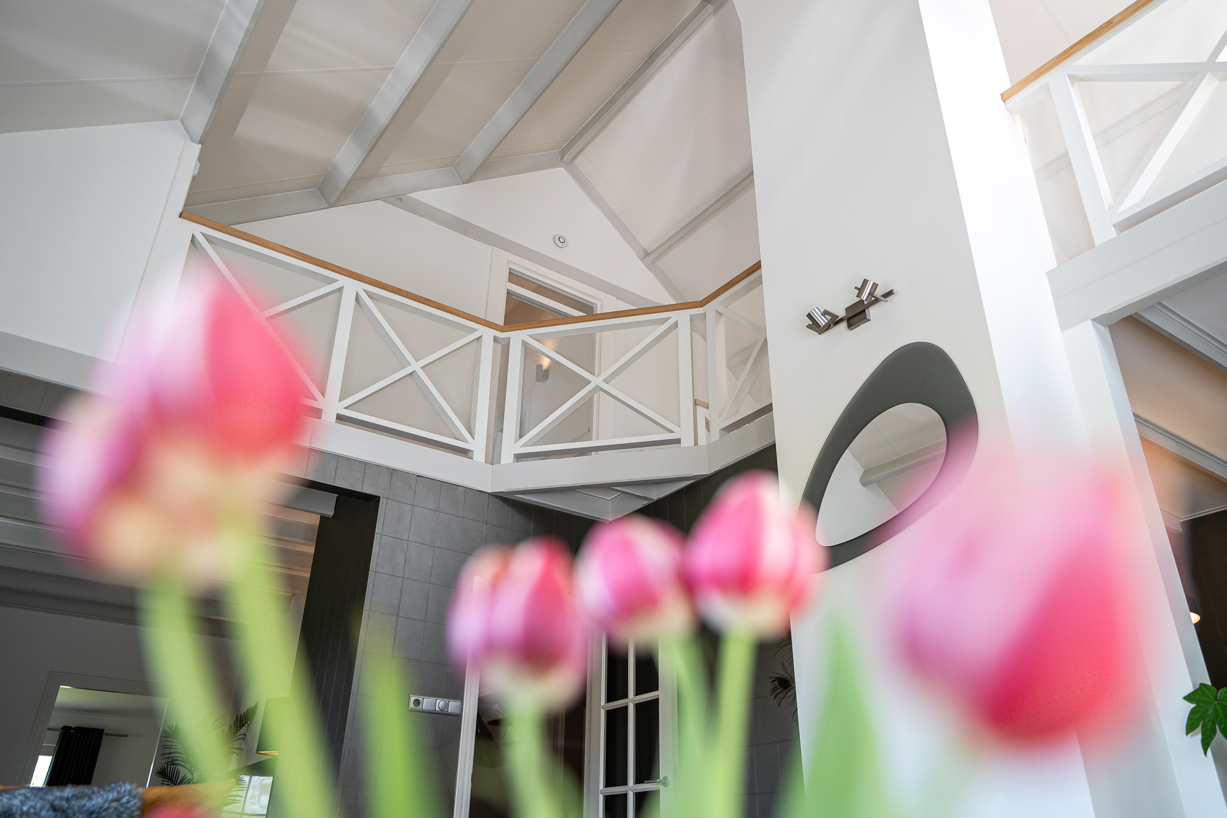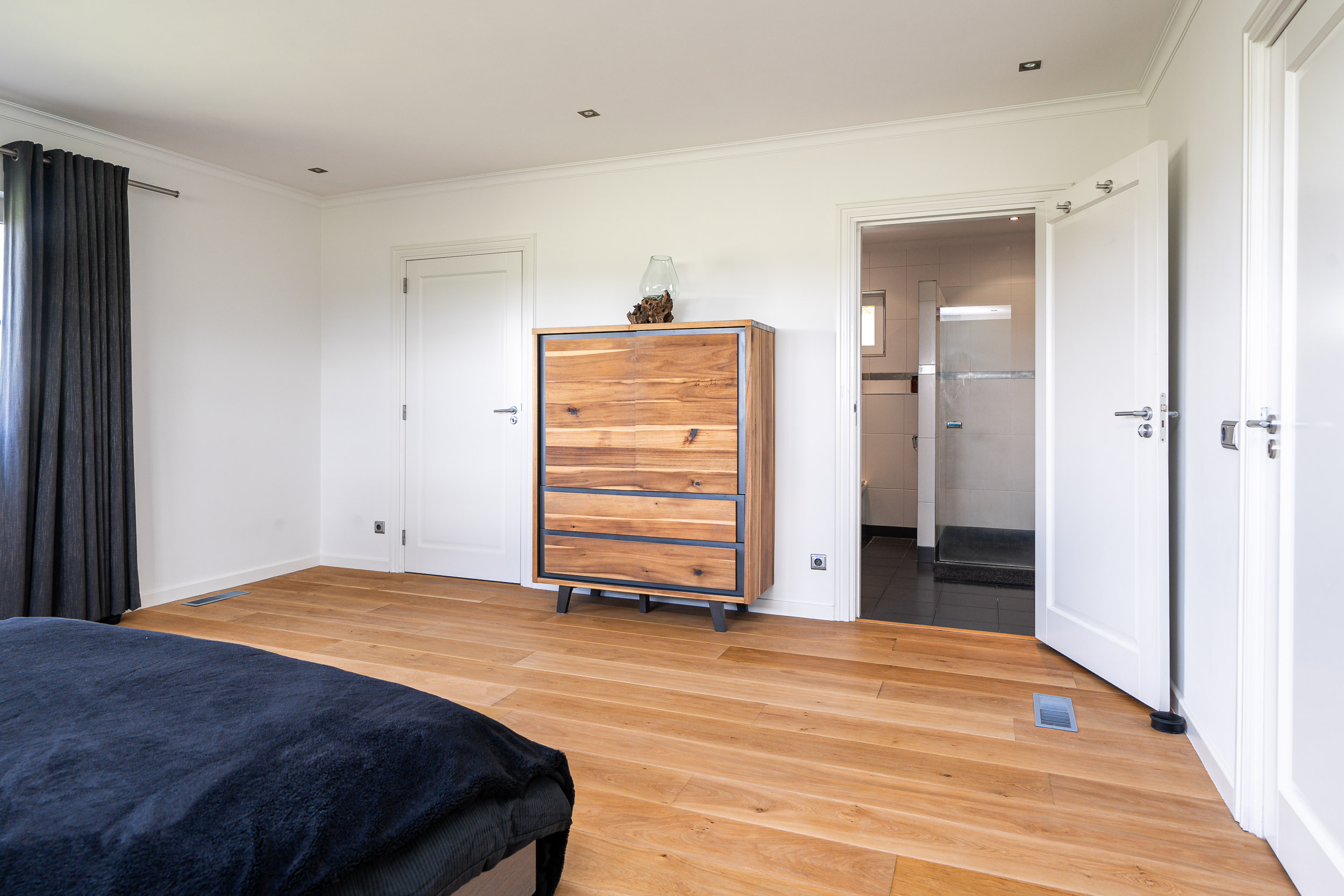 The living room is bathed in natural light due to the large windows and mezzanine, with each window offering views focused on the surrounding nature. The breathtaking panoramas never cease to amaze. The living room has various cozy corners, including a seating area around the wood-burning stove, an entertainment nook, and a dining area. A beautiful warm wooden floor with warm air heating runs throughout, and the French doors open directly onto the inviting veranda and terrace, which ensure complete privacy.