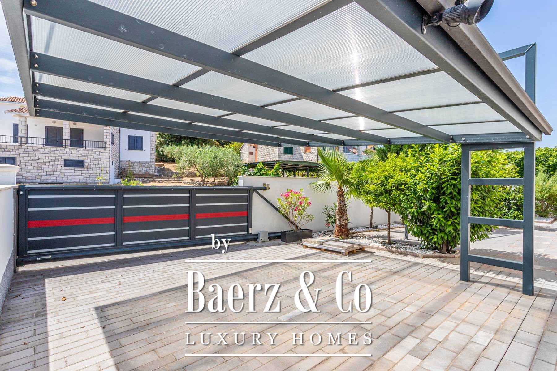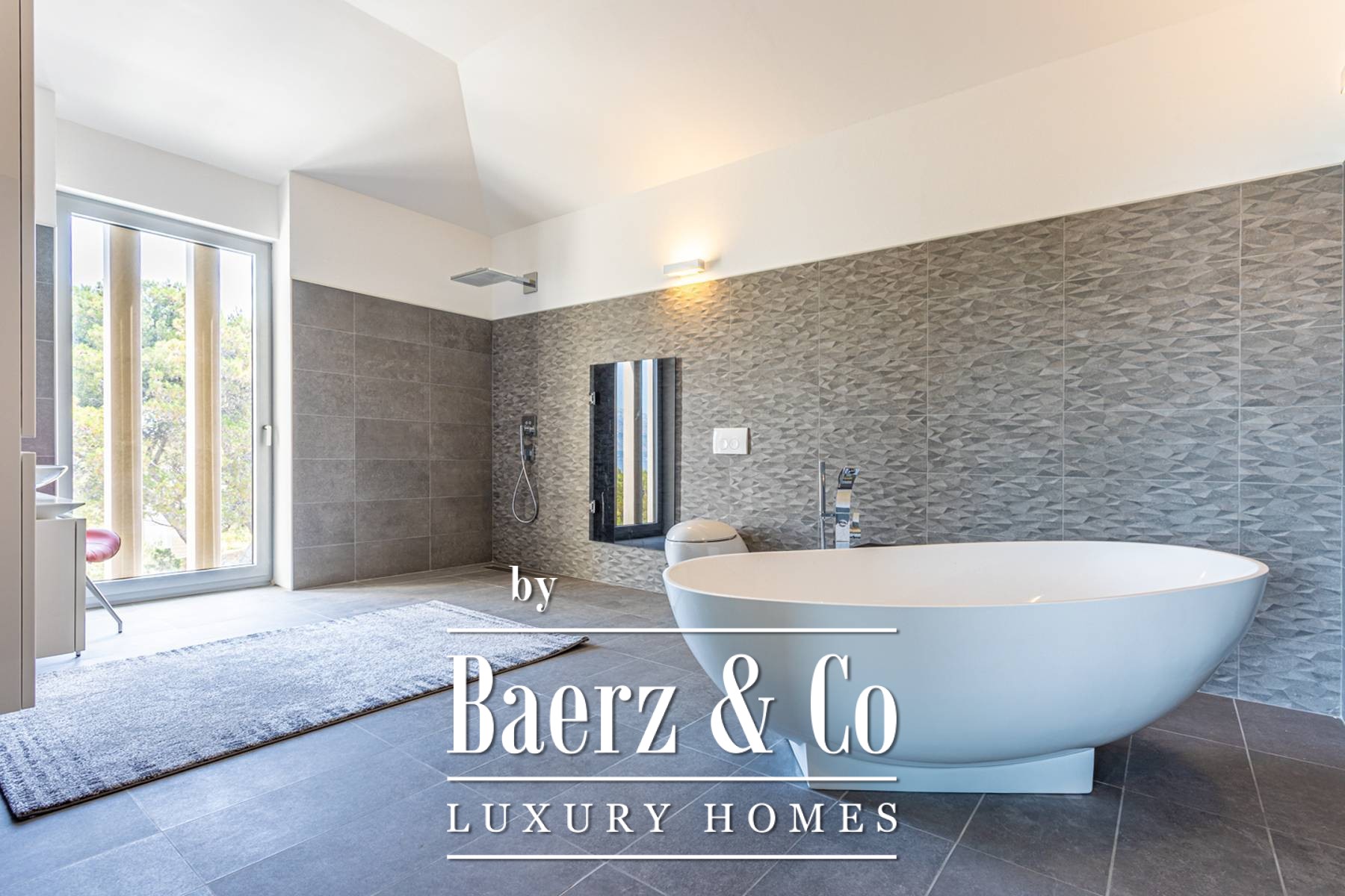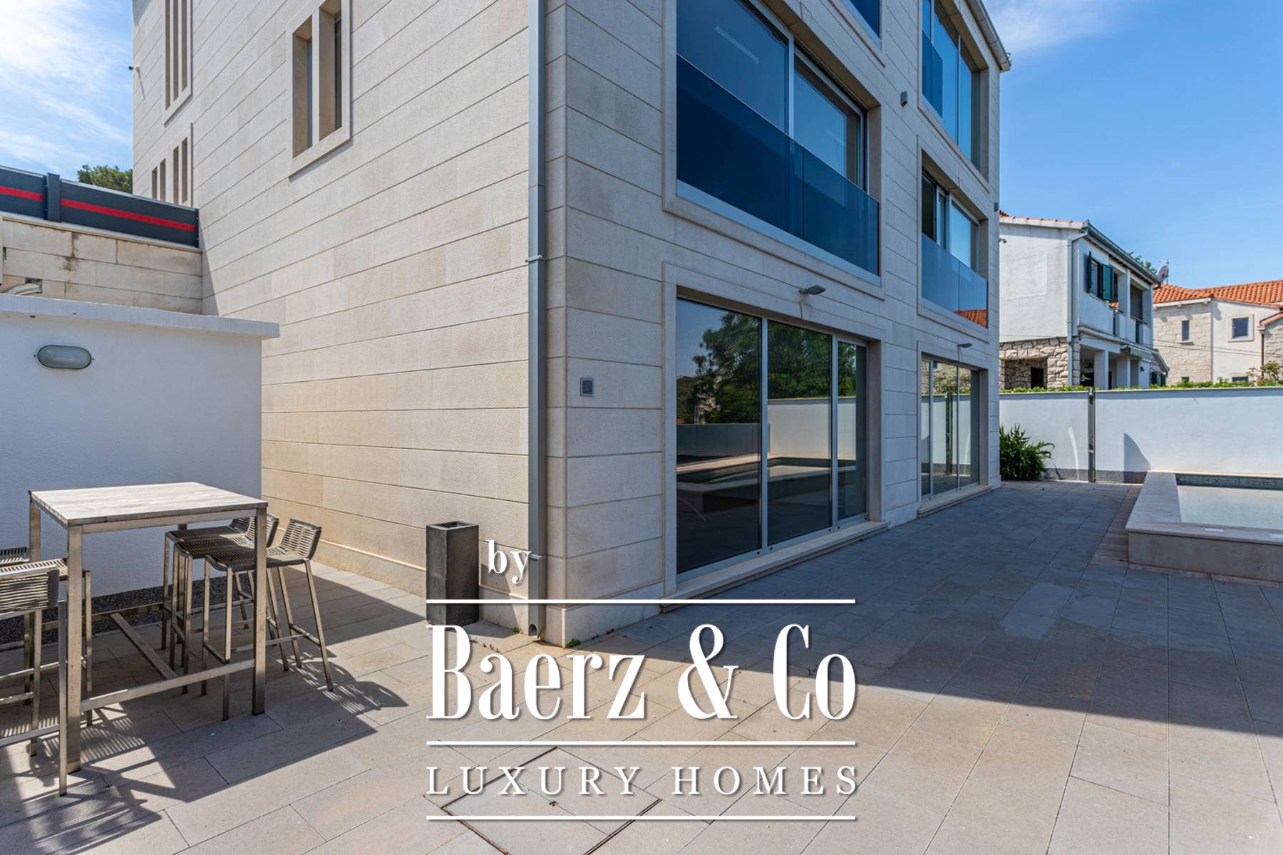 Brac, an elegant villa located in a small, romantic fishing village on the north side of the island of Brac. It is characterized by simplicity and quality.It spreads over three floors, NKP of 337.25 m2, with a garden of 290 m2. It has a total of 4 bedrooms, 4 bathrooms, living room, kitchen and dining room.Since the building is on slightly sloping ground, that is, the first floor is at the level of the street, the main entrance into the house is there. On a side of the building there are stairs leading down from the upper terrace to the lower one, swimming pool and side entrance to the basement of the building. In the basement, there are a spacious hall, two apartments with bathrooms for guests and a drawing room from which inner stairs lead from the basement to the the first i.e. medium floor (mezzanine). At medium (mezzanine) floor there is a very spacious living room (app 80 m2). There is also a reception hall and a toilette for guests. From the first, medium floor, very wide steps lead to the second and last floor. Considering that relaxation and good sleep are essential in human life, the building investors have paid special attention to bedrooms