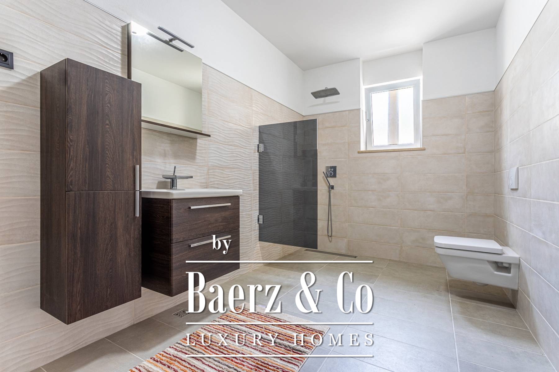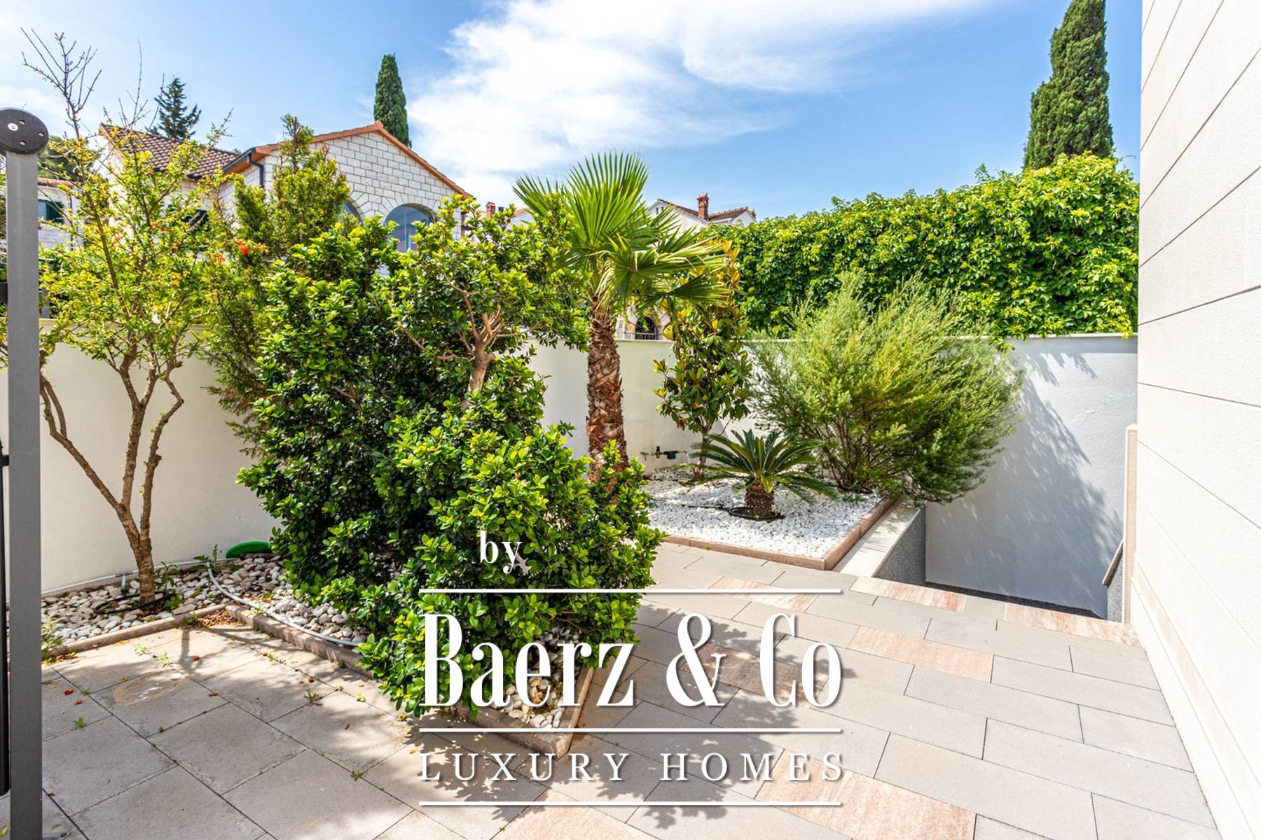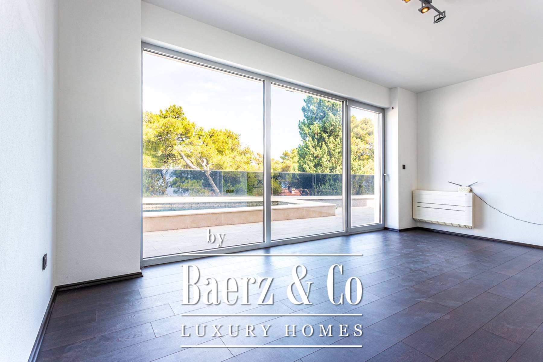 Brac, an elegant villa located in a small, romantic fishing village on the north side of the island of Brac. It is characterized by simplicity and quality.It spreads over three floors, NKP of 337.25 m2, with a garden of 290 m2. It has a total of 4 bedrooms, 4 bathrooms, living room, kitchen and dining room.Since the building is on slightly sloping ground, that is, the first floor is at the level of the street, the main entrance into the house is there. On a side of the building there are stairs leading down from the upper terrace to the lower one, swimming pool and side entrance to the basement of the building. In the basement, there are a spacious hall, two apartments with bathrooms for guests and a drawing room from which inner stairs lead from the basement to the the first i.e. medium floor (mezzanine). At medium (mezzanine) floor there is a very spacious living room (app 80 m2). There is also a reception hall and a toilette for guests. From the first, medium floor, very wide steps lead to the second and last floor. Considering that relaxation and good sleep are essential in human life, the building investors have paid special attention to bedrooms