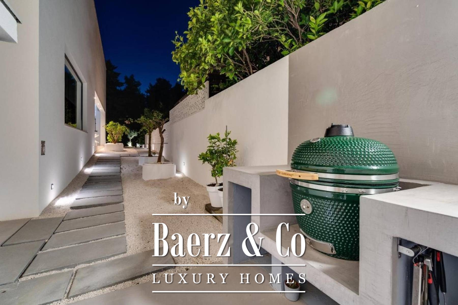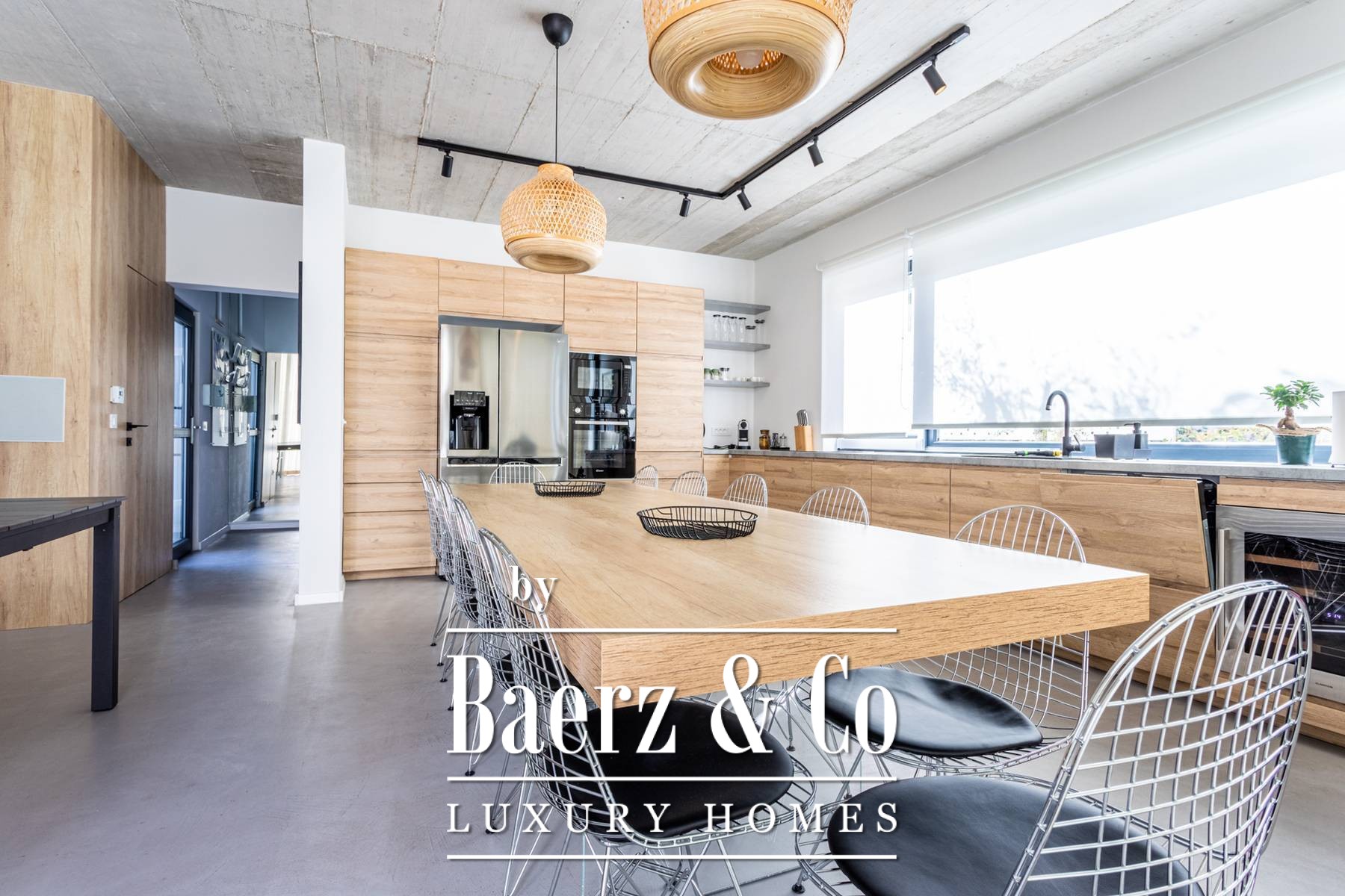 The property’s five bedrooms, including four en suite bathrooms, are complemented by an open layout integrating kitchen, dining and living spaces. A dedicated office area of 25 m² crowns the top floor, offering a peaceful vantage point for remote work or quiet reflection. The wellness area is anchored by a Finnish sauna, toilet and shower, expanding seamlessly to an outdoor heated pool, sun deck and shaded dining terrace.