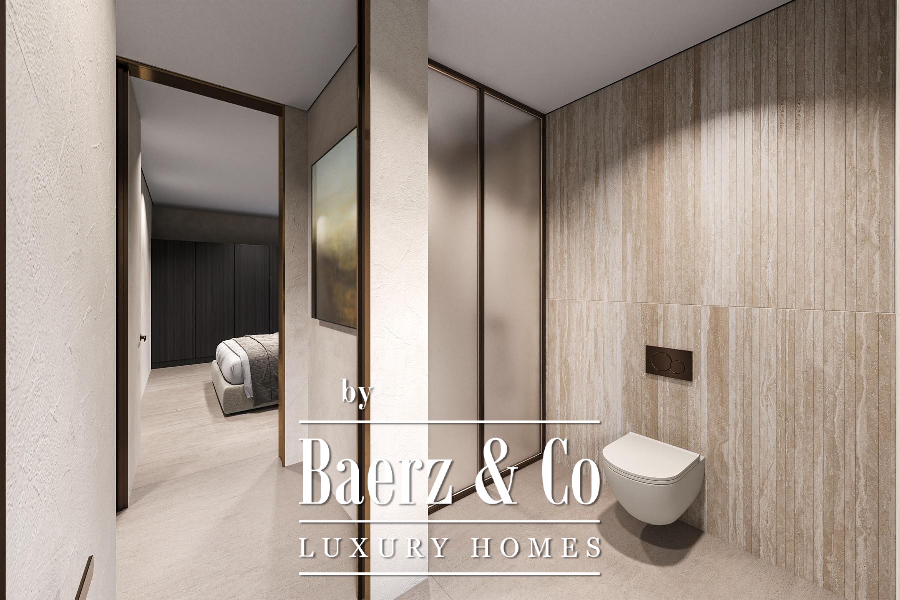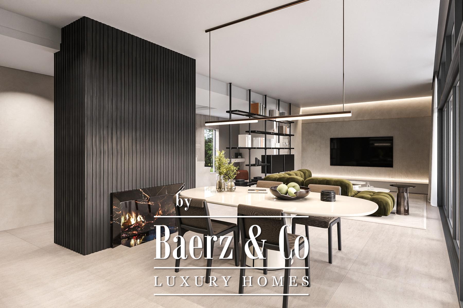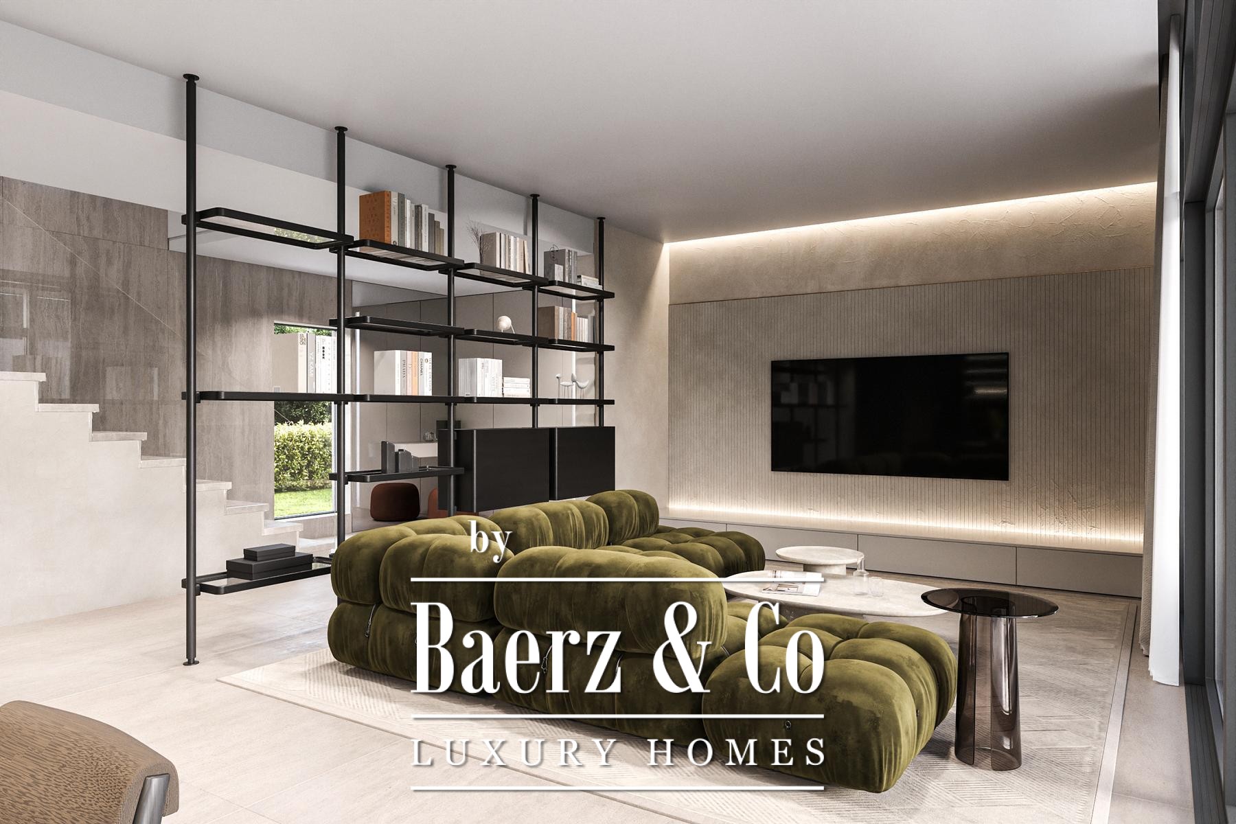The ground floor introduces an open flow between the kitchen, dining, and living spaces, complemented by a bedroom, bathroom, laundry, technical storage, and wardrobe. Ascend to the upper floor for three individually en suite bedrooms, each maintaining privacy while framing gentle views of the manicured garden.