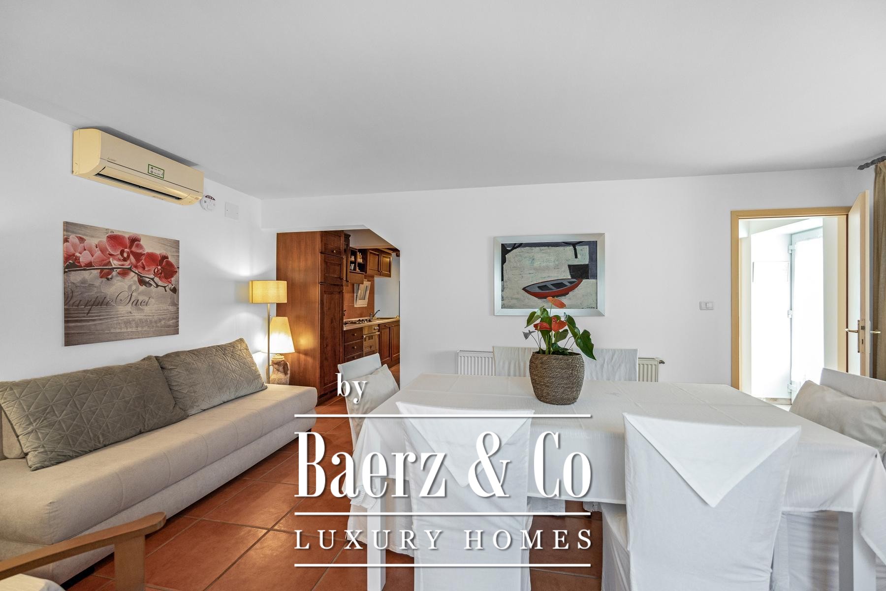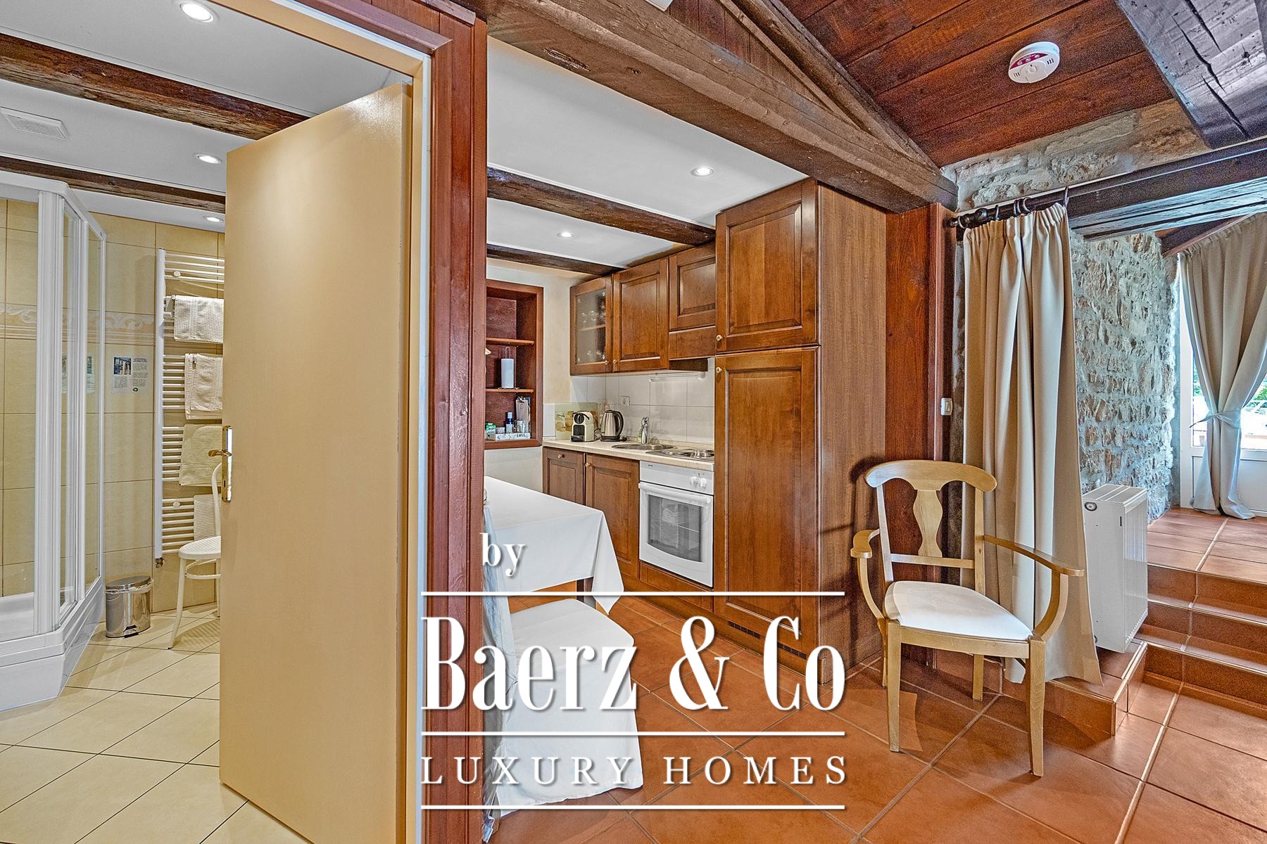 The second house, rising across four floors, brings together rustic conviviality and functional elegance with its summer kitchen, traditional bread oven, tavern, fireplaces, and ample terraces. Private bedroom suites are placed across upper floors, with the attic offering further living and retreat spaces.