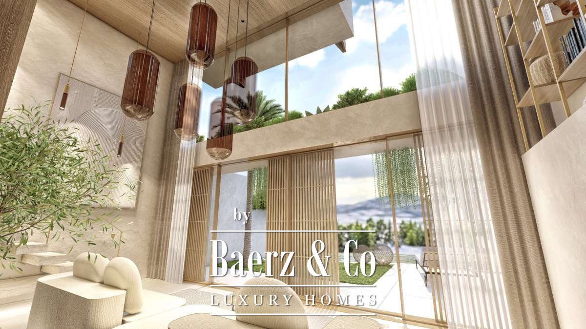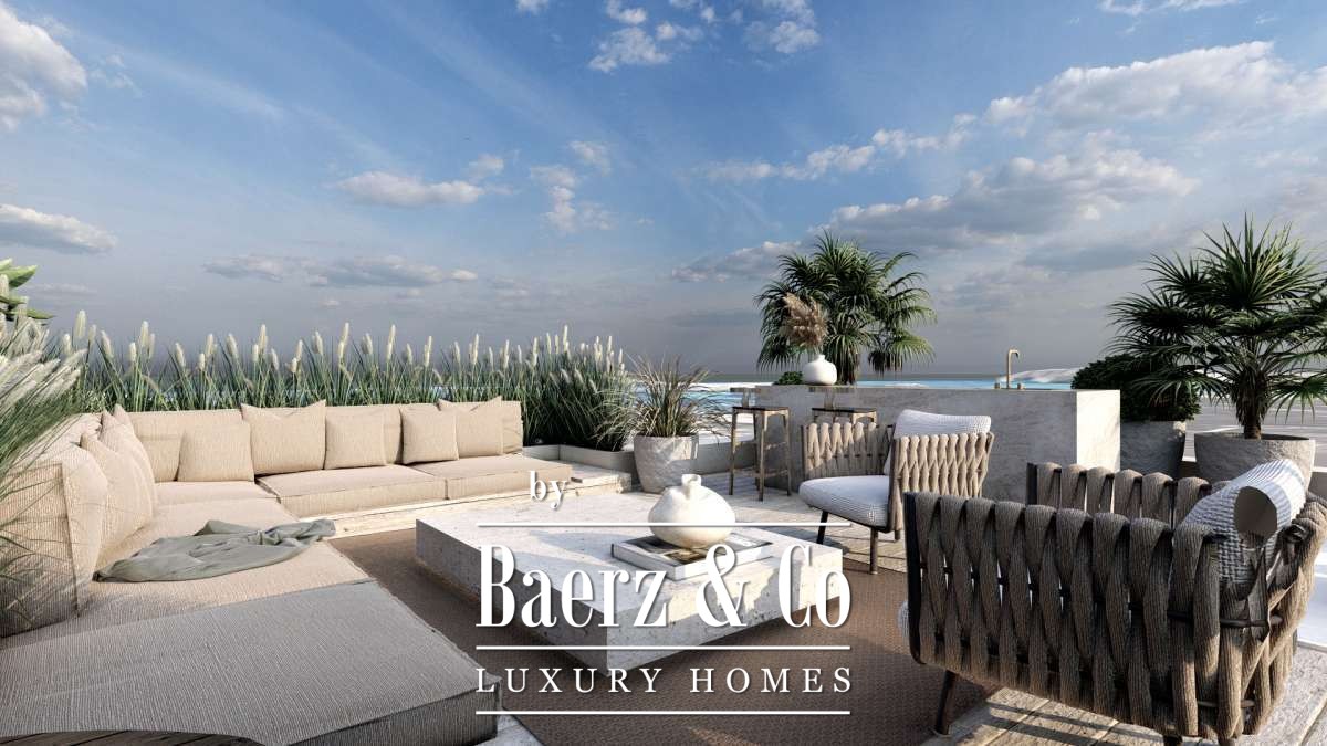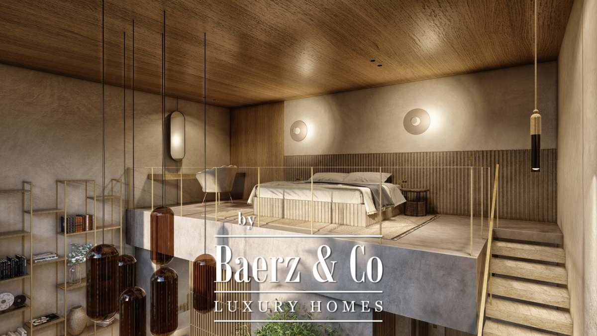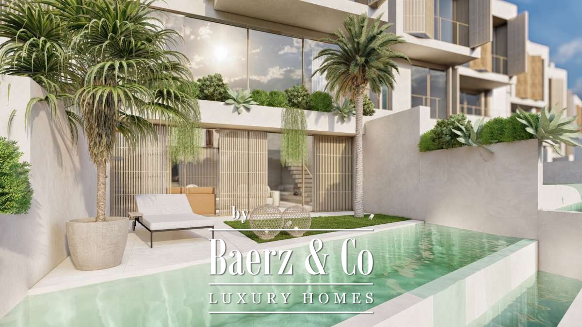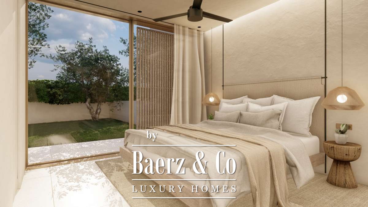 Each bedroom also has a chic bathroom with a spacious walk-in rain shower. The spacious kitchen is fully equipped and has superior built-in appliances. There is a cooking island so you can sit at the bar if you wish. The bedroom is spacious, again with lots of light and facilitates a heavenly bed. All sixteen apartments are different from each other and have something unique. However, these are all furnished in exactly the same style, which ensures a unified feeling. Also because of the light colors and the well-considered materials used, you will experience the typical Ibiza feeling when you are in this luxurious home.The outdoor spacesThe outdoor spaces of the Torres Heights apartments have been specially landscaped with the mindset of reflecting an outdoor lifestyle. The architect tries to reflect the surrounding nature of Ibiza in the adjoining garden of the room. The typical palm trees in combination with wild sea grasses respect the environment and at the same time represent the Mediterranean feeling. The soft grass also provides daily grounding, which is very important today. Each garden has a nice swimming pool where you can take a refreshing dip. The pool is surrounded by various seating and lying options. There are several sunbeds, but there is also a lounge set, a spacious dining table with matching chairs and, on occasion, an outdoor bar. The atmosphere and decoration of the outdoor areas also applies: everything completely in the minimalist, modern, unmoved Ibiza feeling.
