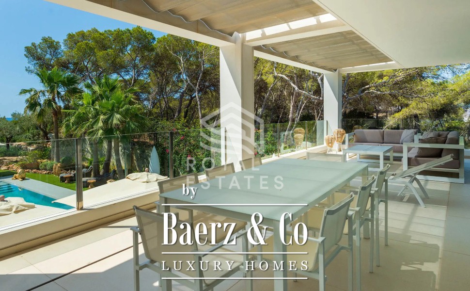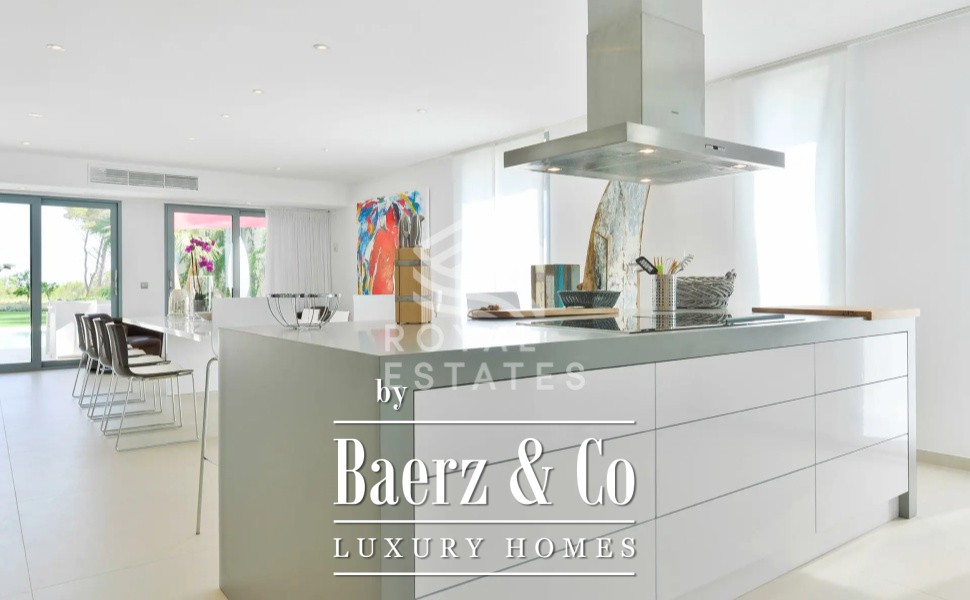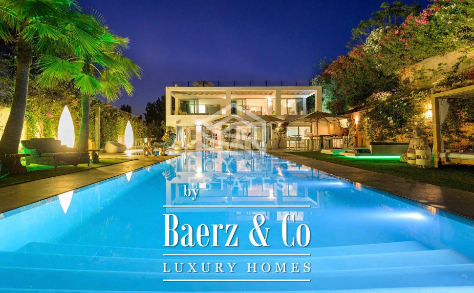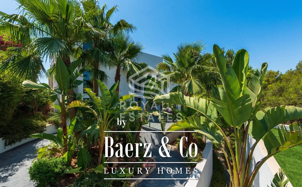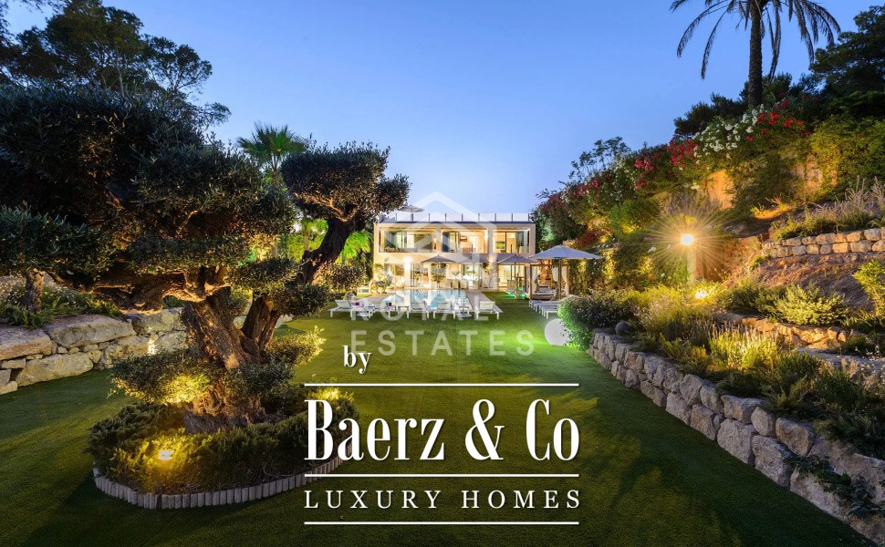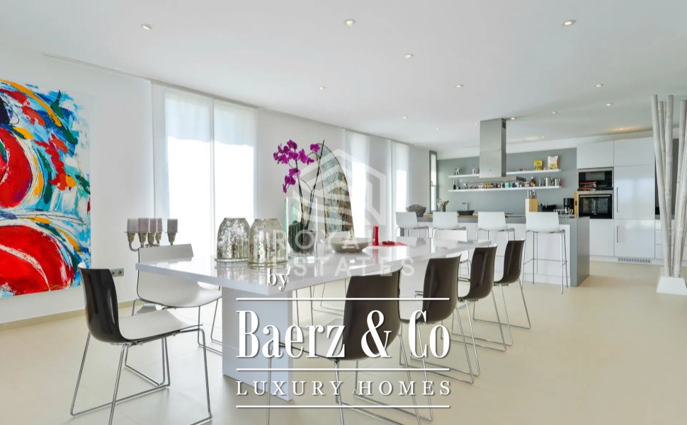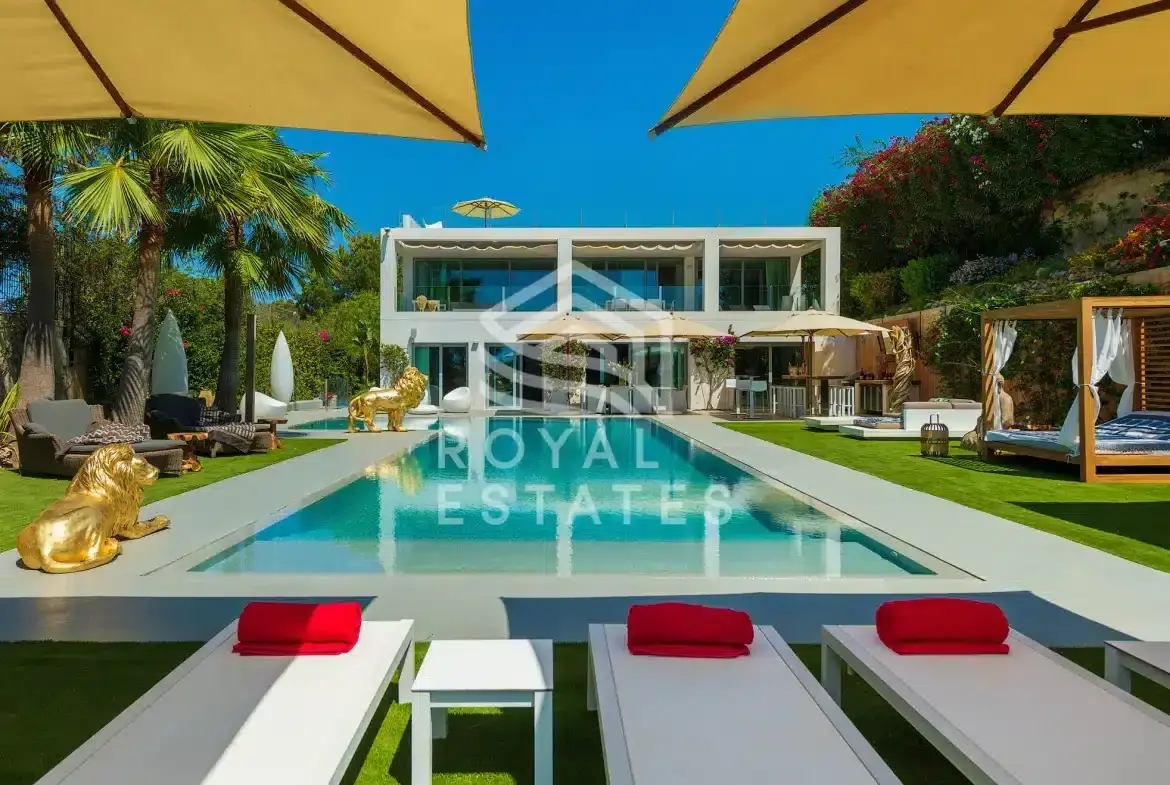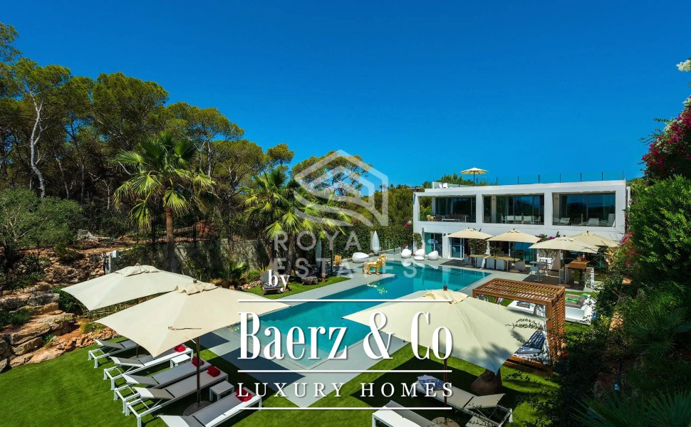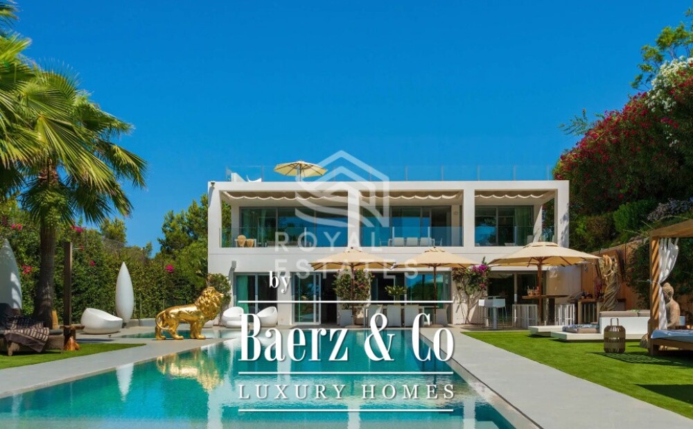 The villa comprises nine bedrooms and seven bathrooms, including two guest houses, each with two bedrooms and a bathroom, ensuring privacy for residents and visitors alike. A spectacular gym, studio, and rooftop terrace crown the upper level, while advanced amenities—central zoned air conditioning, underfloor heating, solar panels, sophisticated lighting, and alarm system—provide comfort and security. The 1,830 m² plot includes a double garage, multiple chill-out areas, and an elegant bar and barbecue, completing a sanctuary attuned to both leisure and discretion. This Villa Talamanca stands as a testament to refined Mediterranean living in a setting of unmatched serenity.