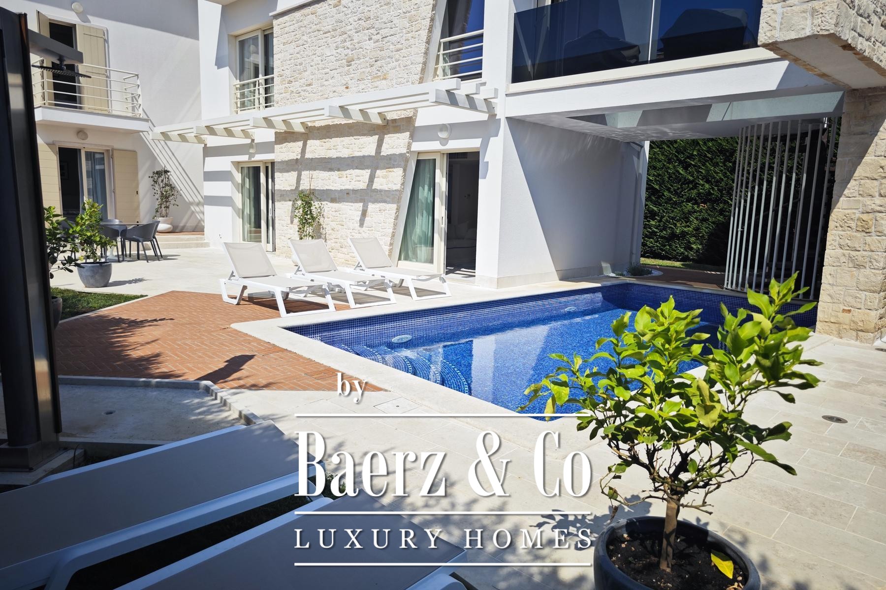 spacious outdoor terrace with views of neighboring villas and greenery, while the rooftop terrace truly opens up a spectacular sea view, providing unforgettable sunsets.The entire interior of the villa is meticulously furnished with the highest quality materials. The living area boasts warm wooden floors, while the bathrooms are adorned with elegant stone and high-quality Italian ceramics. Additional comfort and modernity are provided by the implemented 'smart home' system, allowing for easy control of various villa functions. Heating is provided by a fireplace, contributing to a cozy atmosphere. The exterior of the villa is equally impressive - in addition to the inviting swimming pool, there is a spacious garden and covered parking for multiple vehicles, ensuring convenience and security. Its east and south orientation ensures an abundance of natural light.The location of the villa is extremely advantageous; the nearest beaches are just a five-minute drive away. The surroundings are rich with quality restaurants, wineries, and various entertainment facilities, providing a vibrant social life and opportunities to explore local gastronomy and culture. This villa represents an ideal opportunity to purchase a luxurious home or an excellent investment. We invite you to contact us for additional information and to arrange a viewing of this exceptional property that offers a dream lifestyle in one of the most desirable locations in Istria.
