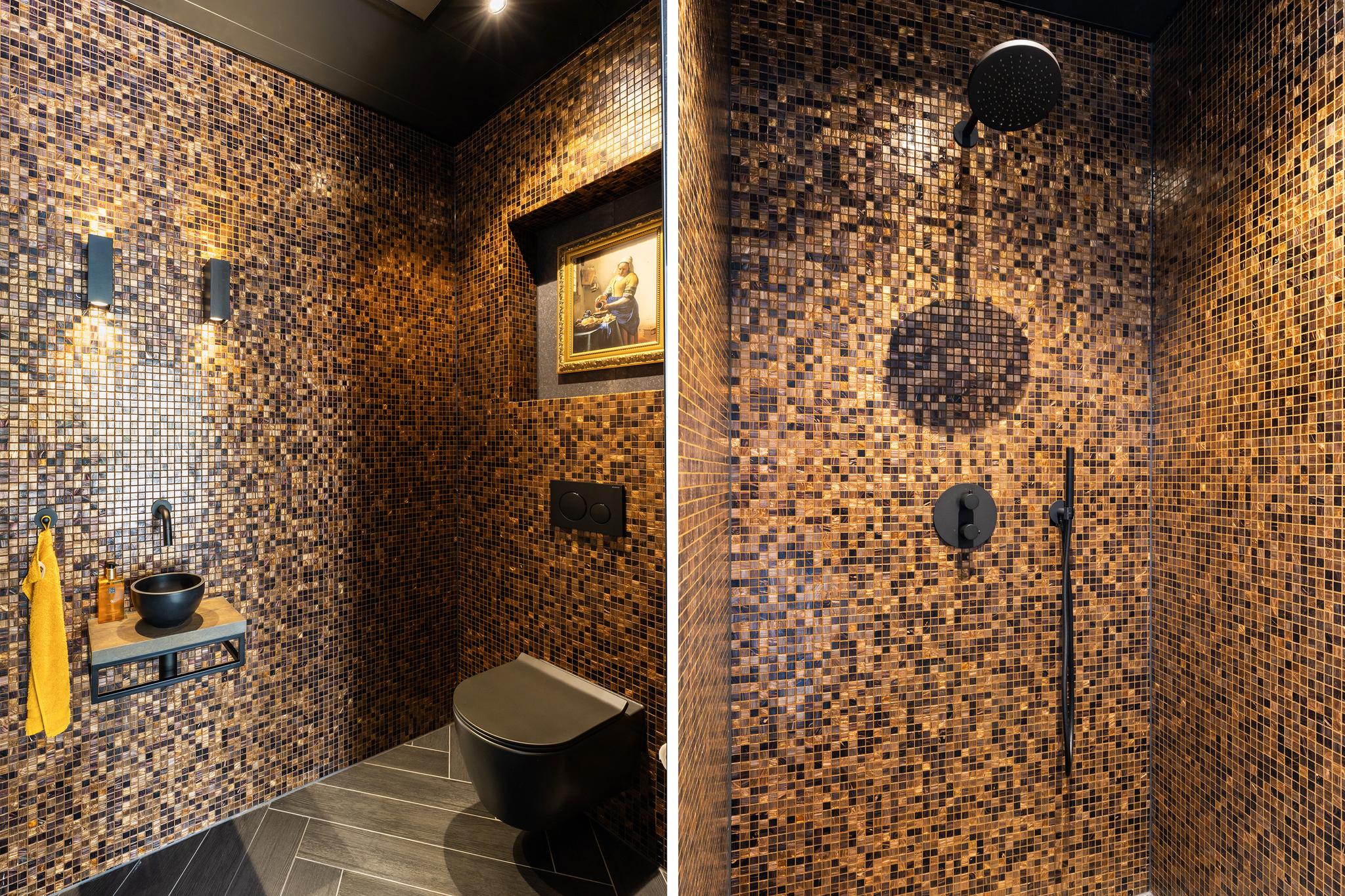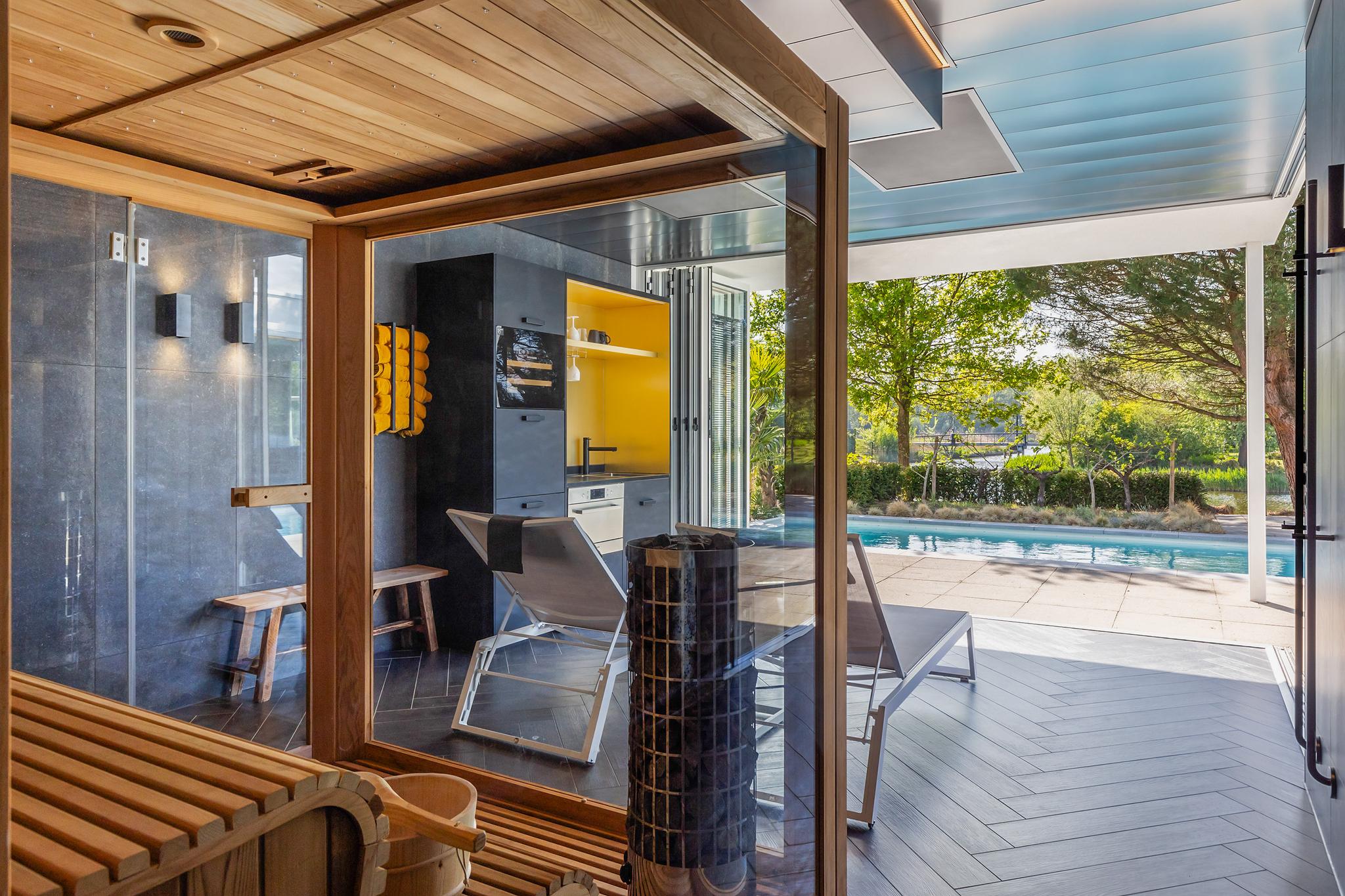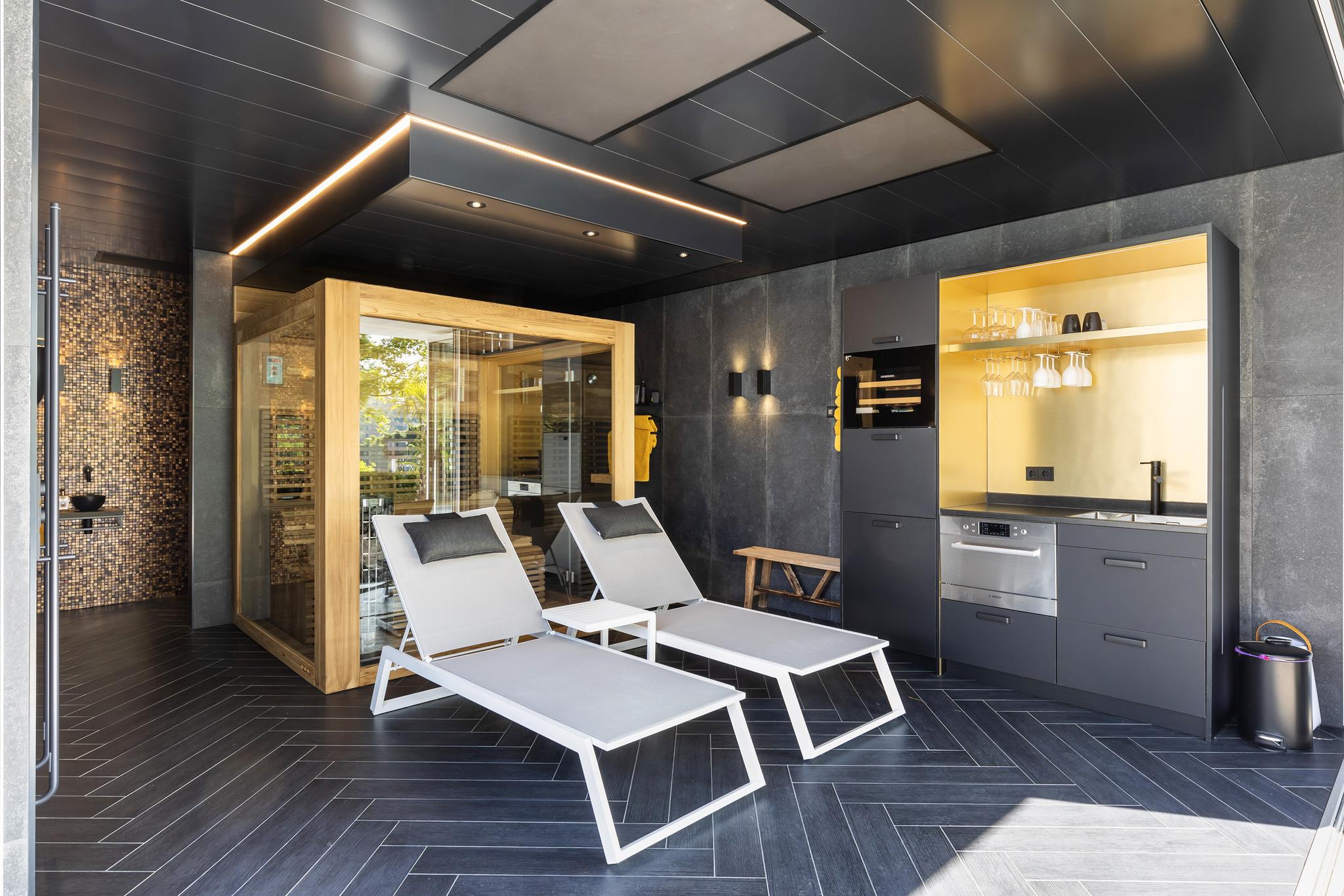 The architecturally cohesive pool house has sliding glass doors on two sides, allowing it to transform into a shaded summer veranda. Inside, dark tones and premium materials create an inviting setting. The kitchen includes a dishwasher, refrigerator, climate-controlled wine cabinet, sink and storage. The wellness area offers a four-person glass-walled sauna, suitable for both infrared and traditional use. A walk-in shower, WC and infrared-heated loungers complete the spa experience. Outside is a stainless-steel shower with both hand-held and rainfall heads. Technical installations are discreetly housed in the rear utility space.