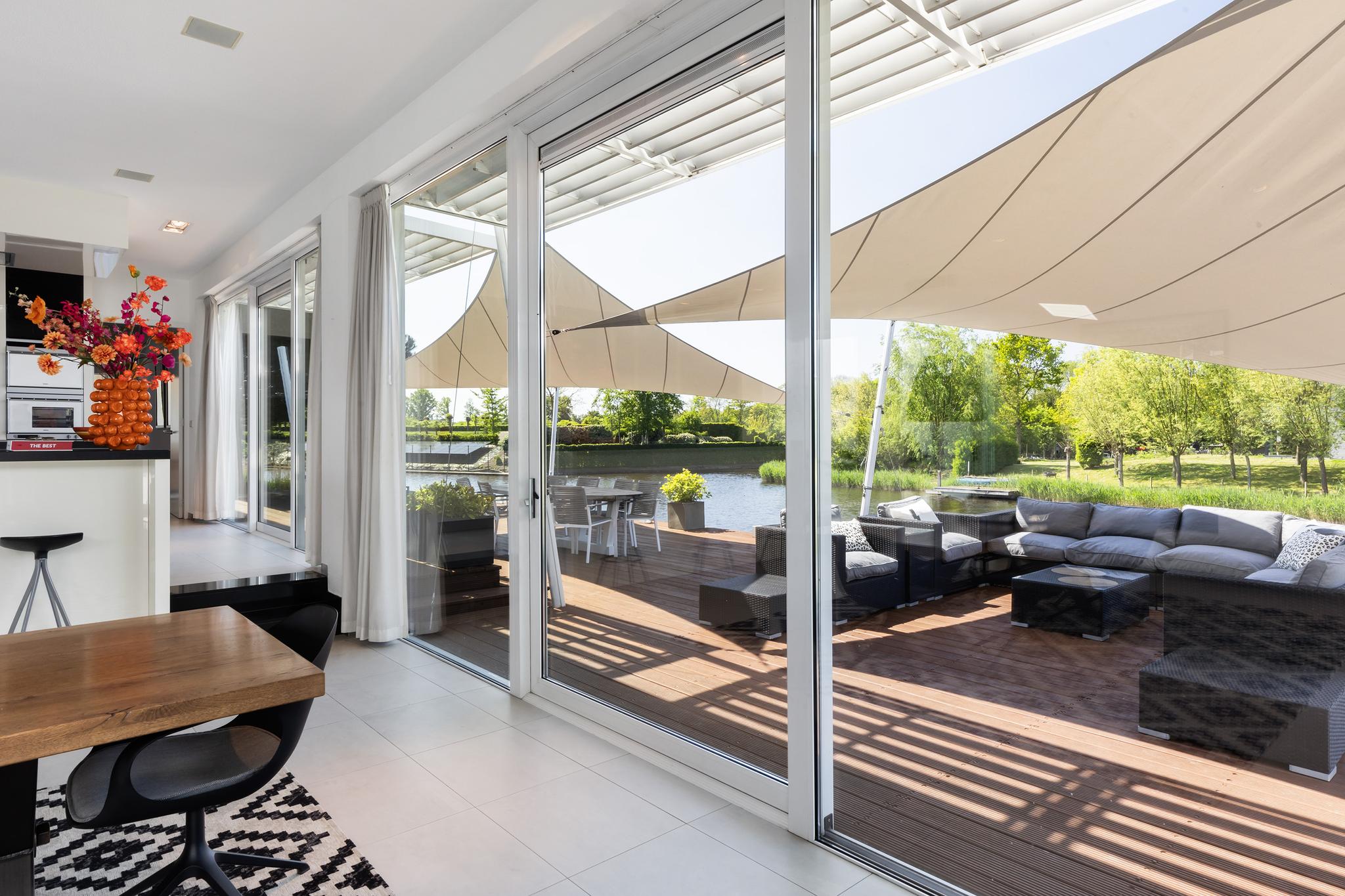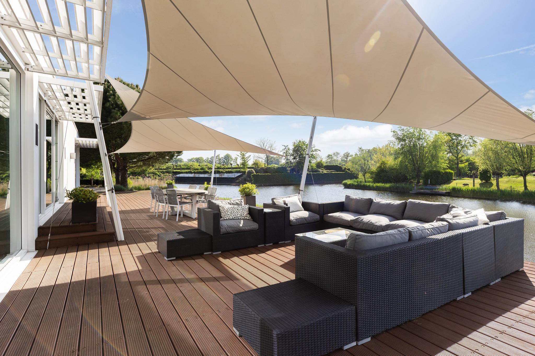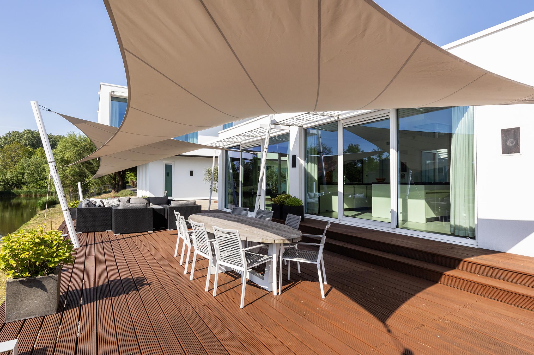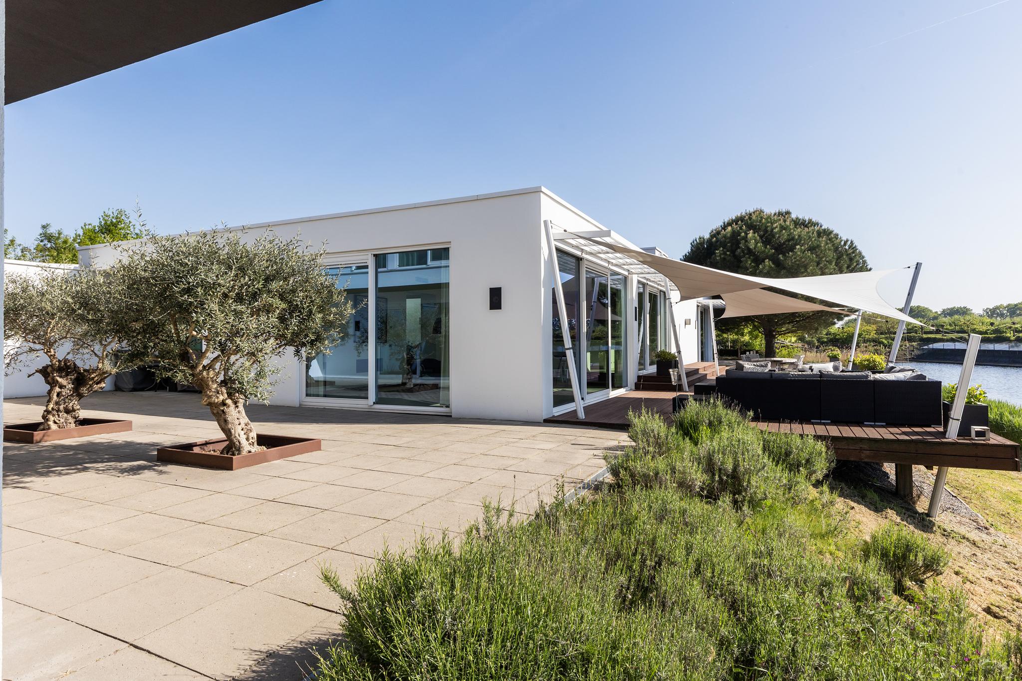 Access is via electric entrance gates. Several terraces surround the property, providing sun and shade throughout the day. Mature olive trees, tall pines and palms lend character and a Mediterranean atmosphere. The garden is low-maintenance with a neatly kept lawn, borders with drip irrigation and a private woodland with winding shell paths. The large wooden terrace adjacent to the open-plan kitchen-diner is built along the water’s edge, offering spectacular views. Shade is provided by two sail-style canopies, anchored to adjustable aluminium poles—creating an ideal setting to enjoy a coffee or chilled drink at any time of day.
