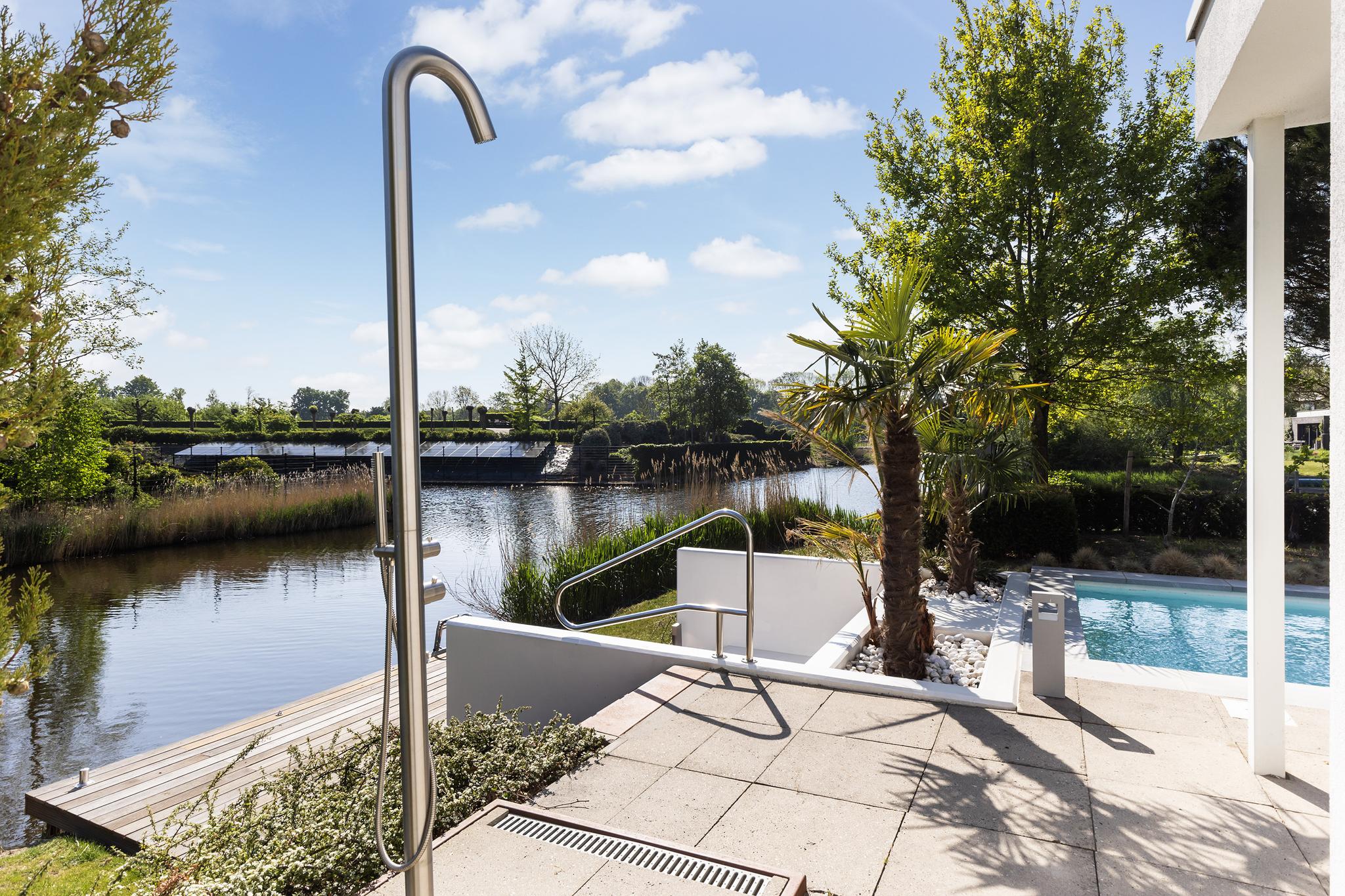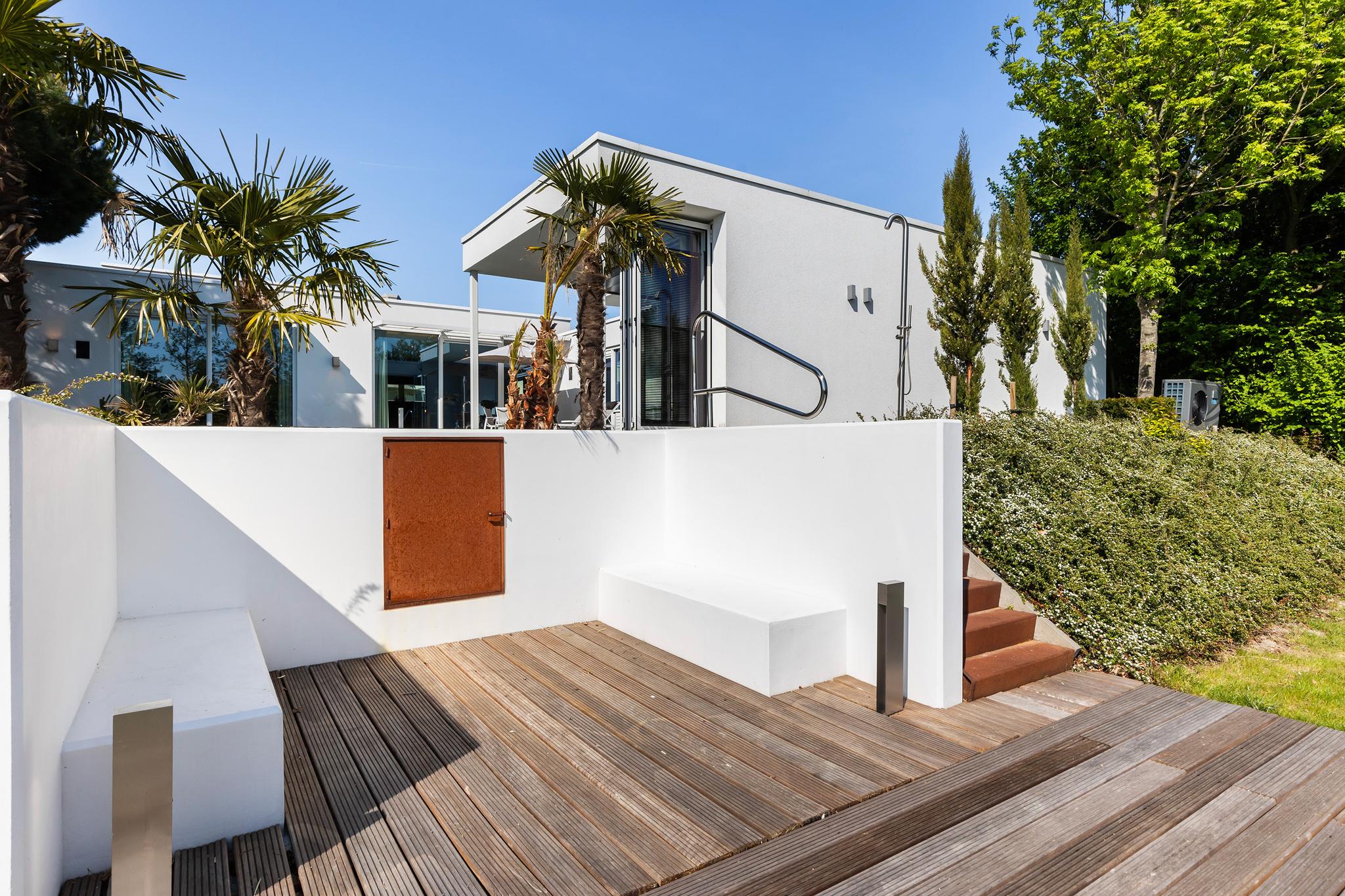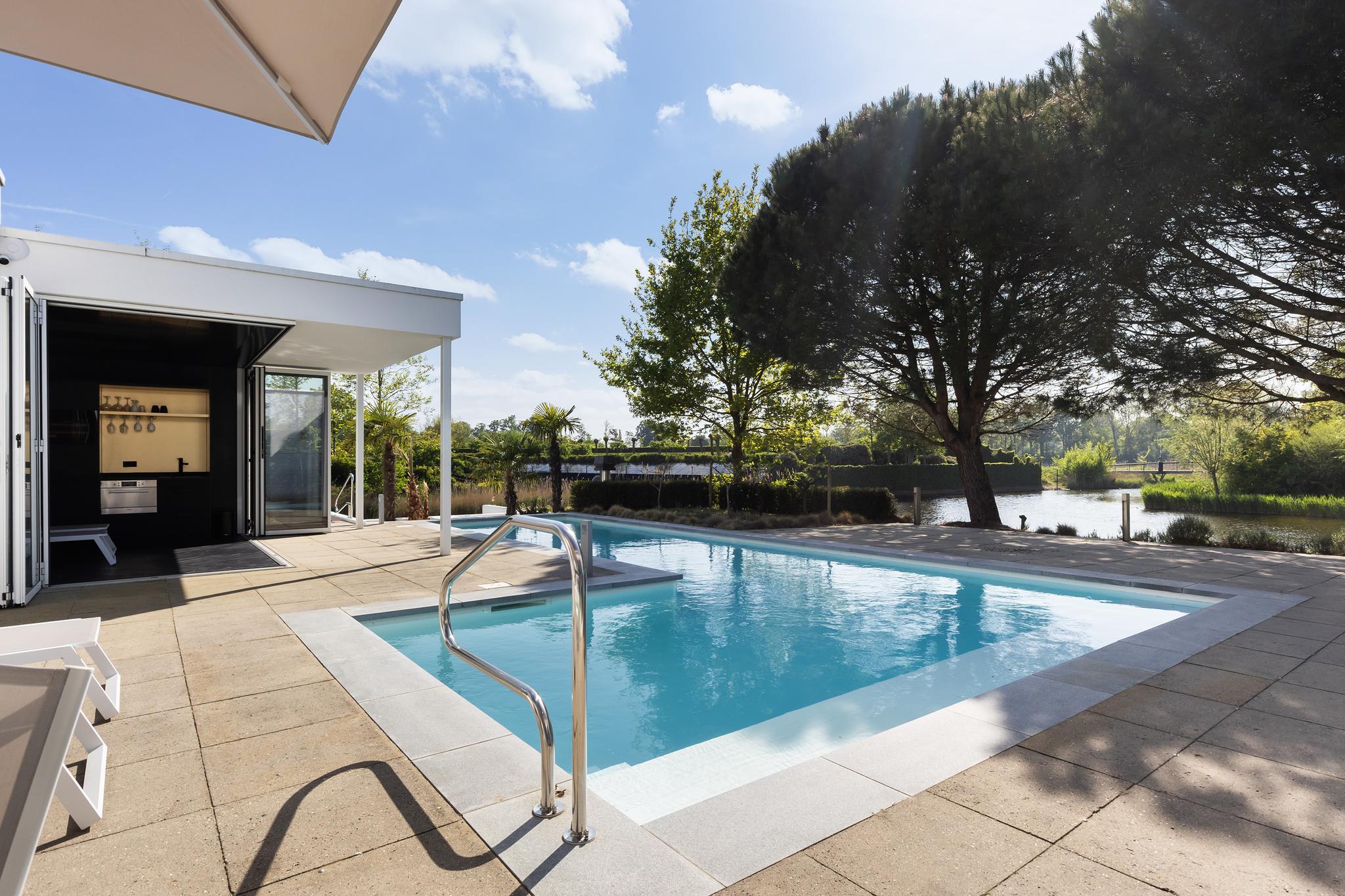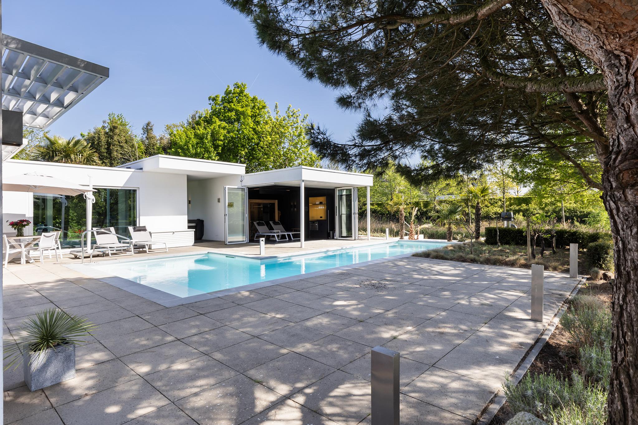 The spacious pool terrace easily accommodates sun loungers and lounge furniture. Carefully placed up- and downlights provide a warm and atmospheric ambiance after sunset.
