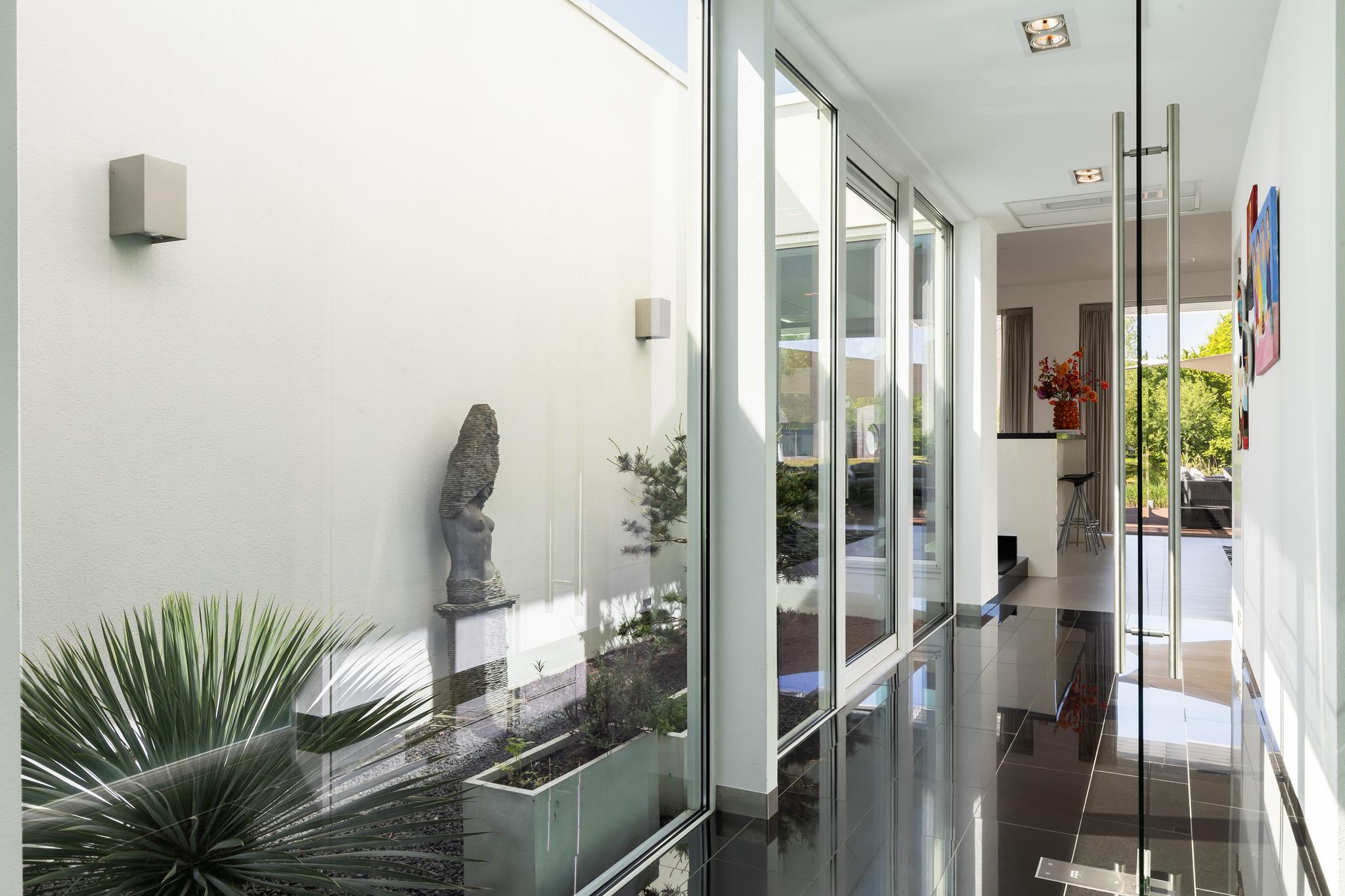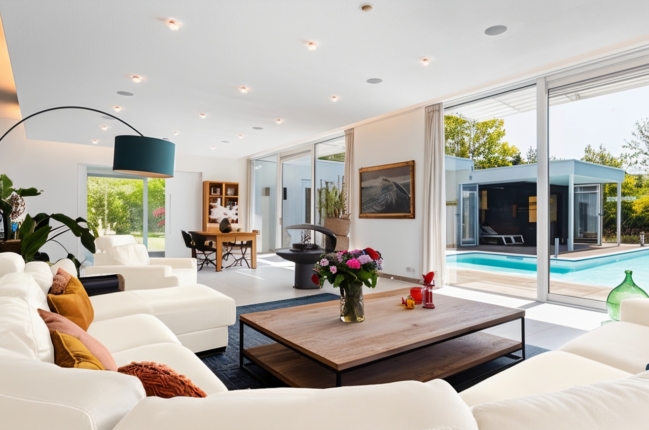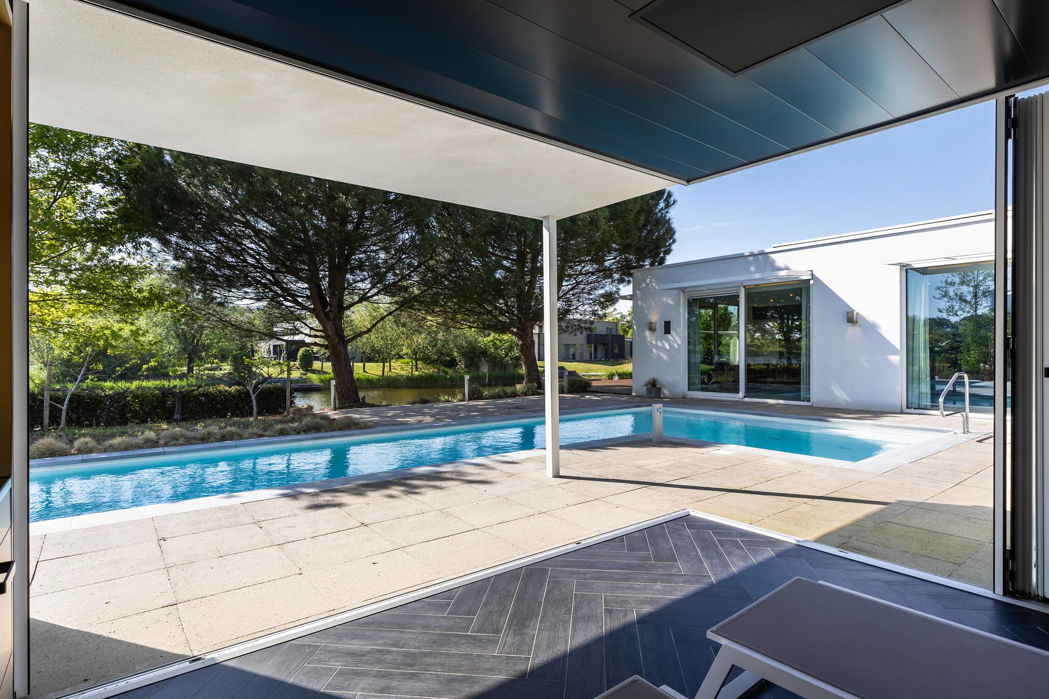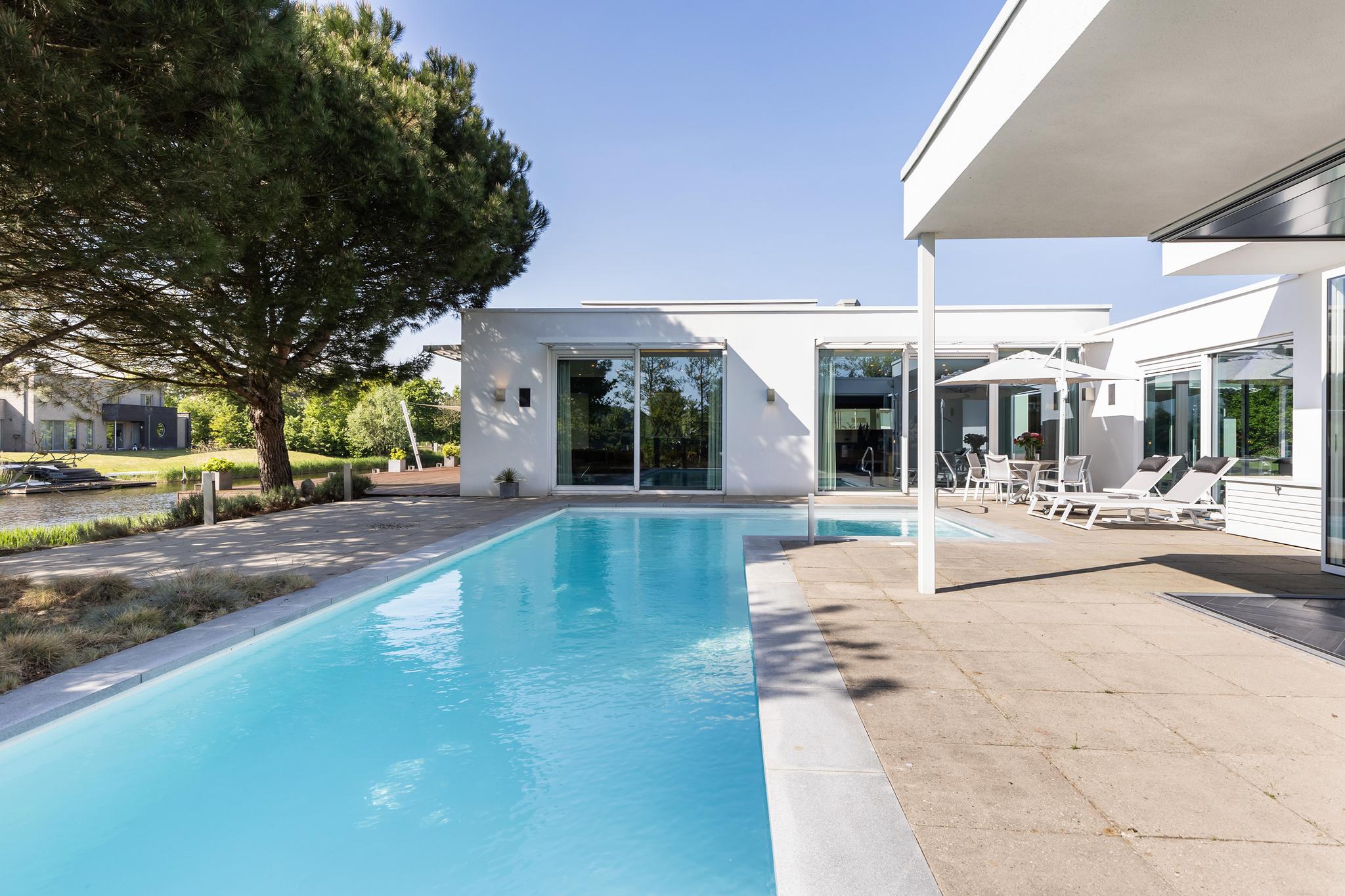 The spacious pool terrace easily accommodates sun loungers and lounge furniture. Carefully placed up- and downlights provide a warm and atmospheric ambiance after sunset.