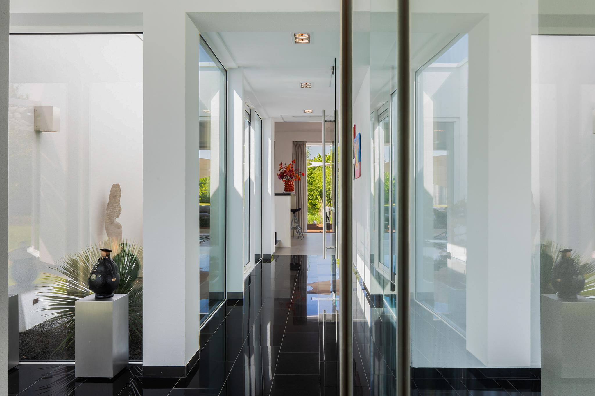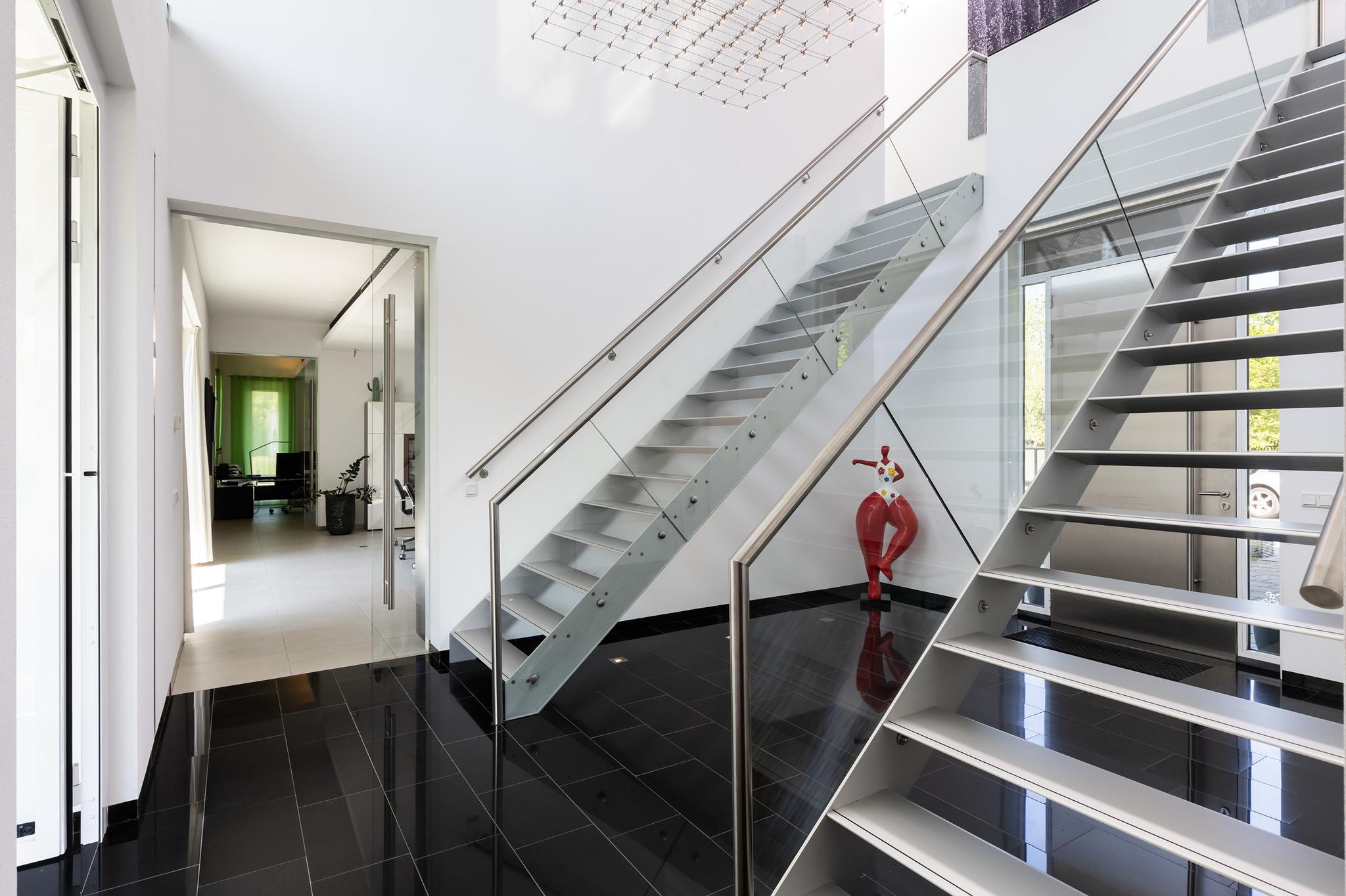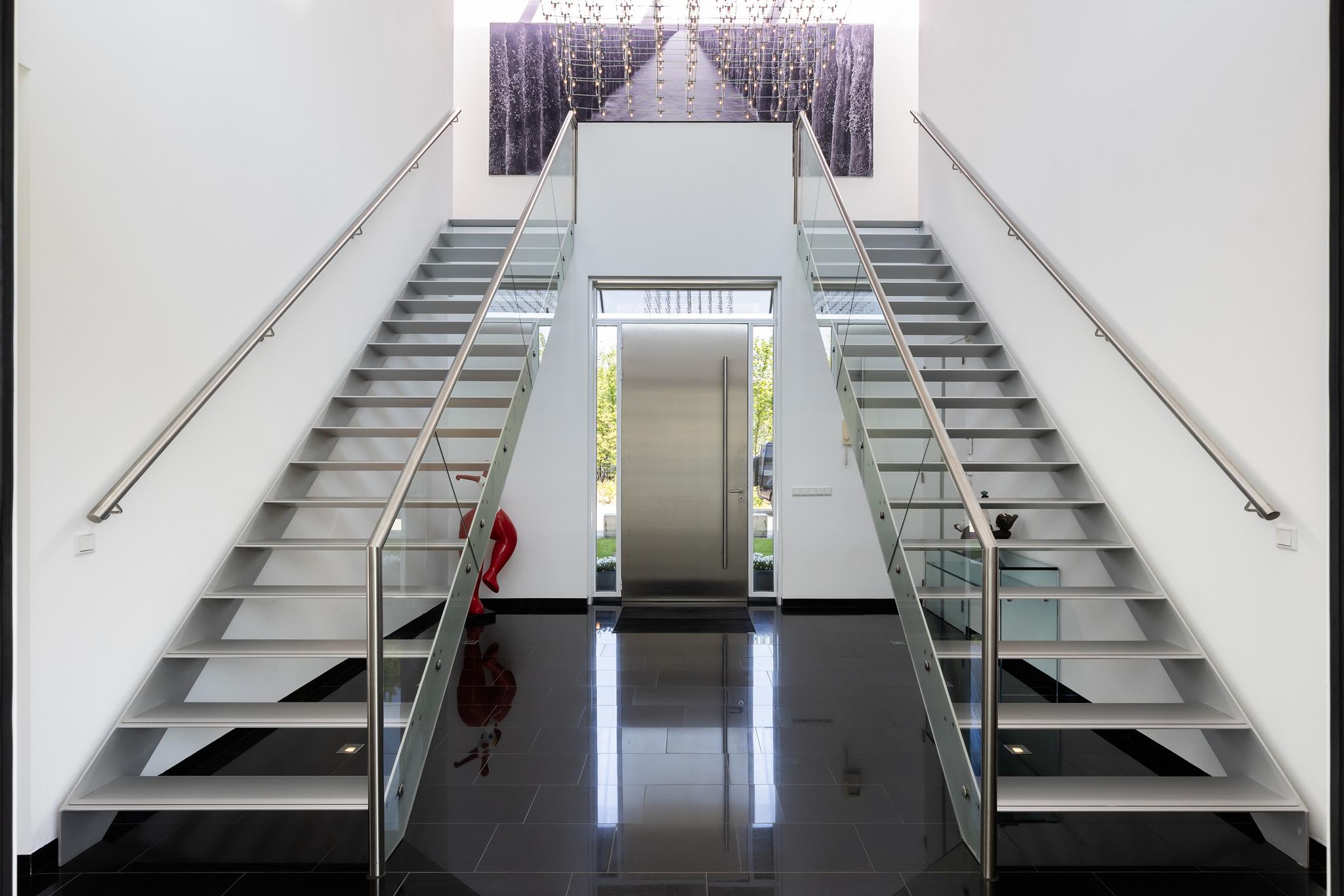 A grand stainless-steel front door opens to an impressive entrance hall with double-height ceiling and twin staircases, framed by glass balustrades. Hallways feature black granite floors, while the living areas are finished with large-format, sand-coloured tiles. Integrated lighting—via ceiling spots, floor lights and wall fittings—adds atmosphere and elegance.