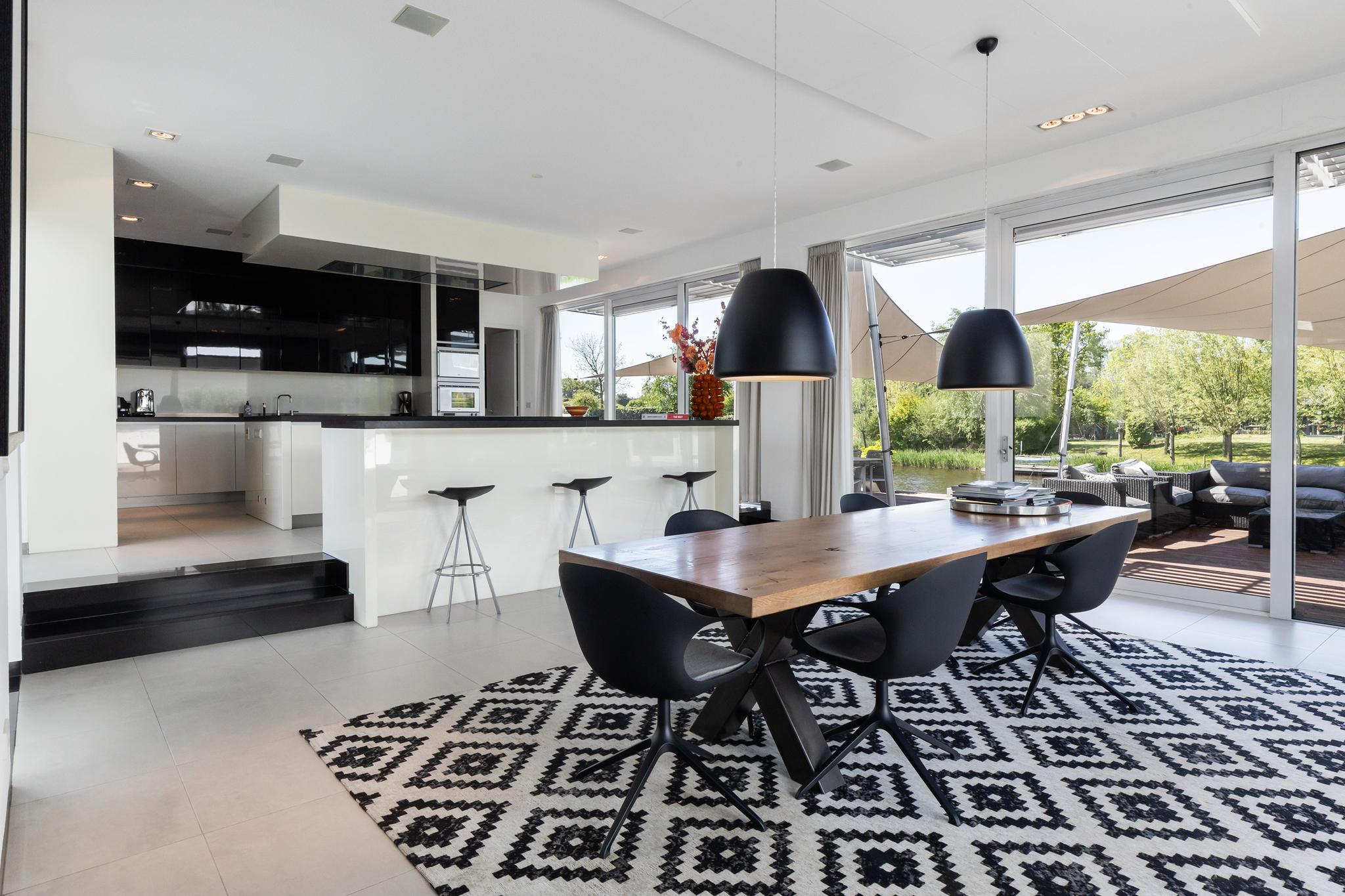 To the right lies the open-plan kitchen-diner, with three sliding doors leading to terraces beside the water. The bespoke kitchen comprises four sections with high-gloss white and black cabinetry, honed granite worktops and Gaggenau appliances: twin hobs with extractor, ovens, fridges, freezers, wine coolers, warming drawer and dishwasher. A large dining table for ten and a modern gas fire complete the space, where natural light and outdoor views take centre stage.