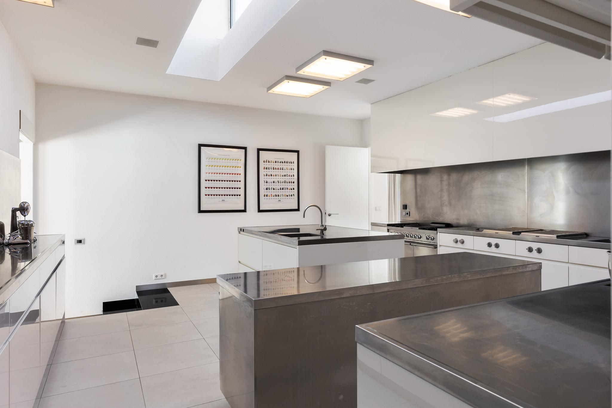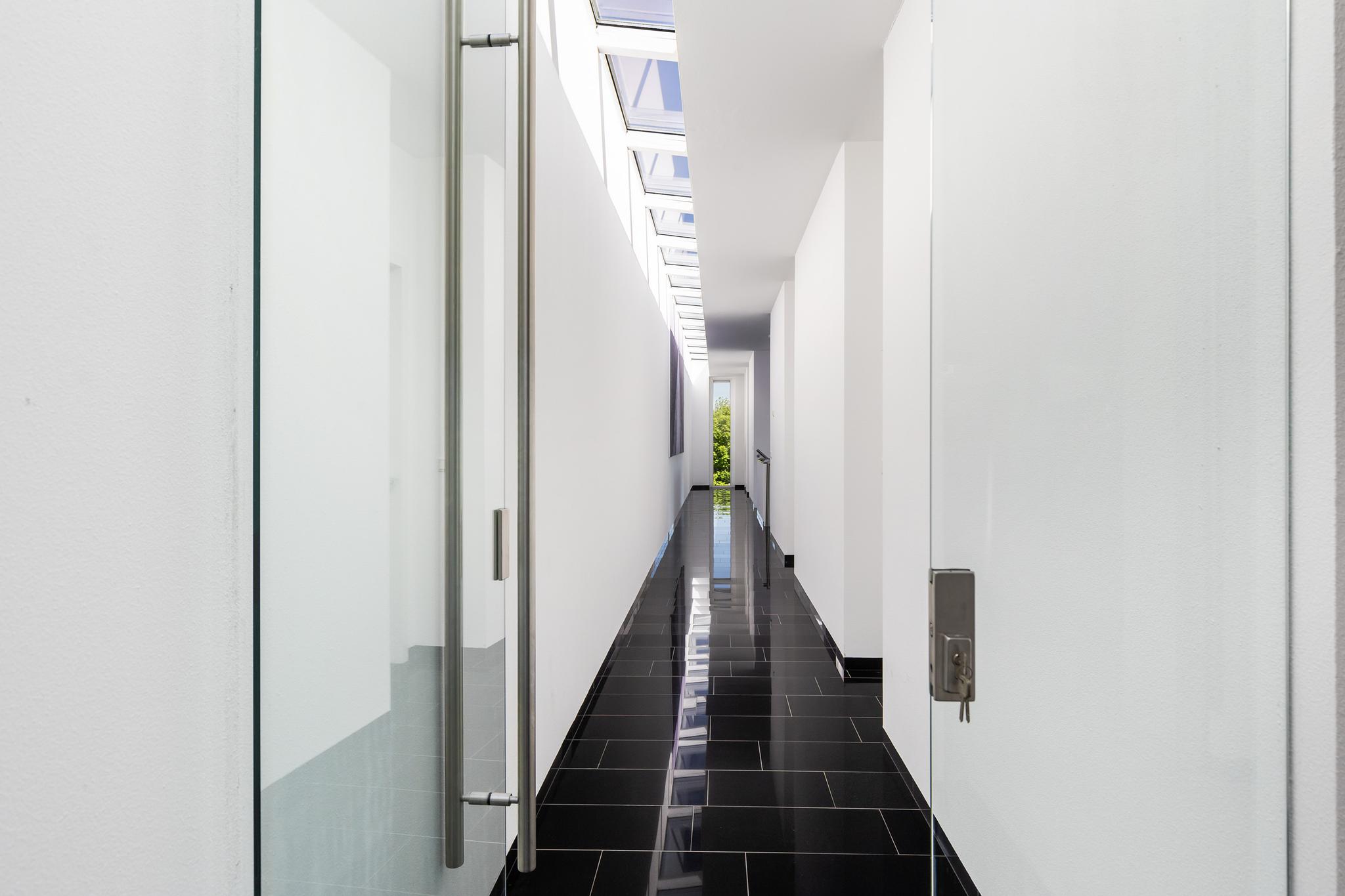 To the front of the property is a generous home office with two desks and built-in storage, leading to a spacious meeting room with a cosy gas fire, tall windows and sliding doors opening onto a secluded terrace with olive trees. A sliding door connects this space to the main hallway, making it easy to maintain a balance between professional and private life without compromising on style.